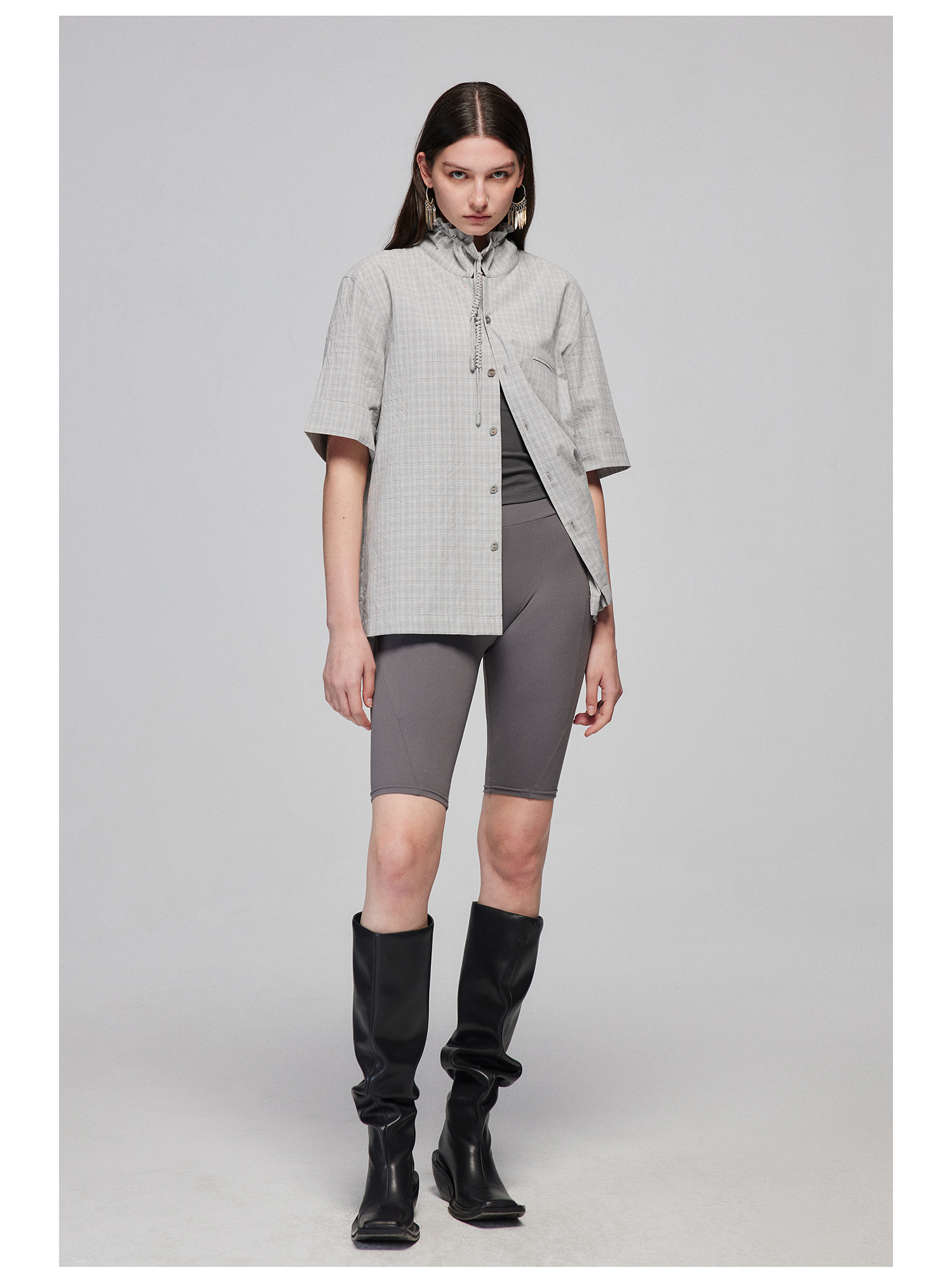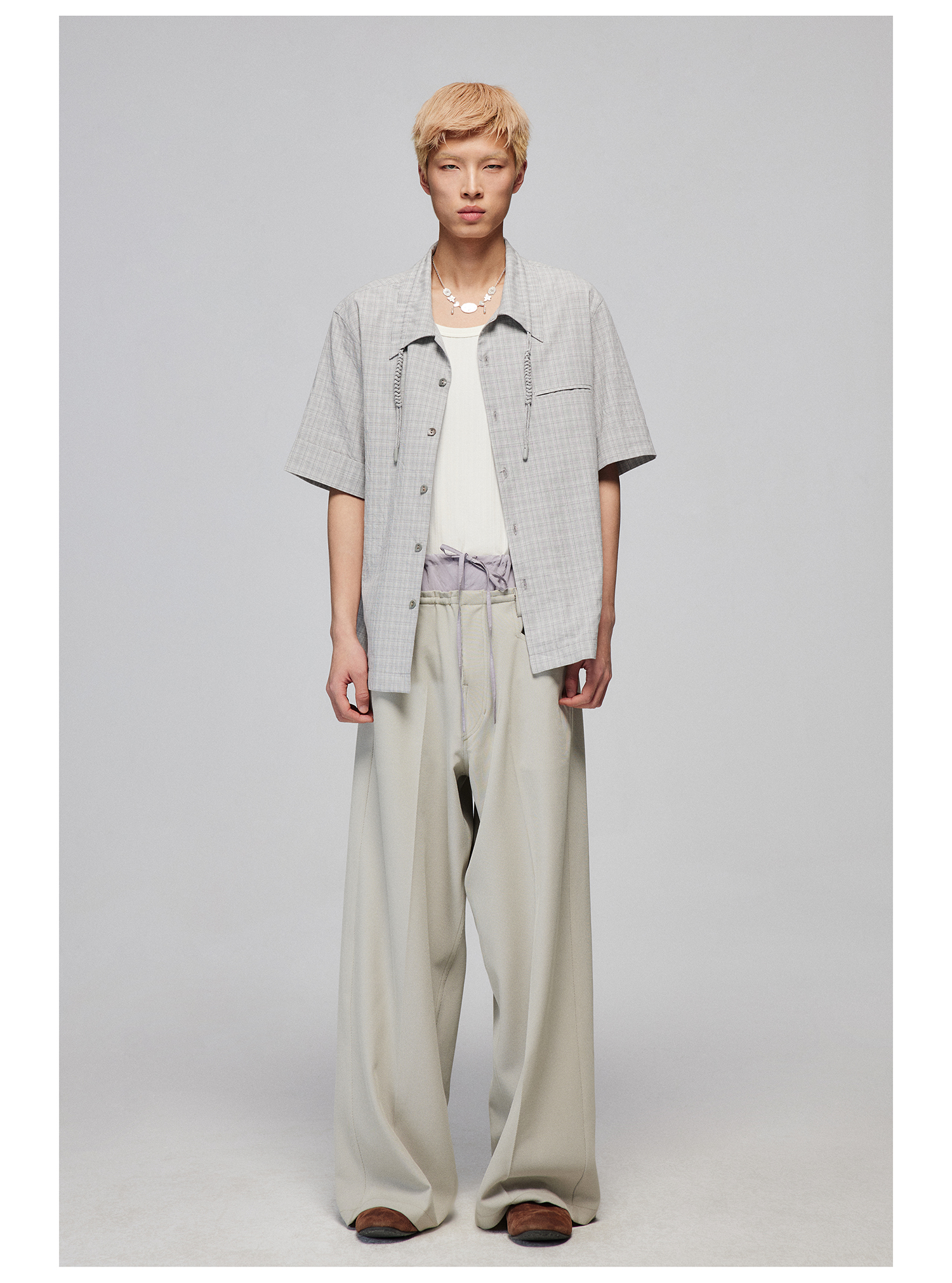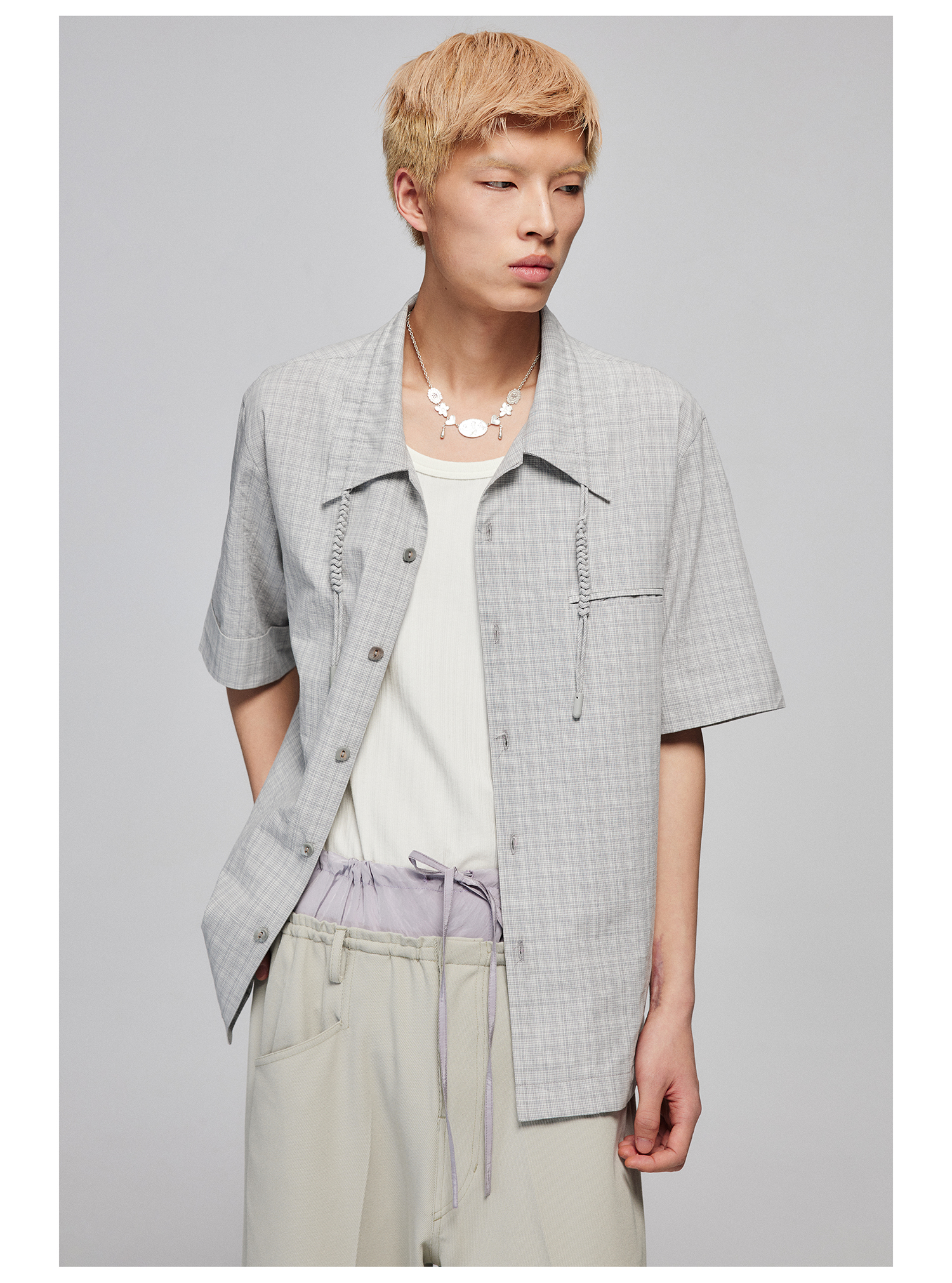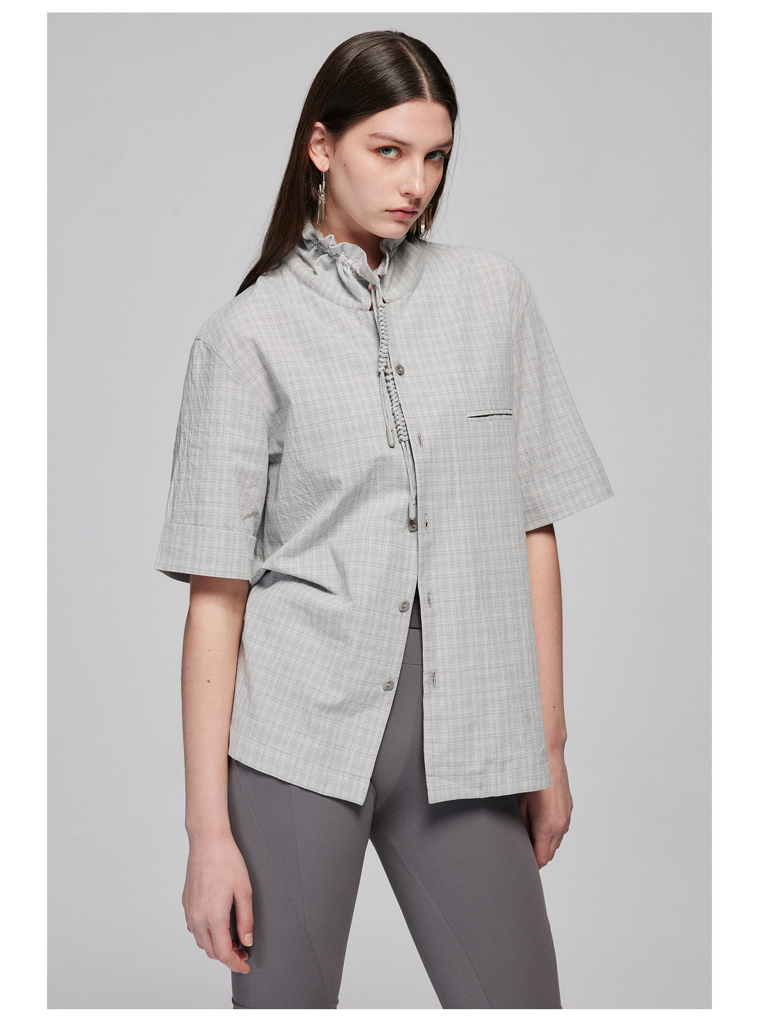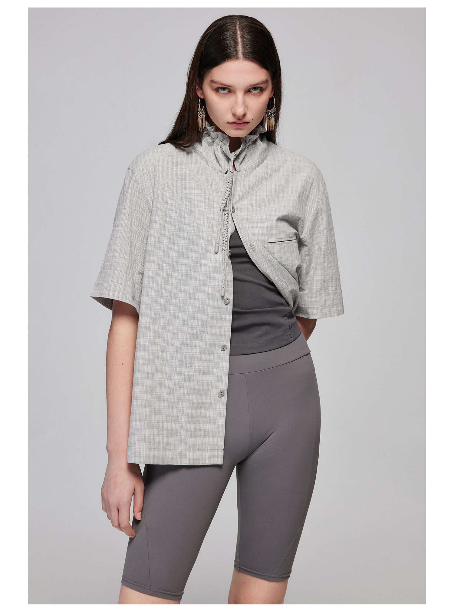 Simple Project/Y2487/纯棉格纹领子抽绳宽松古巴领短袖衬衫