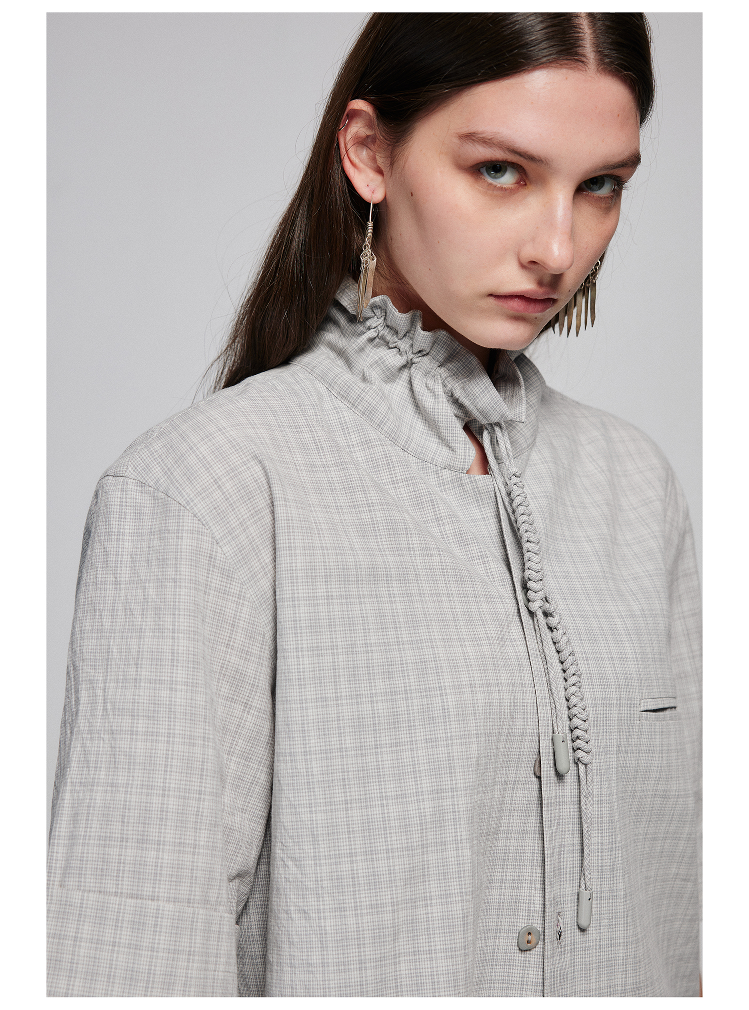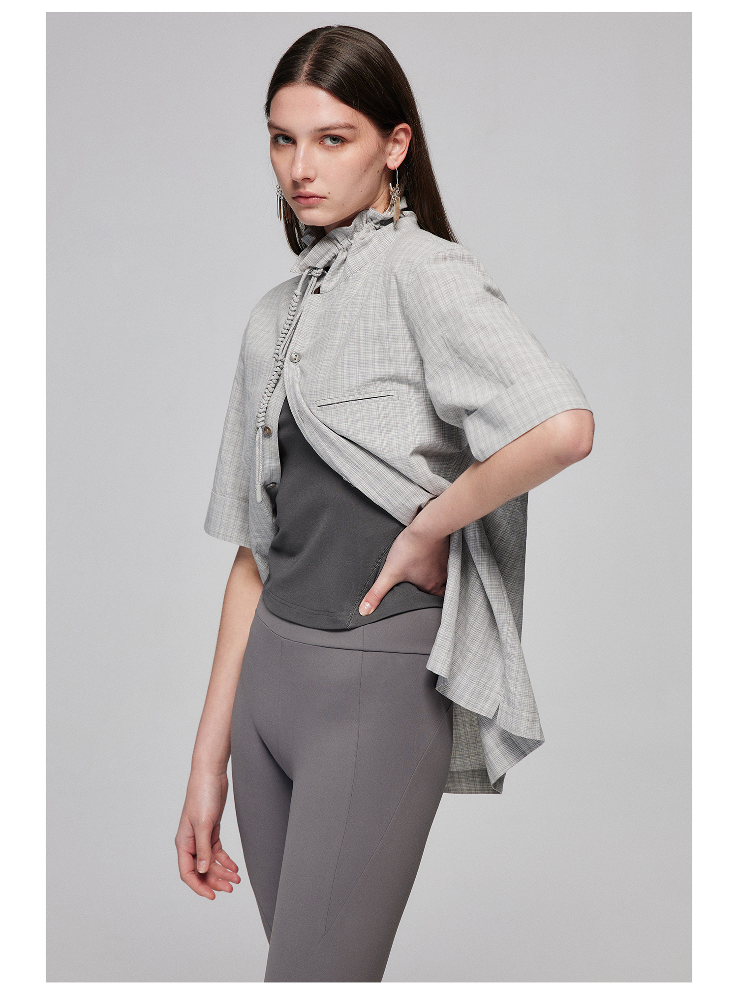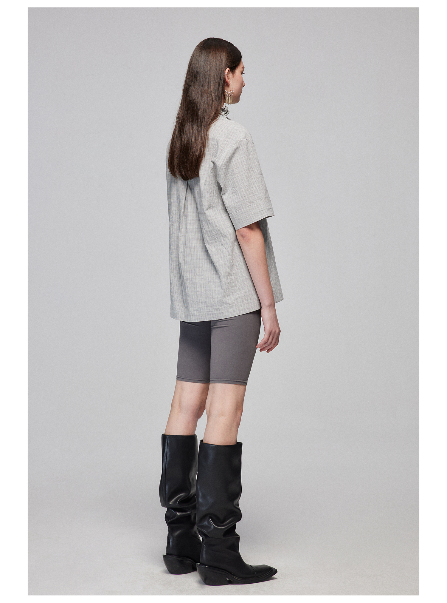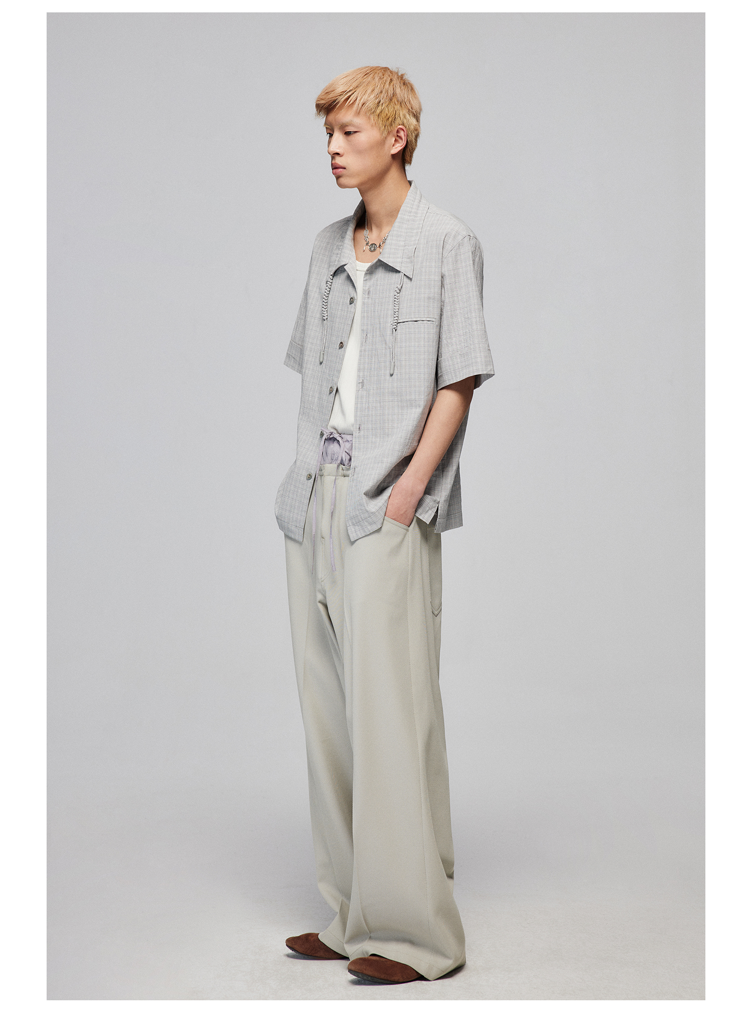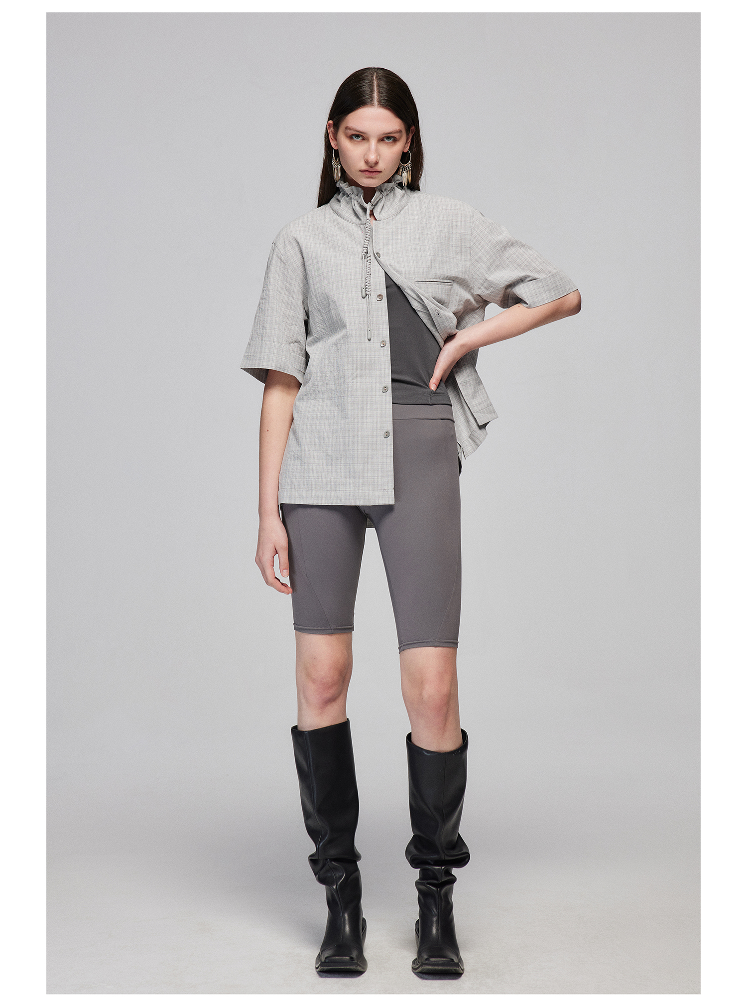 Simple Project/Y2487/纯棉格纹领子抽绳宽松古巴领短袖衬衫