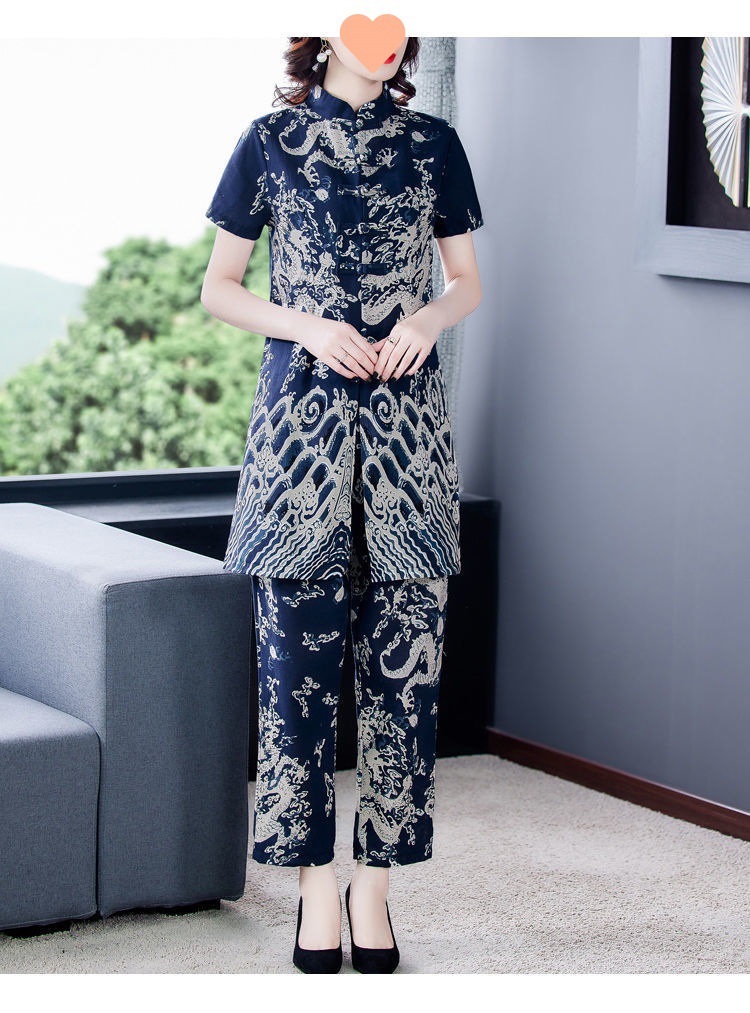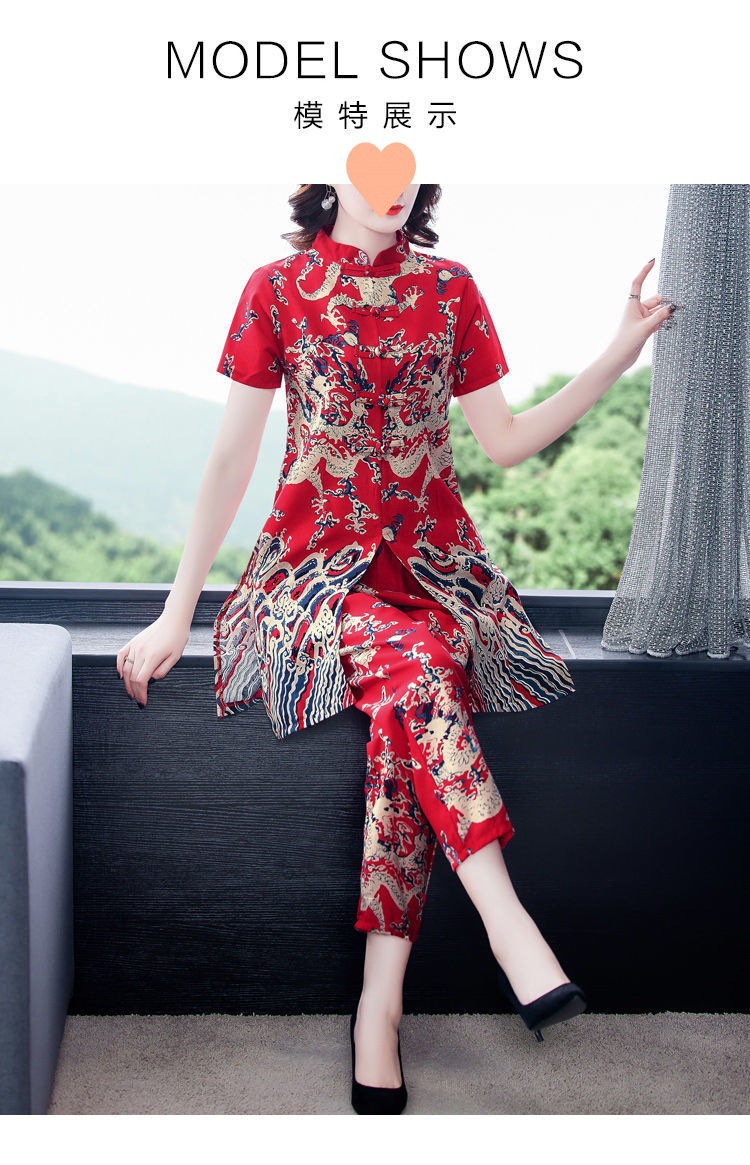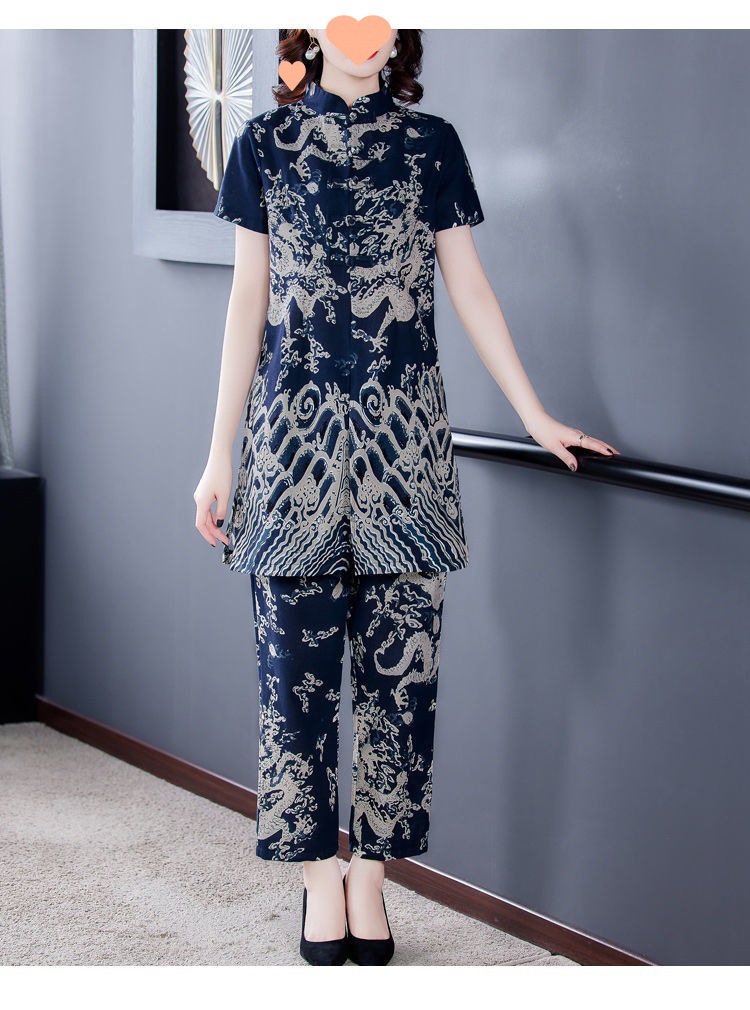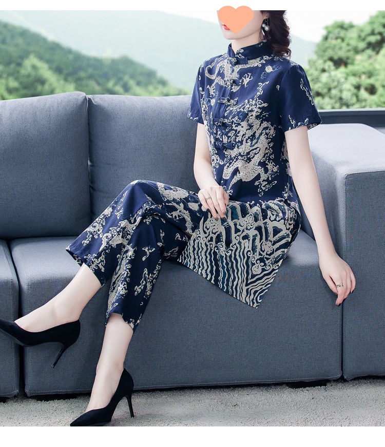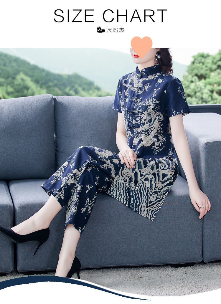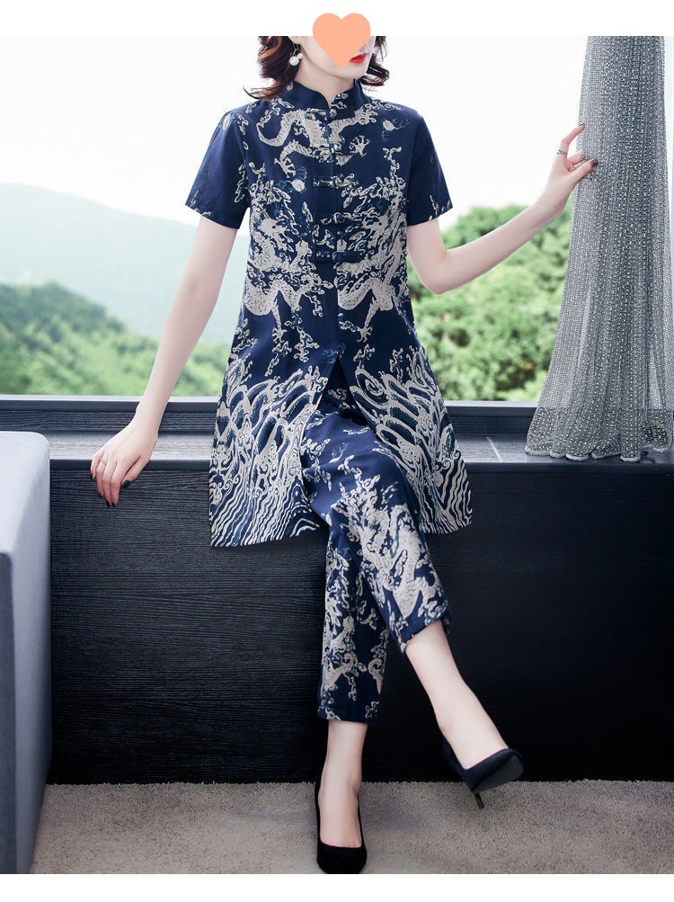 夏季新款民族风棉麻时尚休闲套装洋气唐装休闲裤妈妈旗袍两件套DD