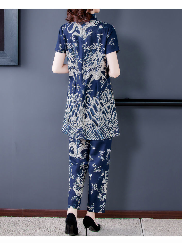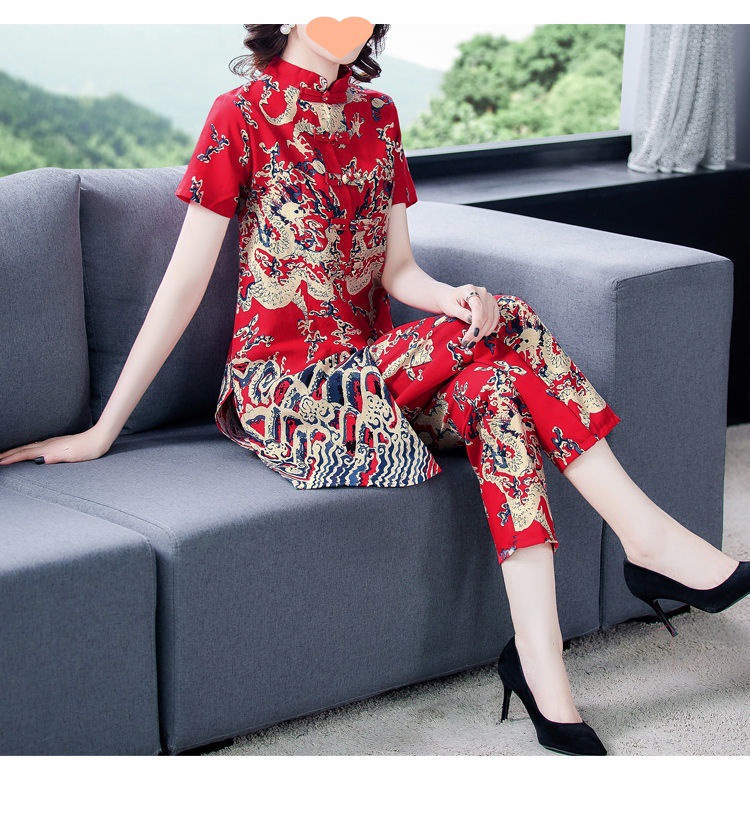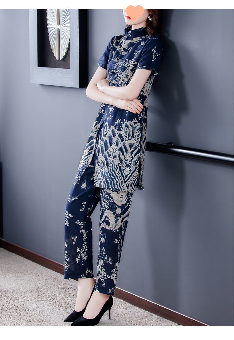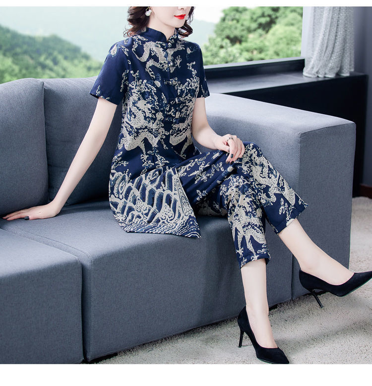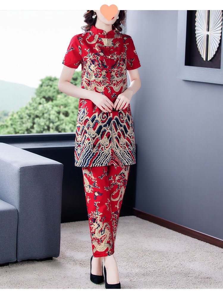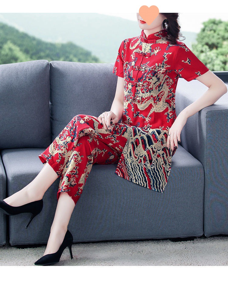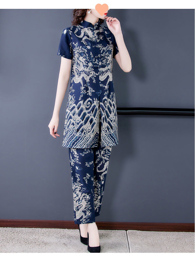 夏季新款民族风棉麻时尚休闲套装洋气唐装休闲裤妈妈旗袍两件套DD