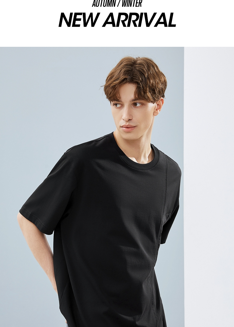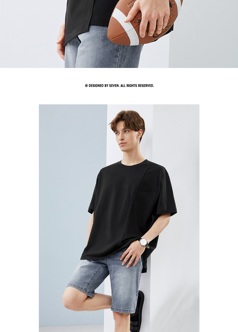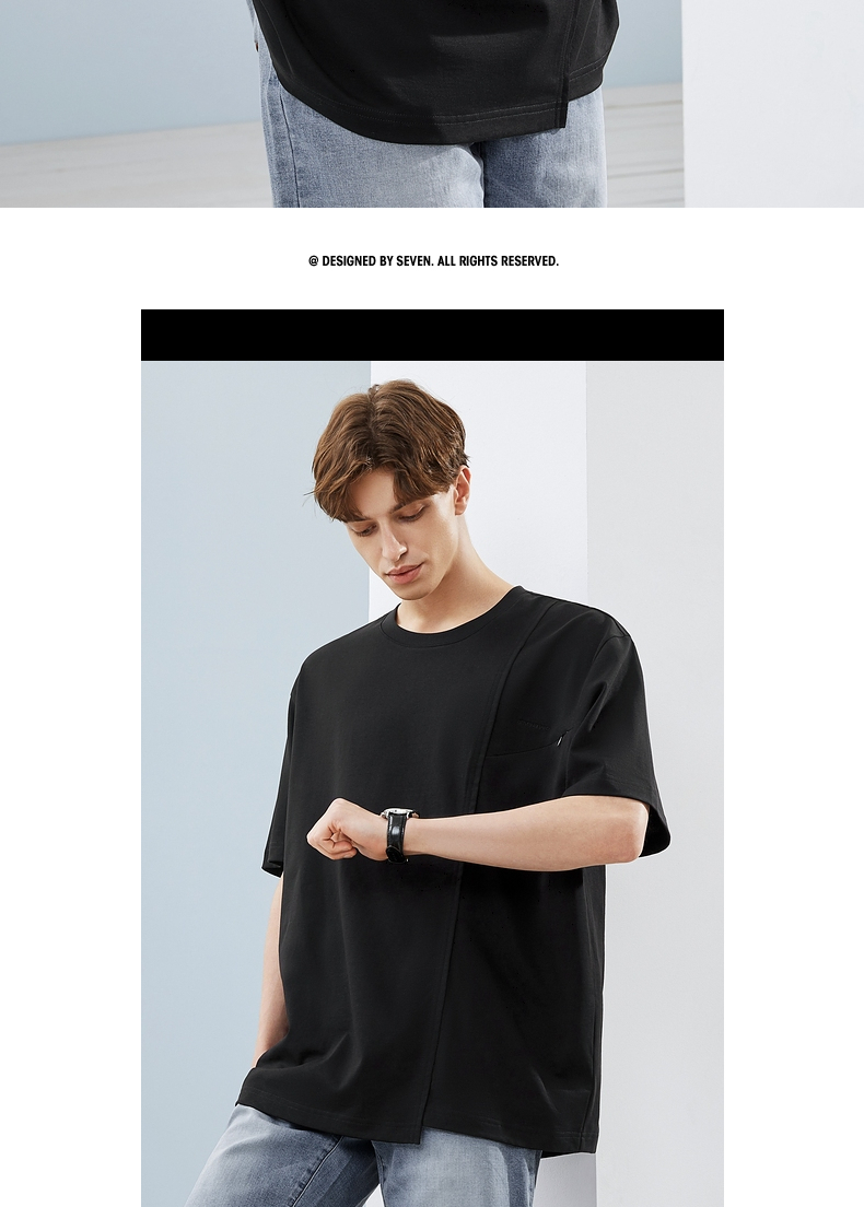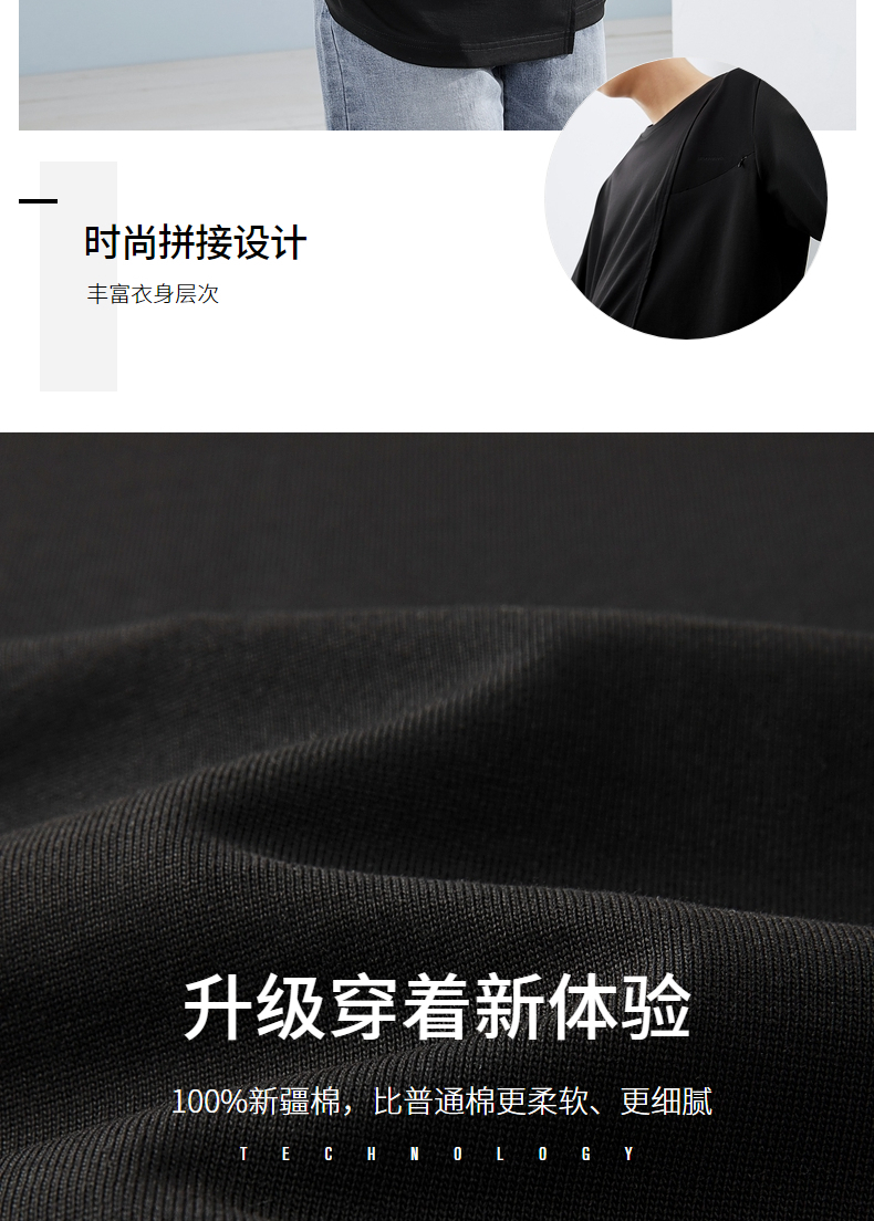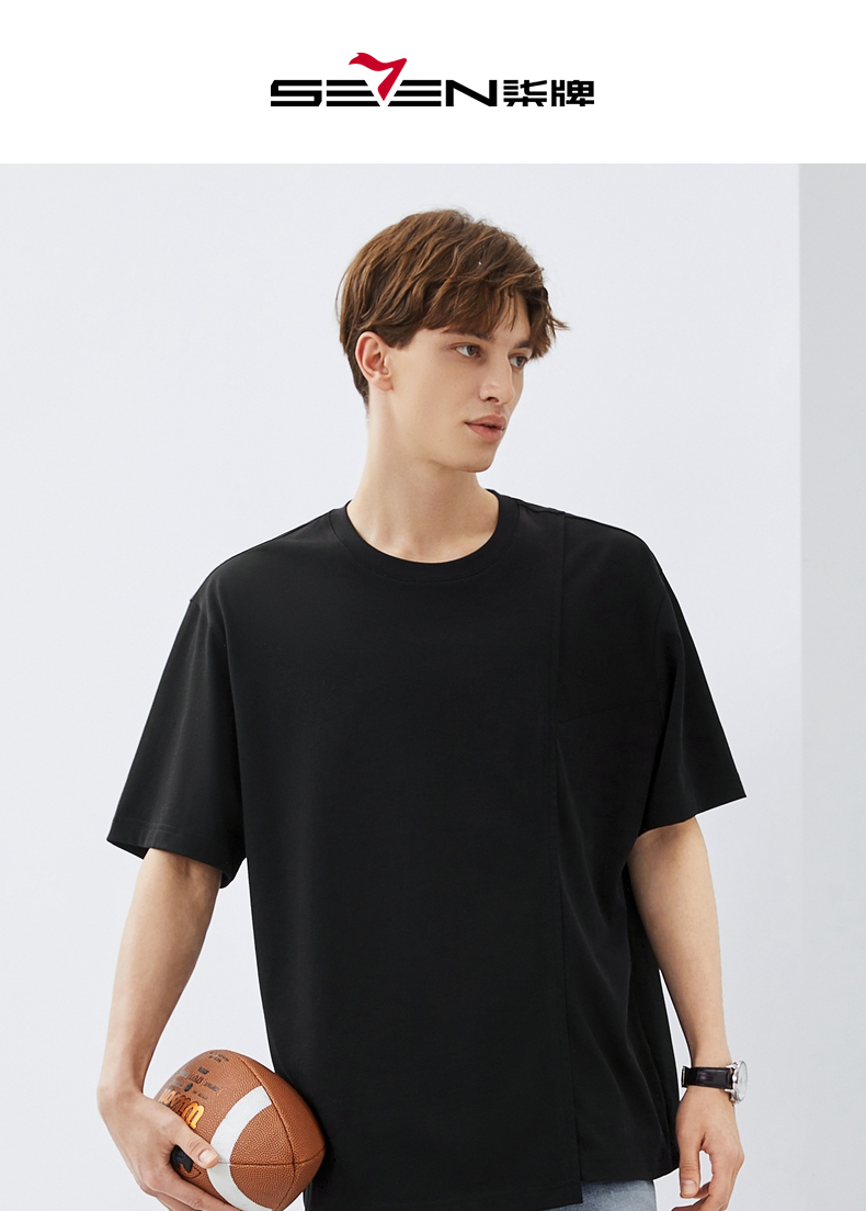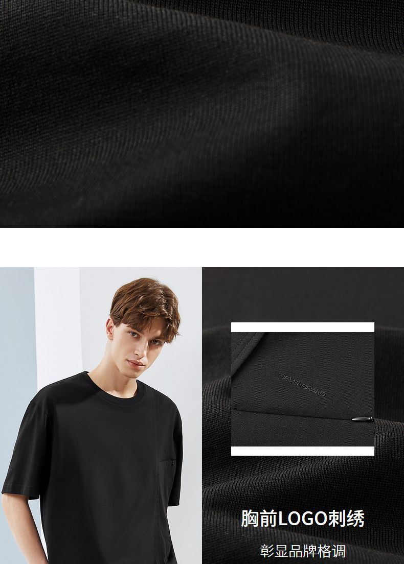 【100%新疆棉】柒牌短袖T恤男夏季新款时尚潮流拼接黑色圆领上衣 124T71490