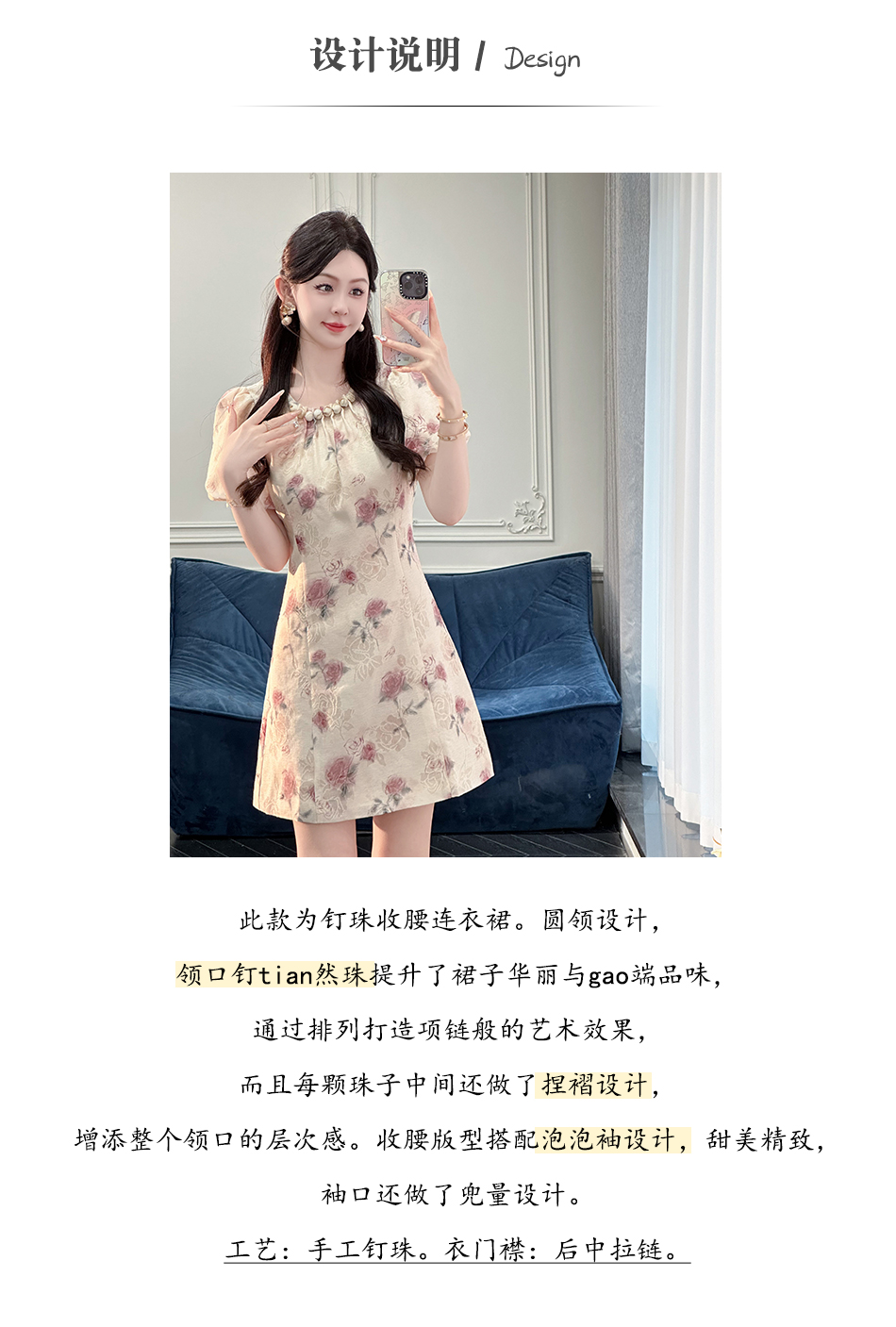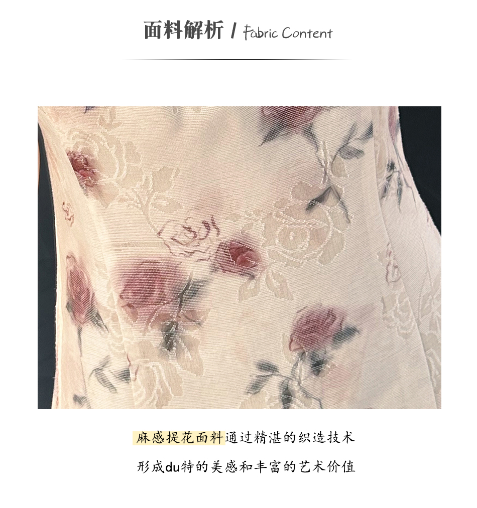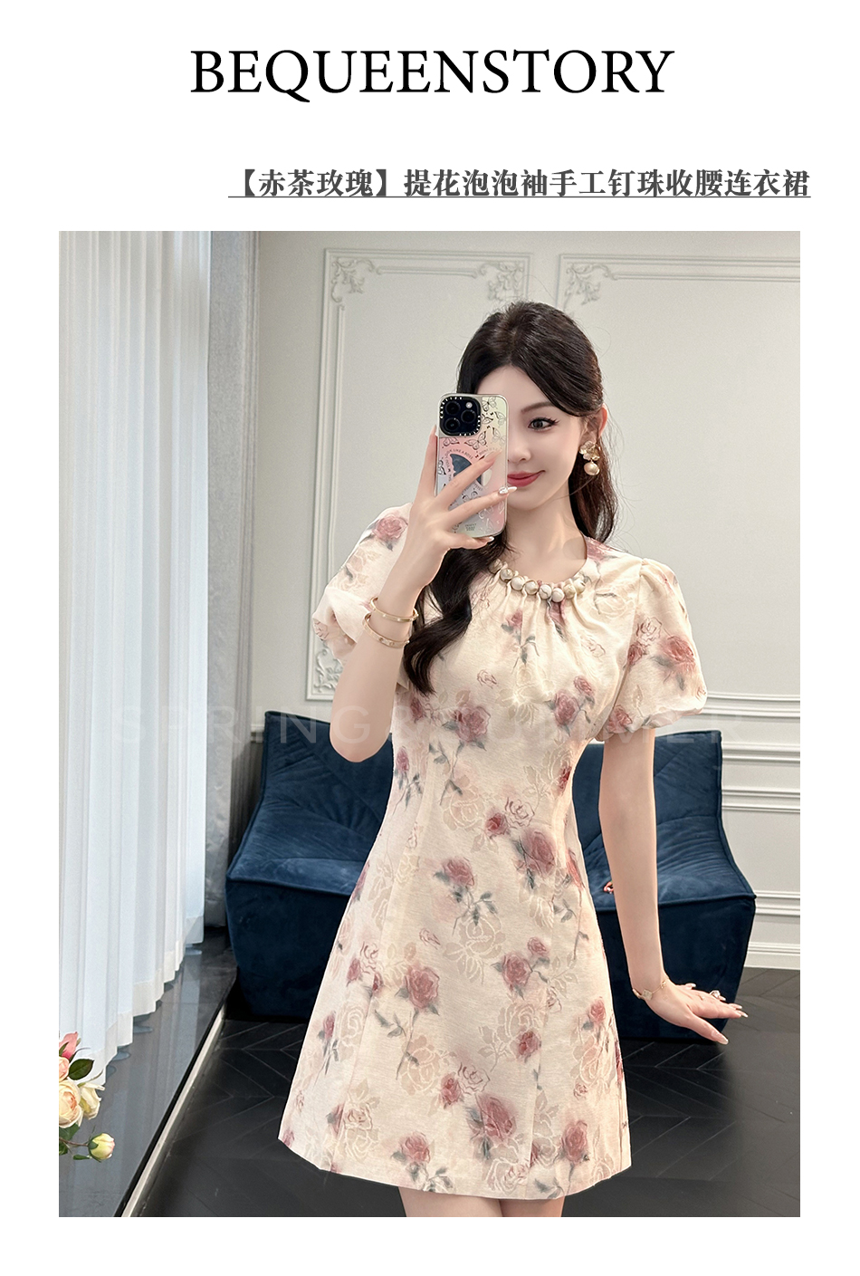 BeQueenStory【赤茶玫瑰】气质麻感提花泡泡袖手工钉珠收腰连衣裙