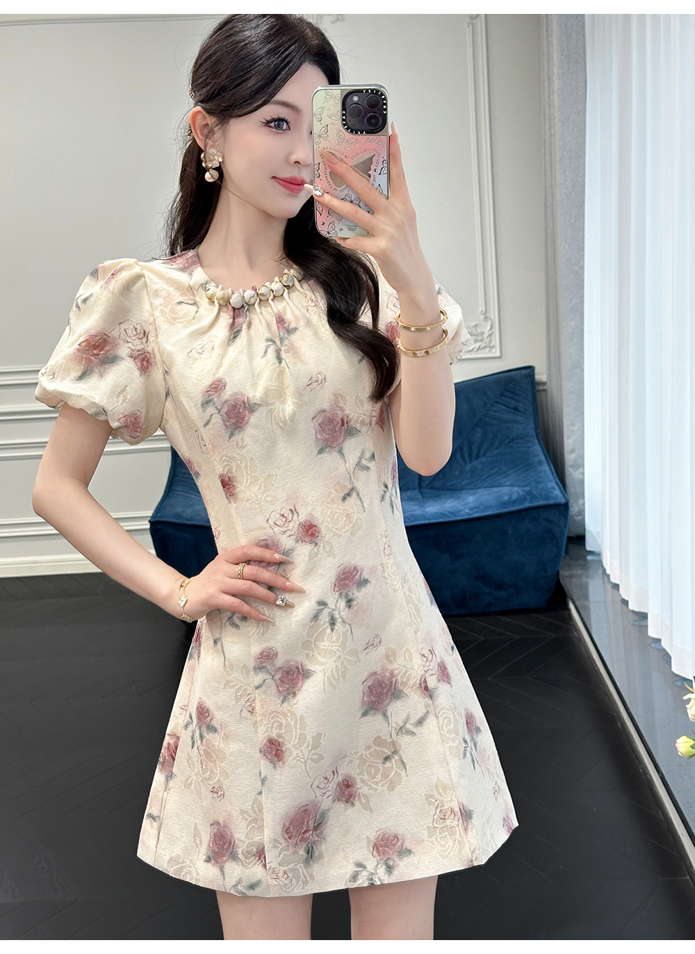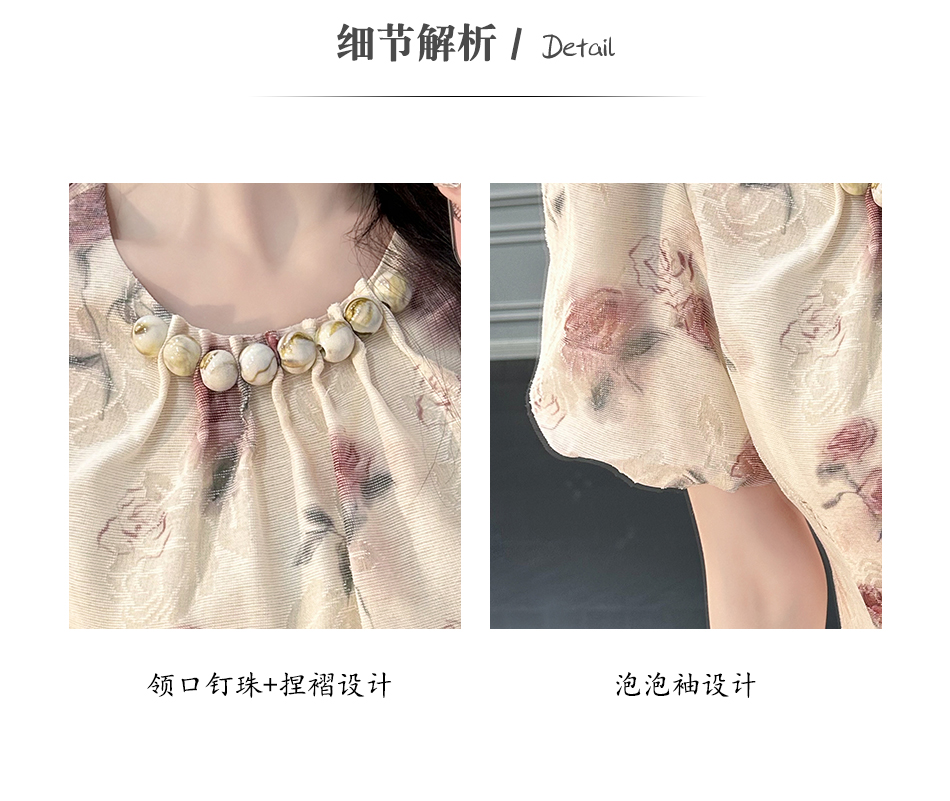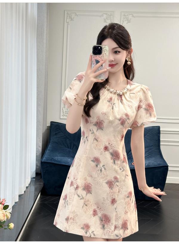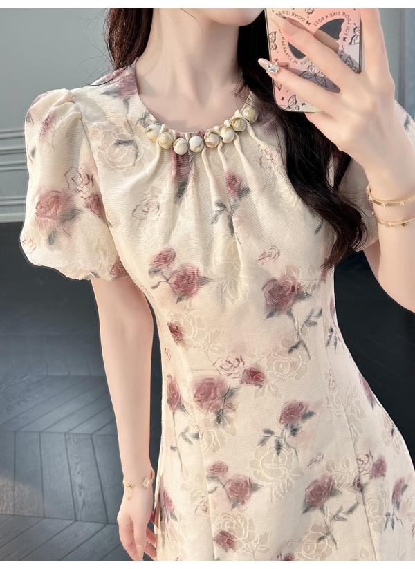 BeQueenStory【赤茶玫瑰】气质麻感提花泡泡袖手工钉珠收腰连衣裙
