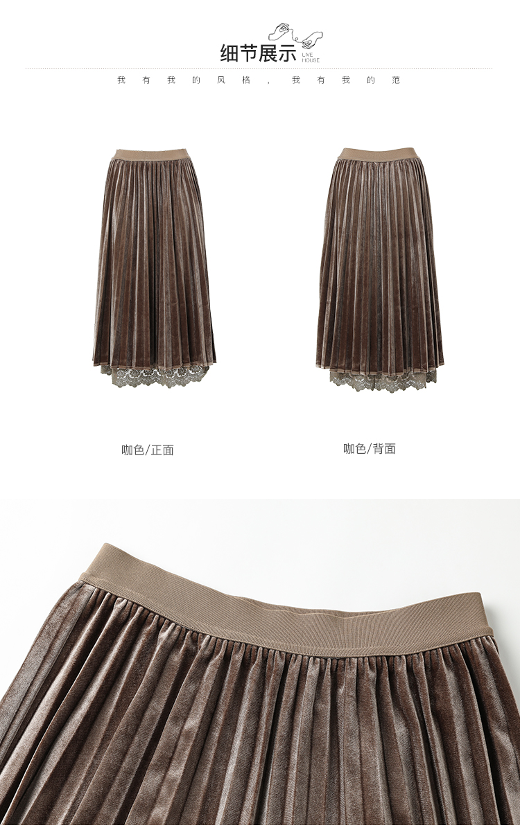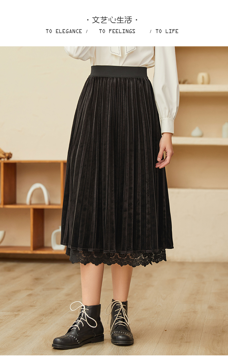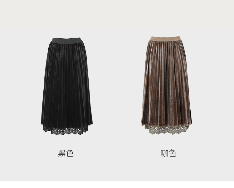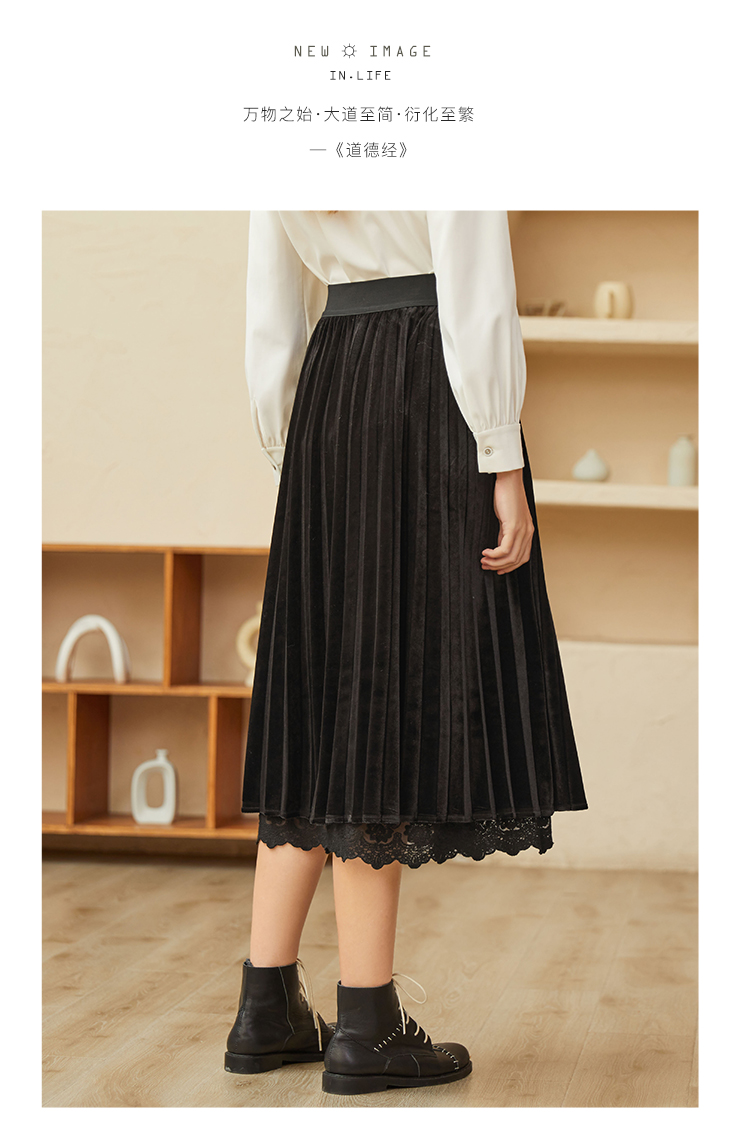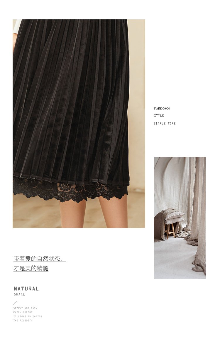 Famecoco范可儿原创丝绒蕾丝拼接半身裙女秋冬宽松百褶裙F228HA025