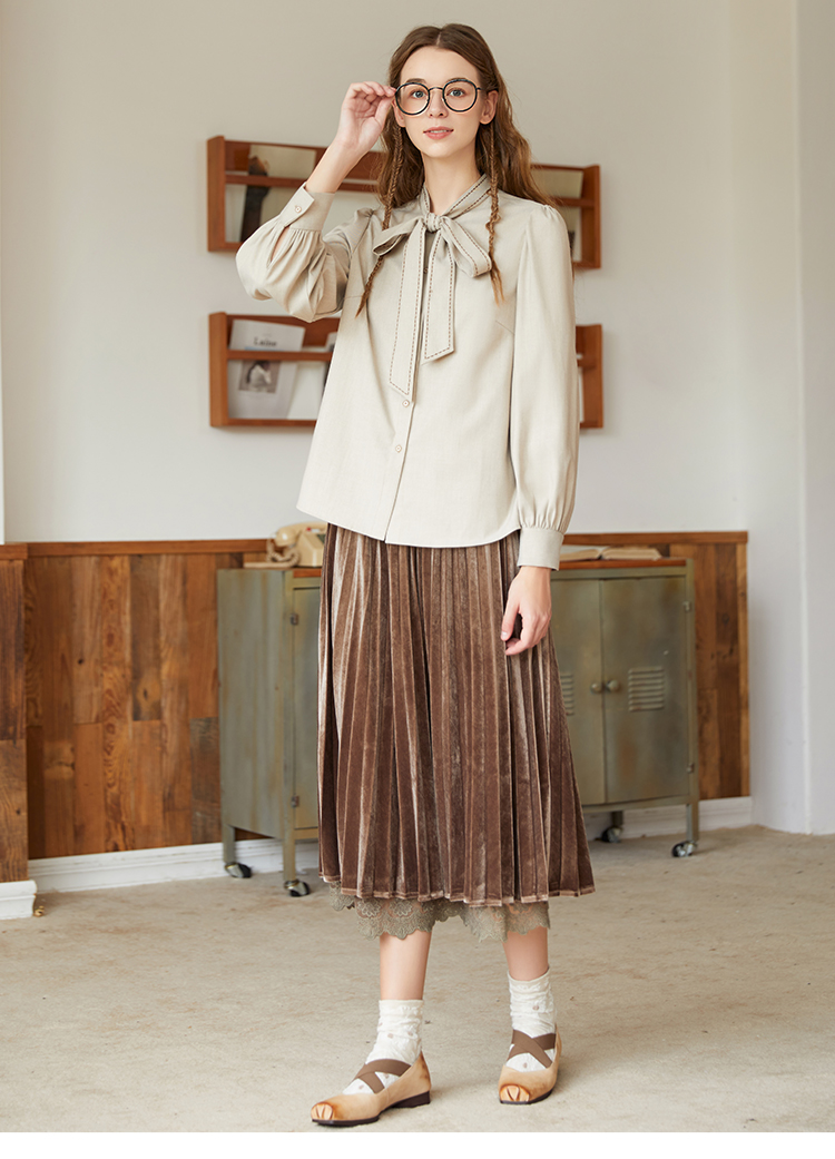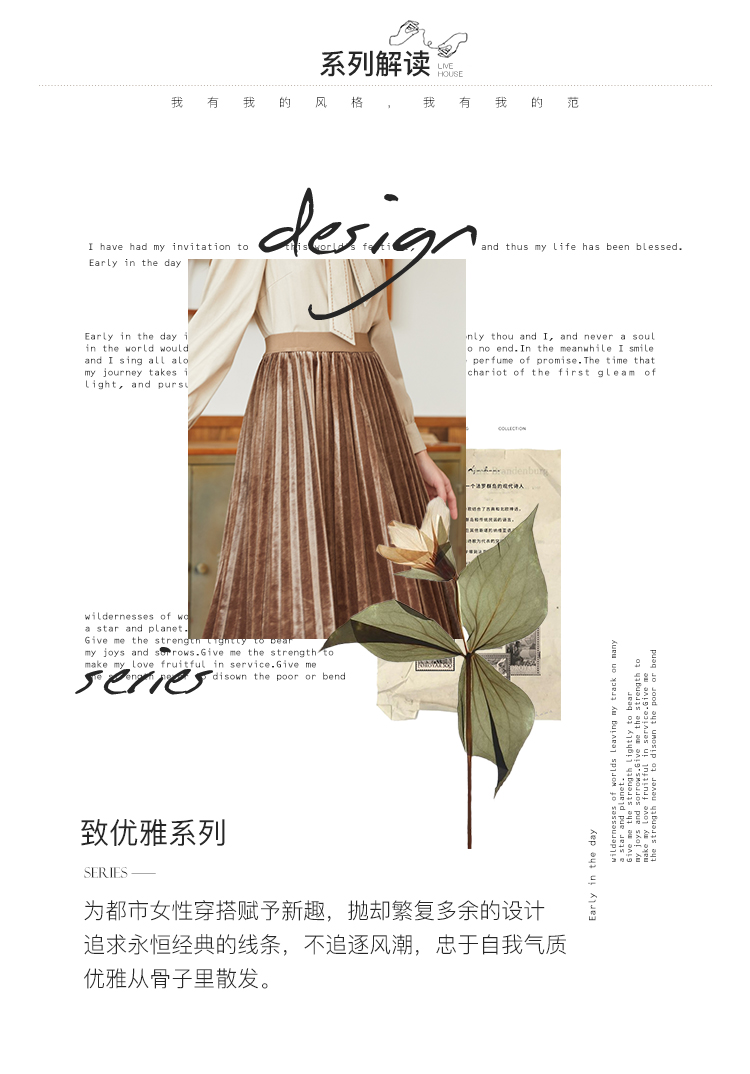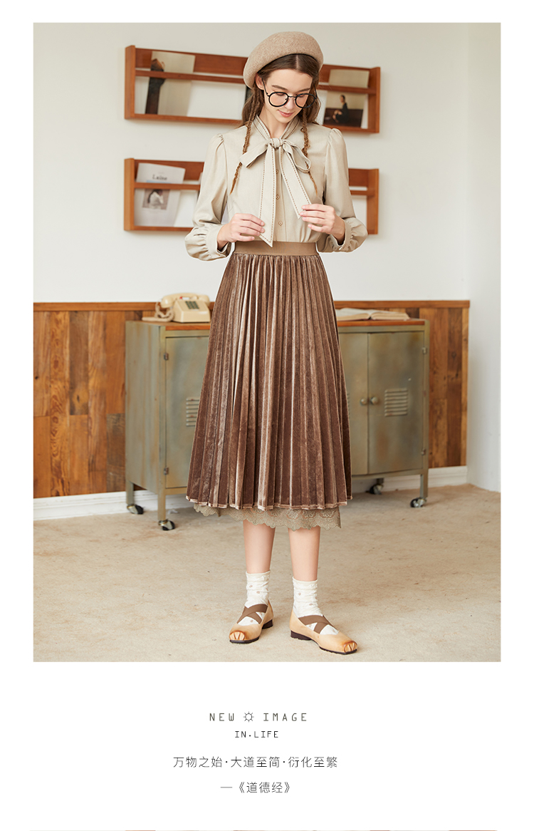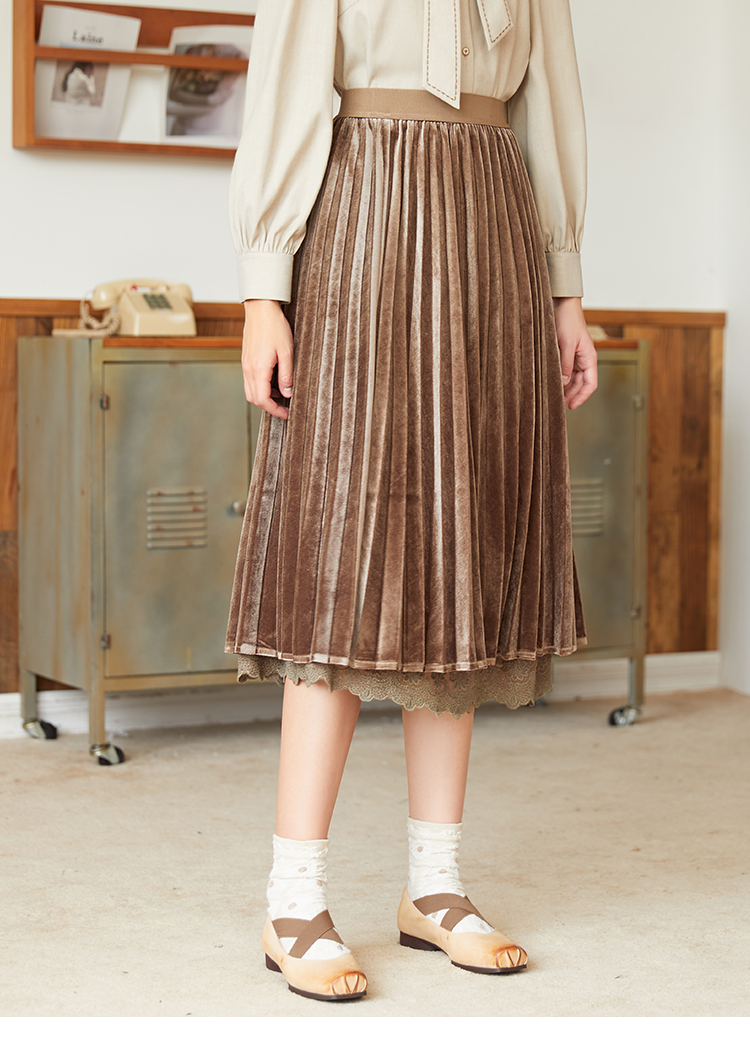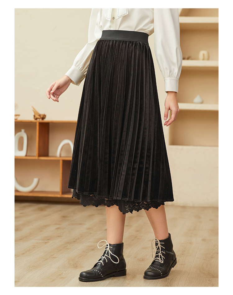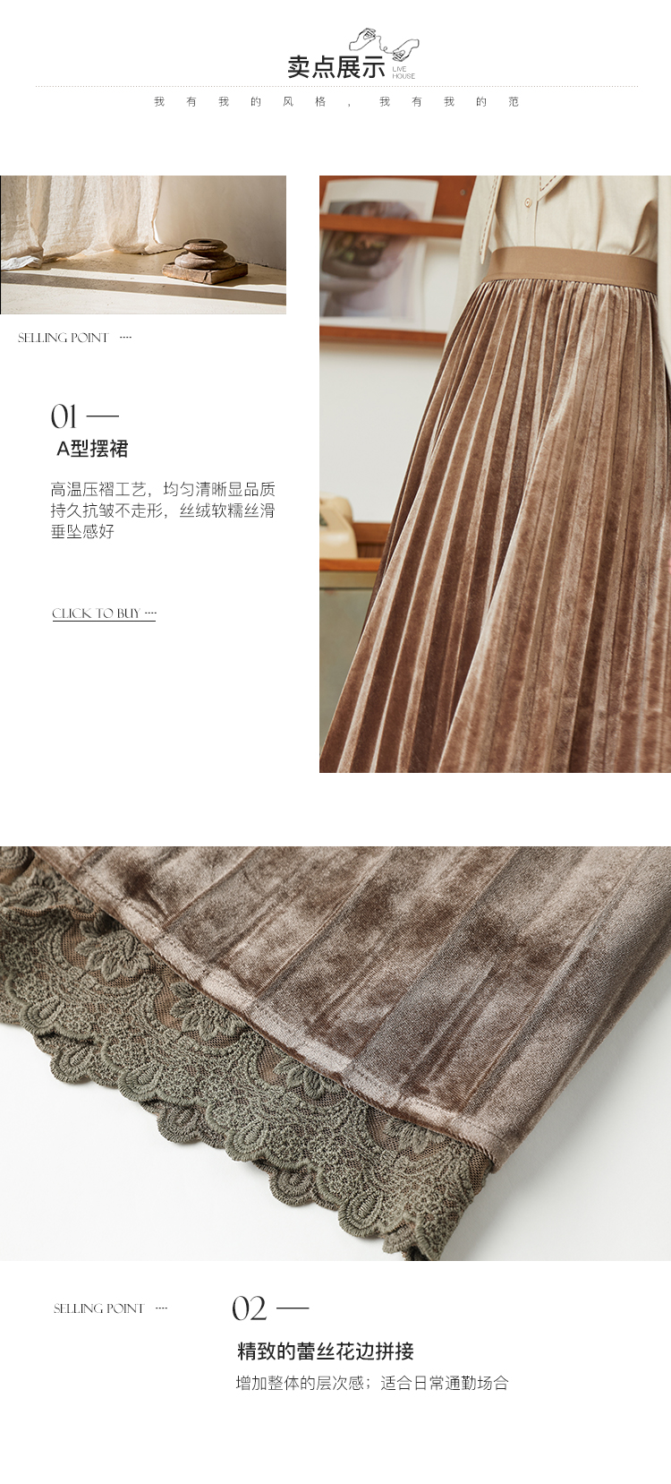 Famecoco范可儿原创丝绒蕾丝拼接半身裙女秋冬宽松百褶裙F228HA025