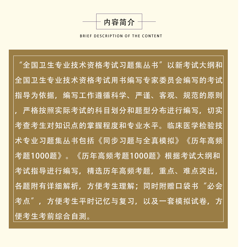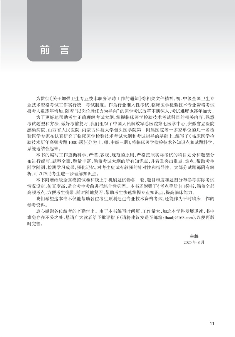 “全国卫生专业技术资格考试习题集丛书”以新考试大纲和全国卫生专业技术资格考试用书编写专家委员会编写的考试指导为依据,编写工作遵循科学、严谨、客观、规范的原则,严格按照实际考试的科目划分和题型分布进行编写,切实考查考生对知识点的掌握程度和专业水平。临床医学检验技术专业习题集丛书包括《同步习题与全真模拟》《历年高频考题1000题》。《历年高频考题1000题》根据考试大纲和考试指导进行编写,精选历年高频考题,重点、难点突出,各题附有详细解析,方便考生理解;同时附赠口袋书“必会考点”,方便考生平时记忆与复习,以及一套模拟试卷,方便考生考前综合自测。