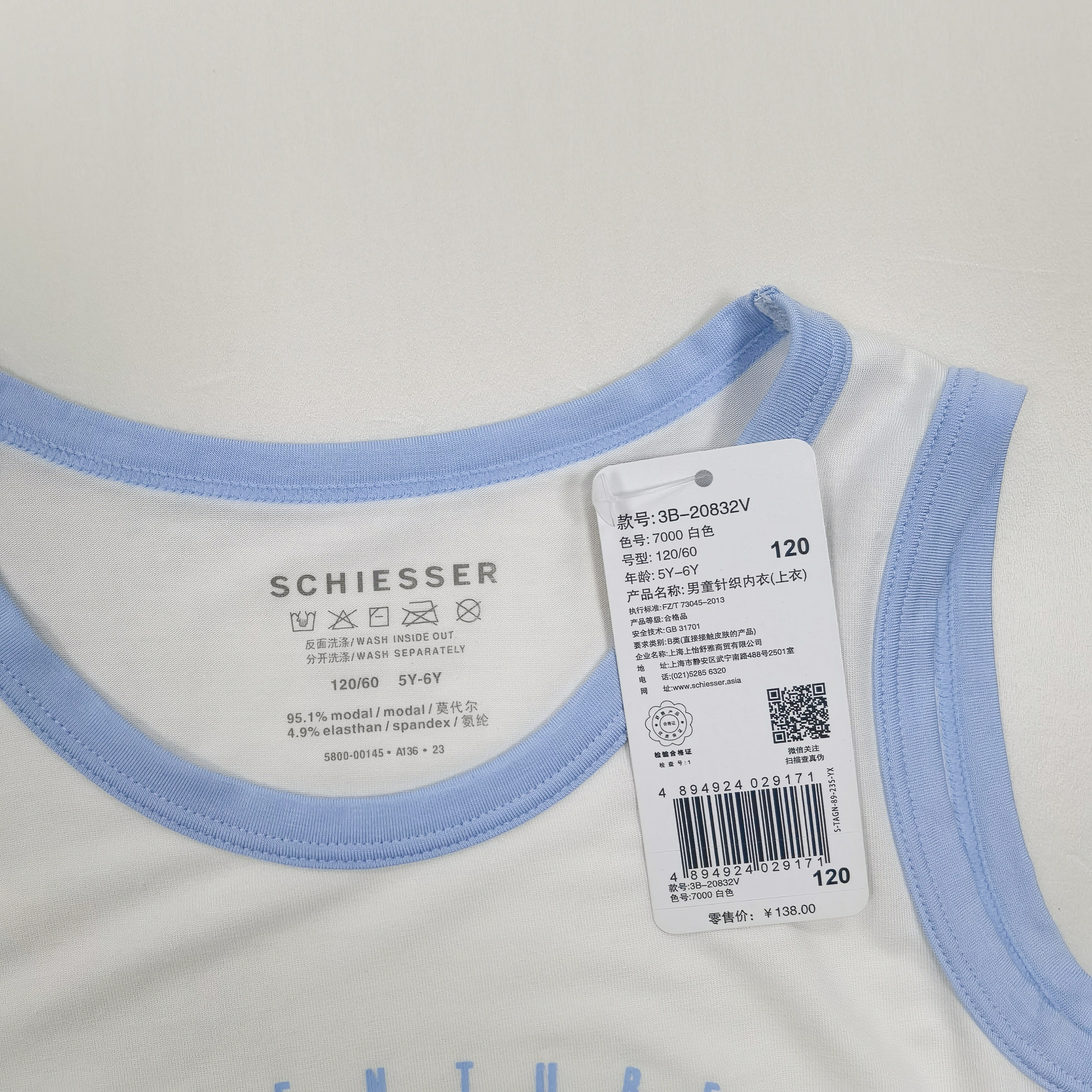 【莫代尔背心】SCHIESSER德国舒雅儿童睡衣春夏新款莫代尔男童上衣3B/20832V
