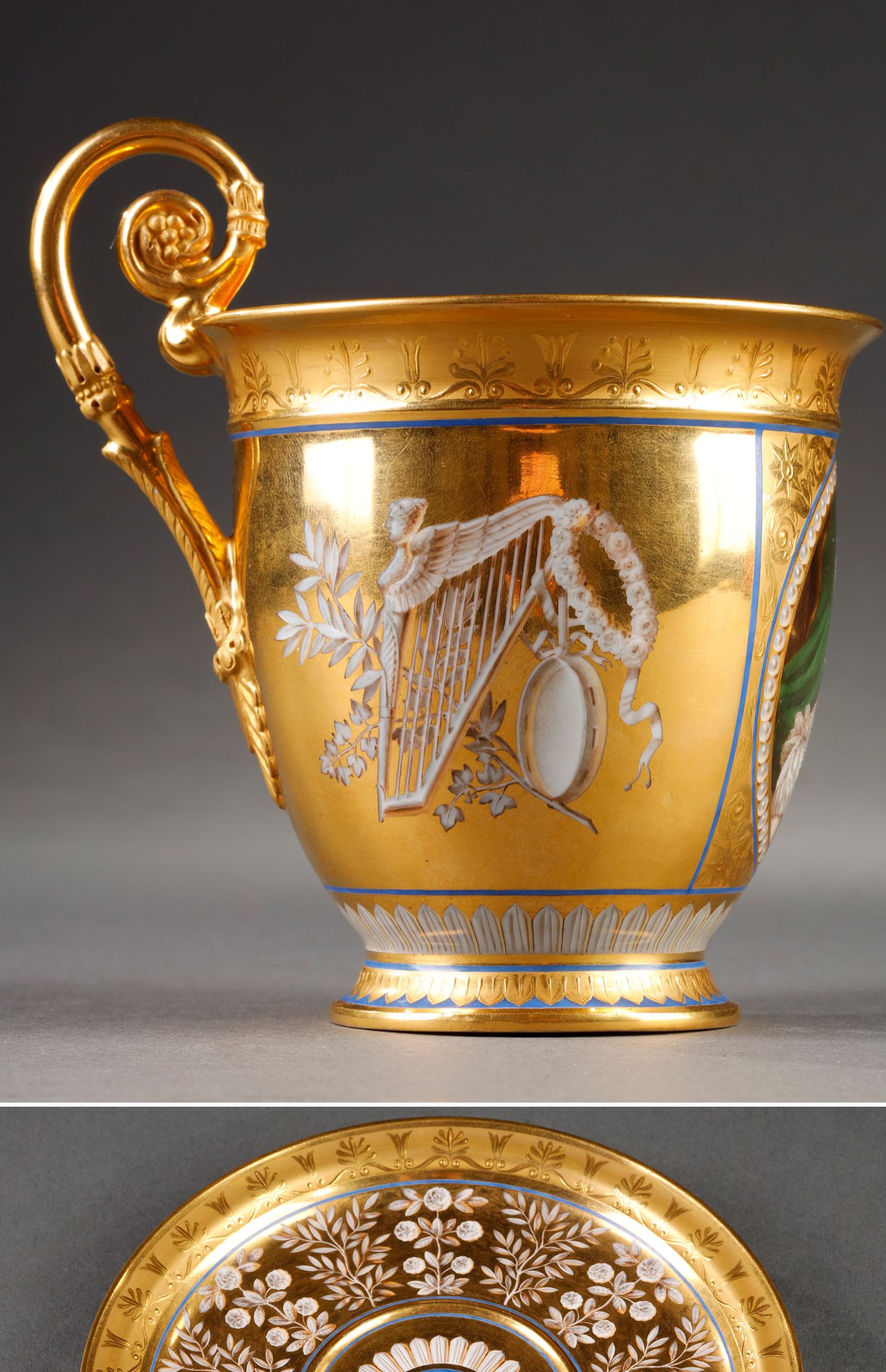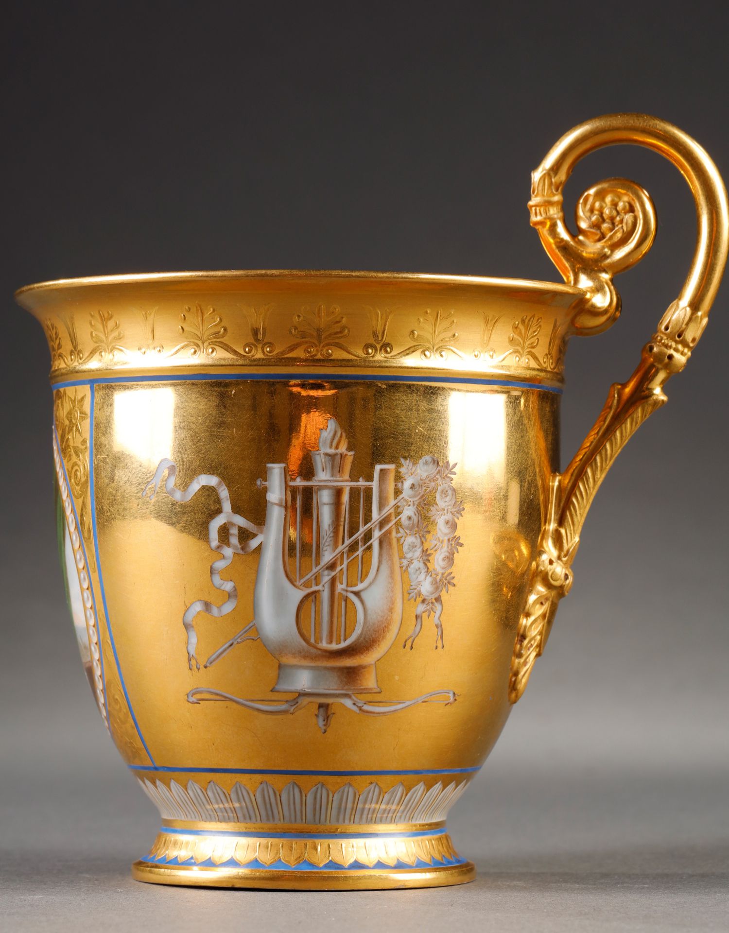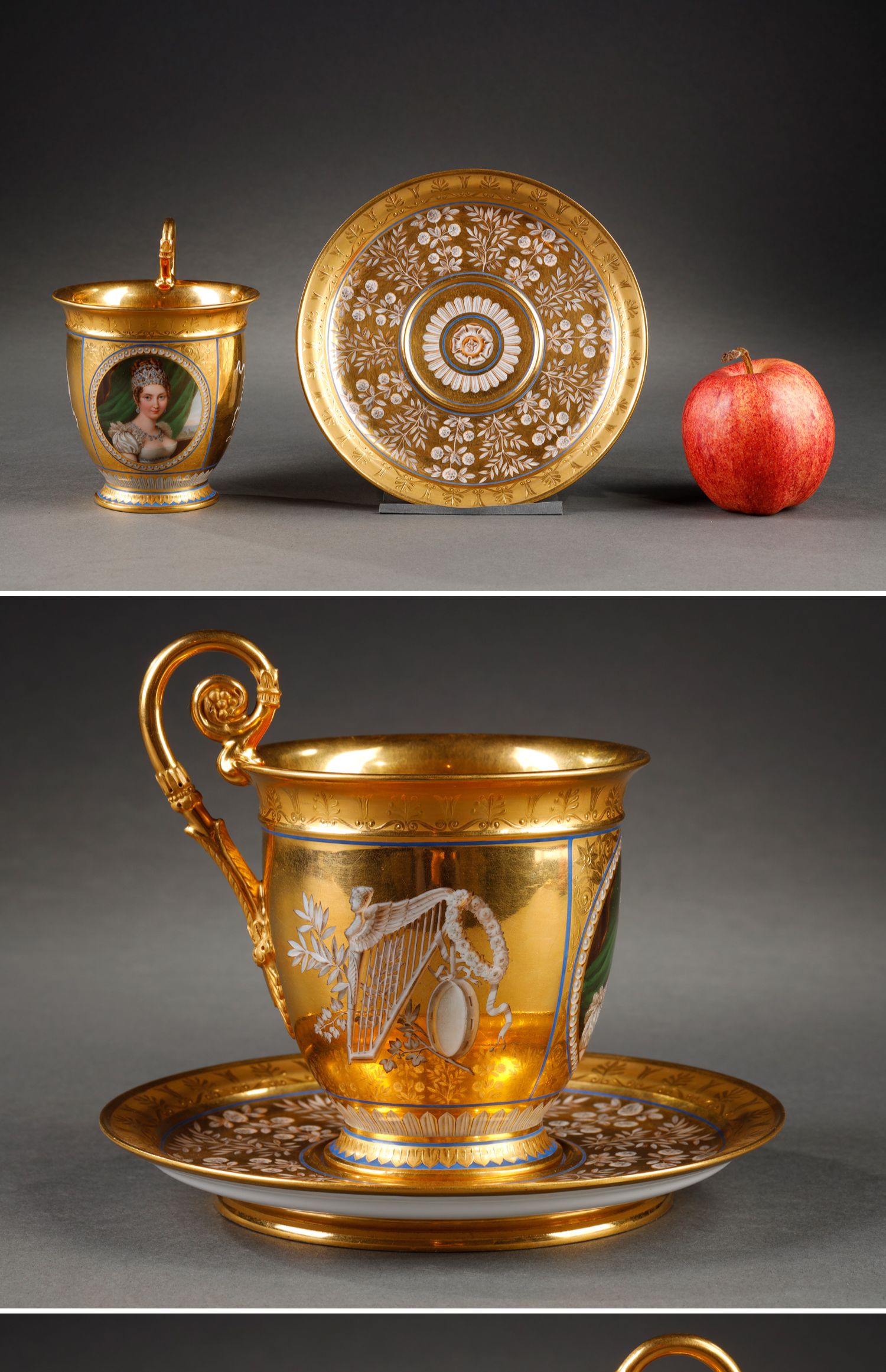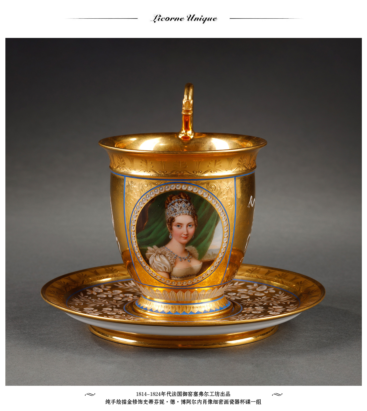 独角鹿西洋古董塞弗尔瓷器手绘描金肖像细密画瓷器杯碟一套