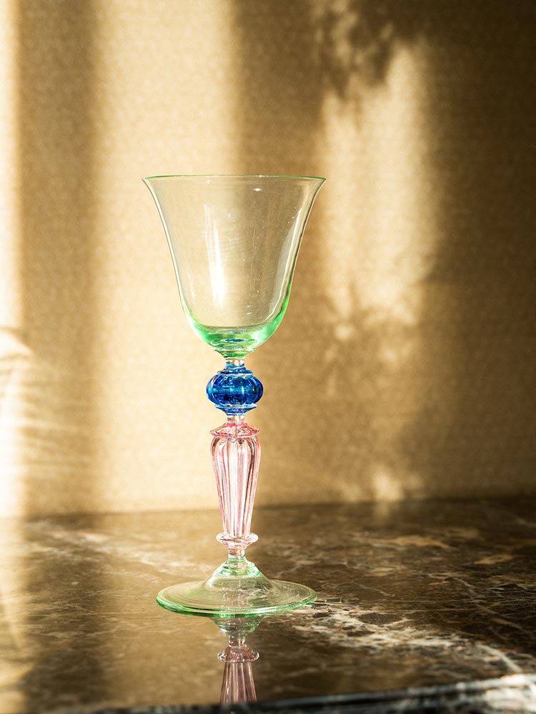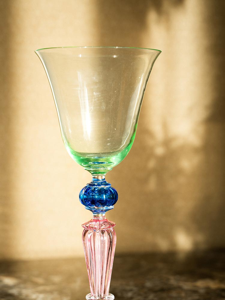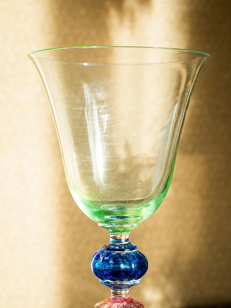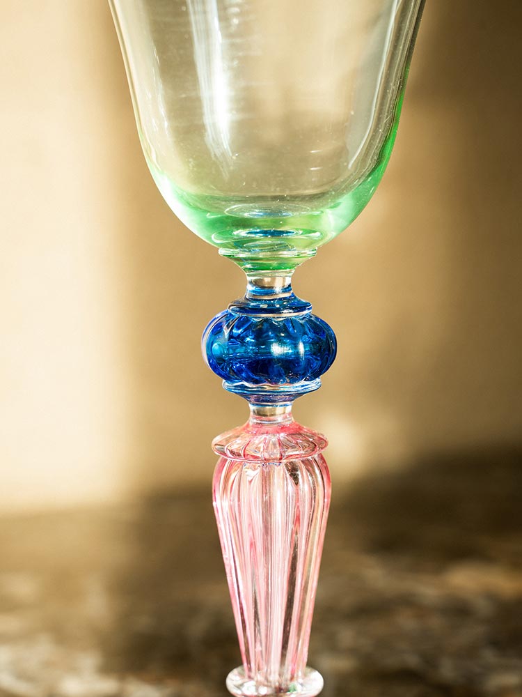 20世纪意大利威尼斯穆拉诺水晶工坊出品螺旋纹蓝色及粉色杯柄修饰绿色杯身玻璃高脚杯