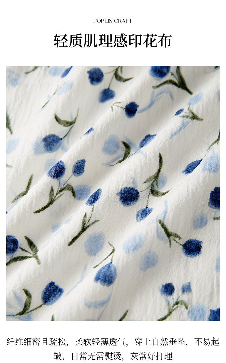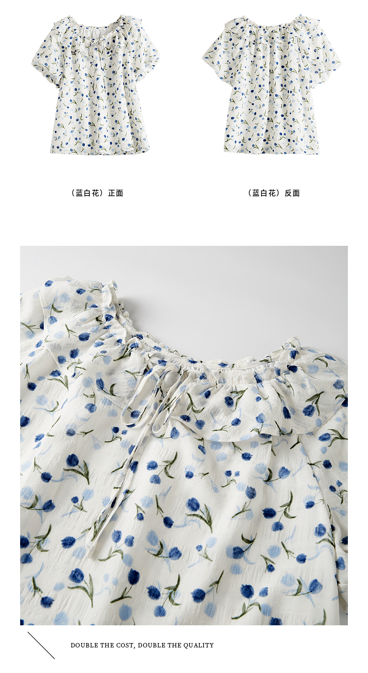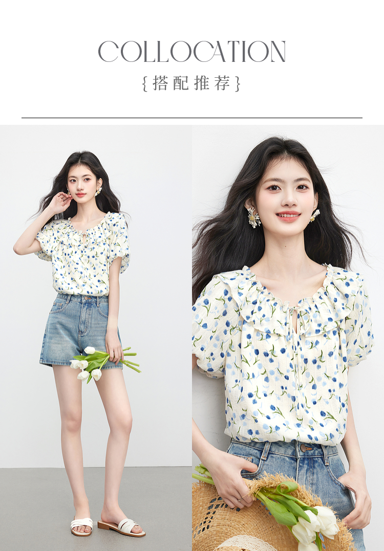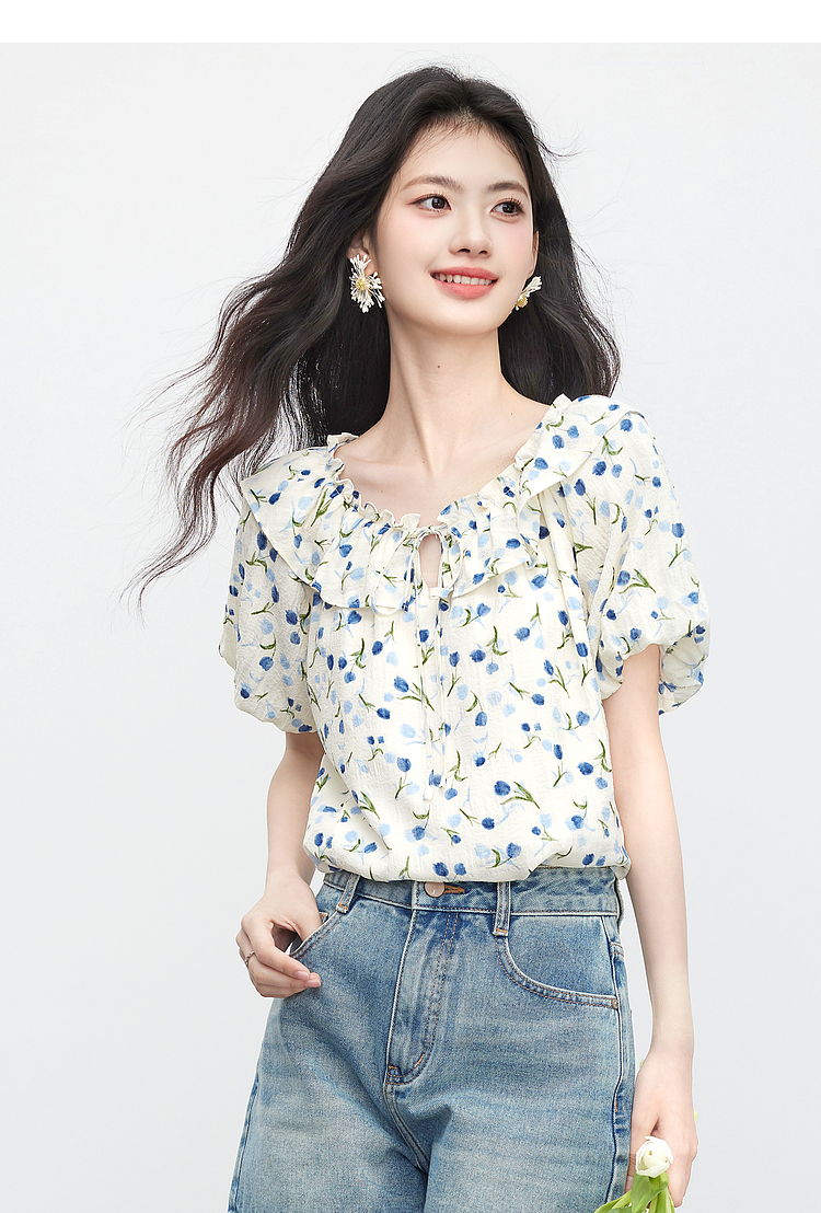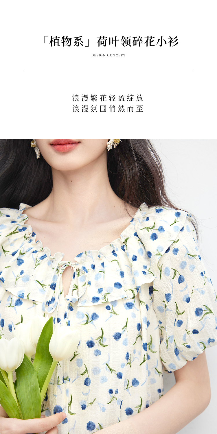 【周四狂欢价】熙世界法式荷叶边碎花衬衫女夏季2025新款浪漫清新花苞袖小衫上衣
