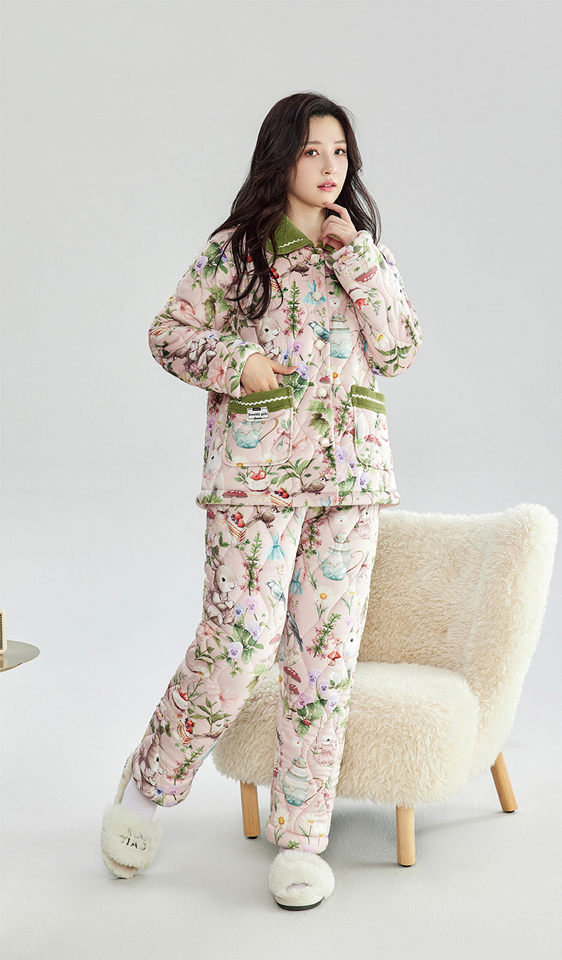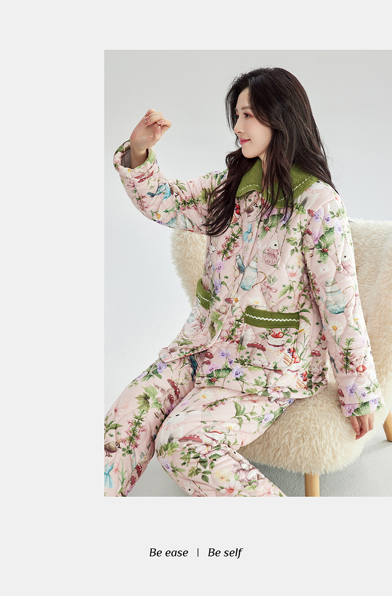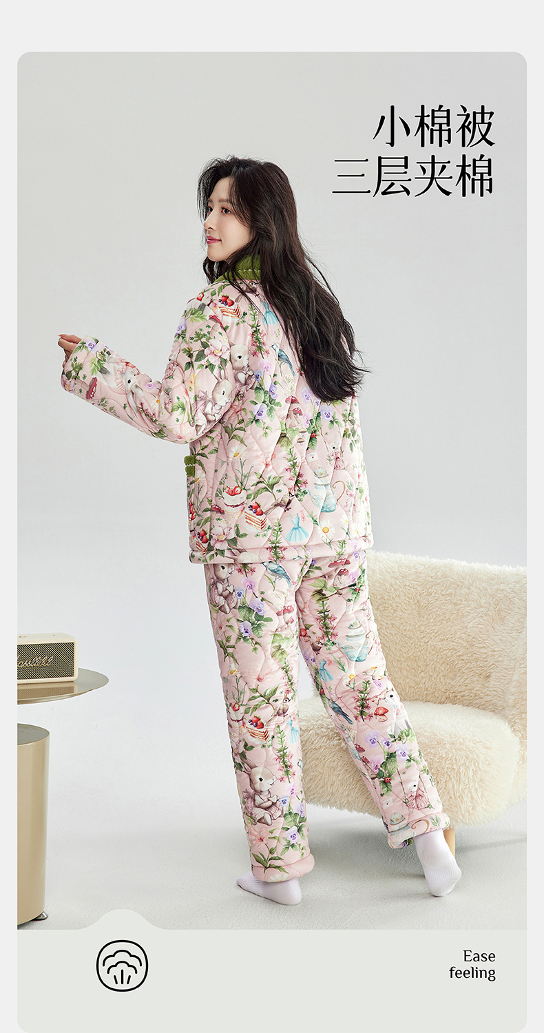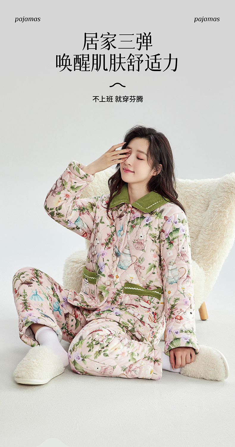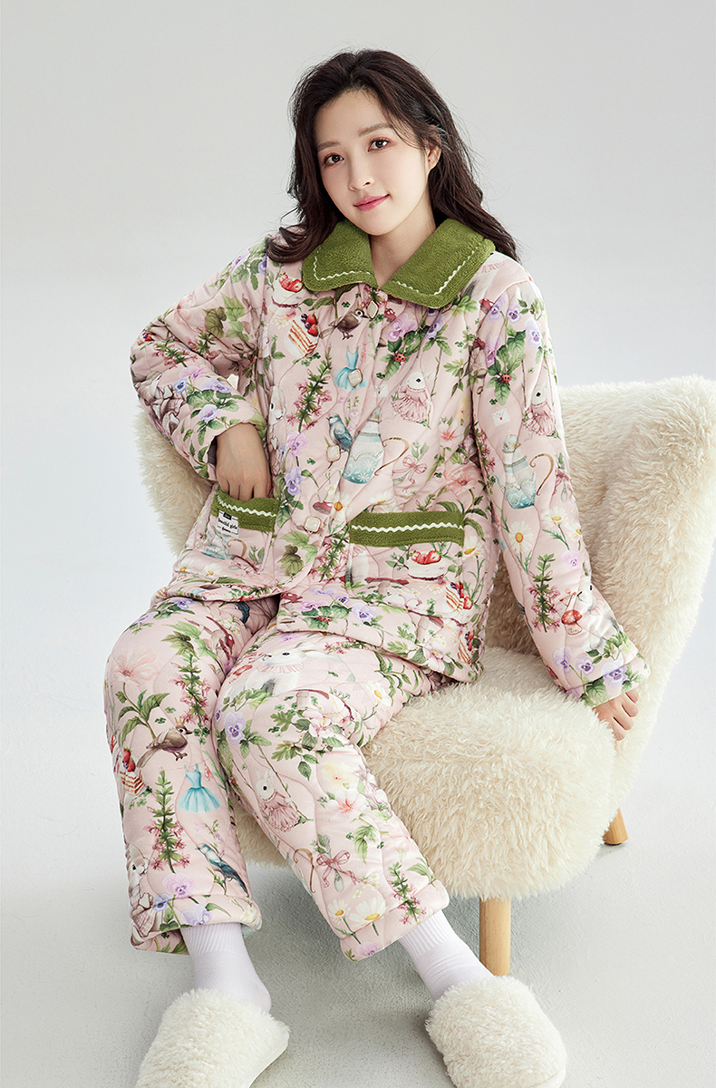 芬腾加绒加厚睡衣女冬季翻领开衫三层夹棉珊瑚绒可外穿家居服套装
