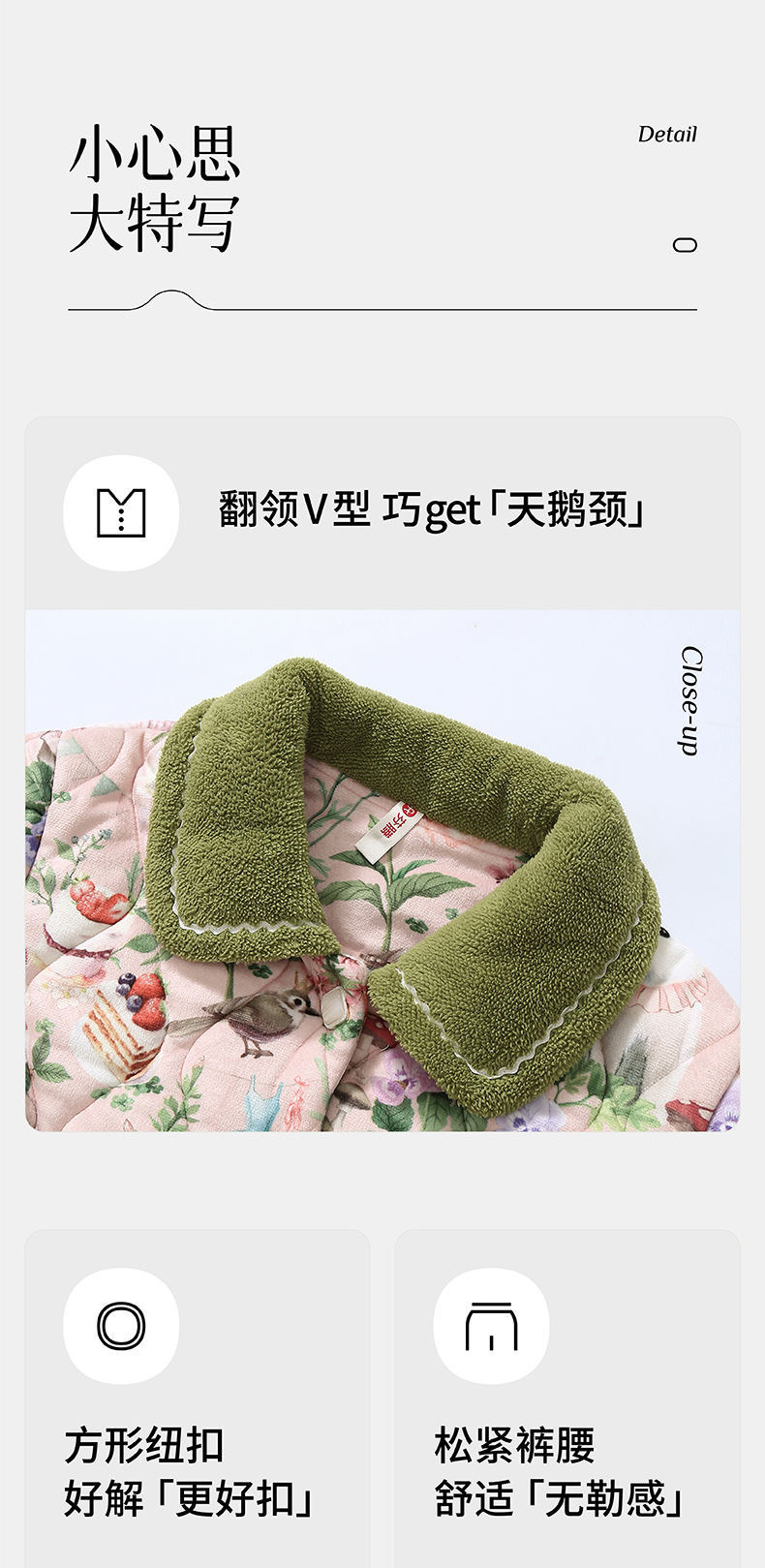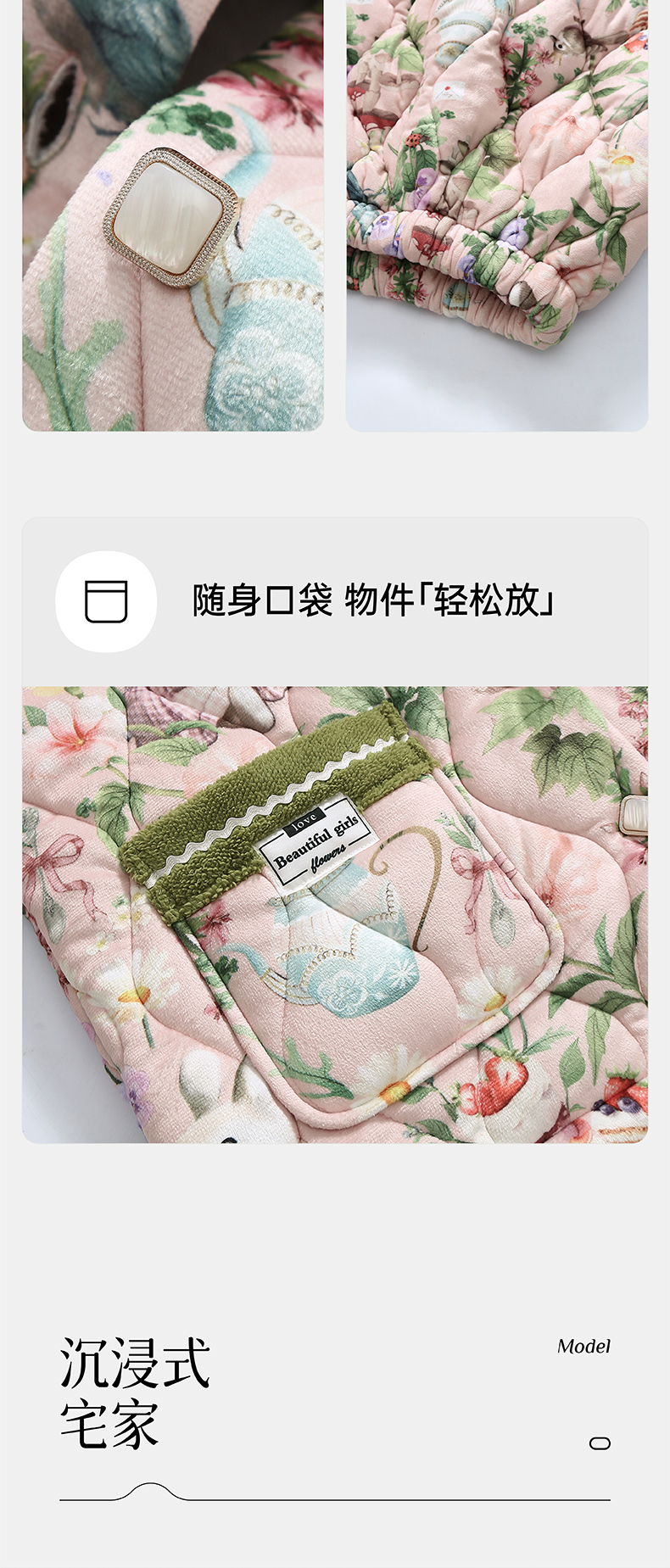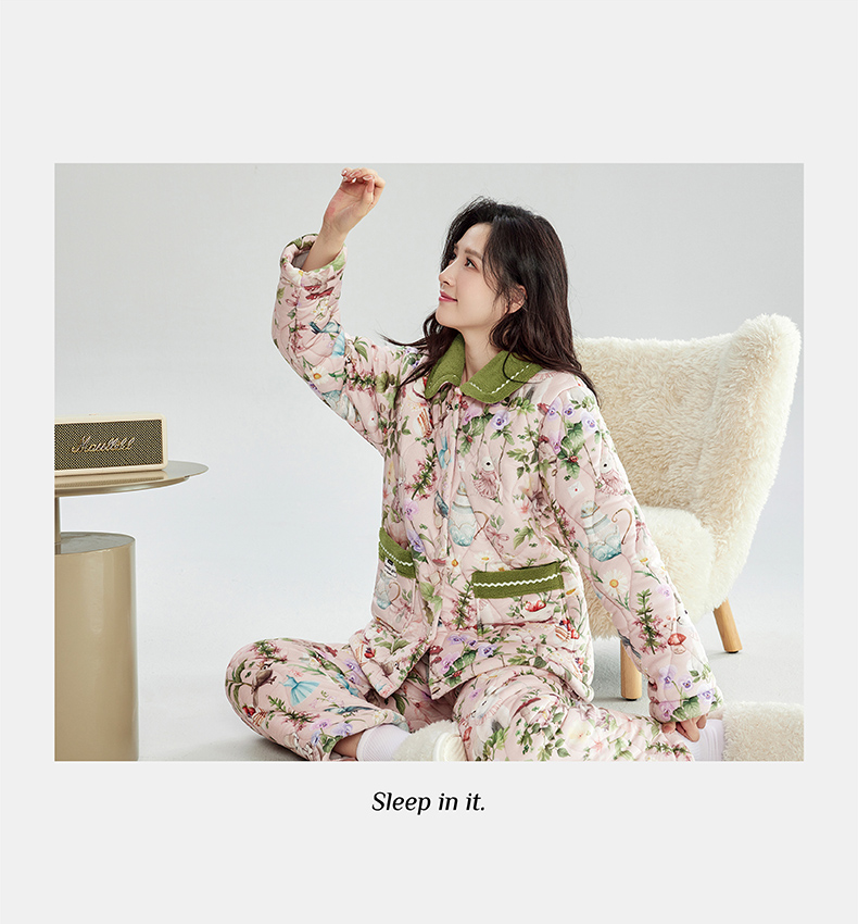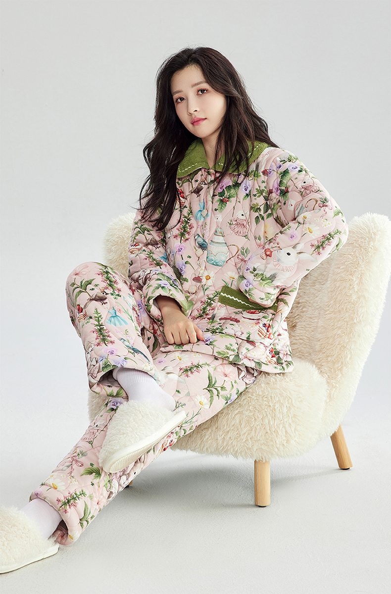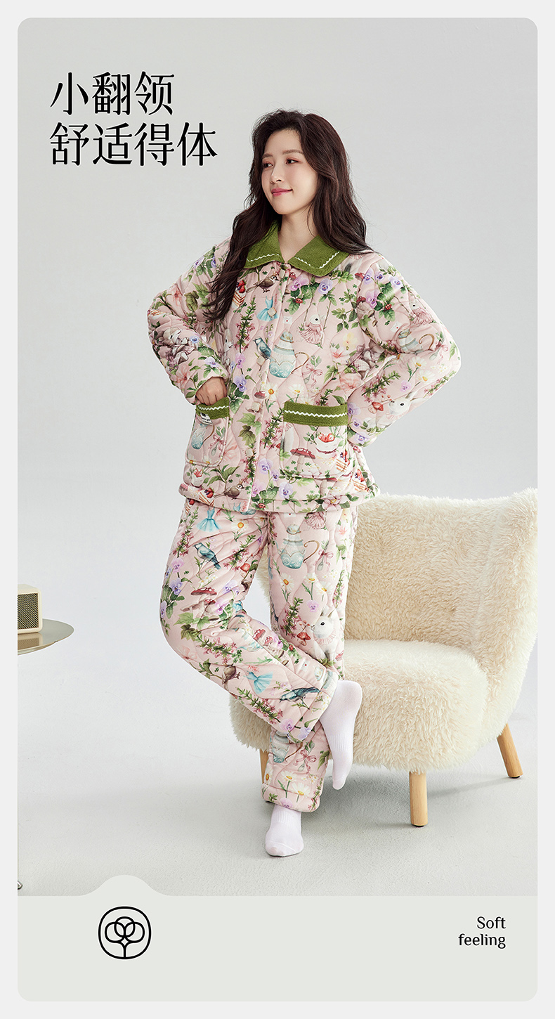 芬腾加绒加厚睡衣女冬季翻领开衫三层夹棉珊瑚绒可外穿家居服套装