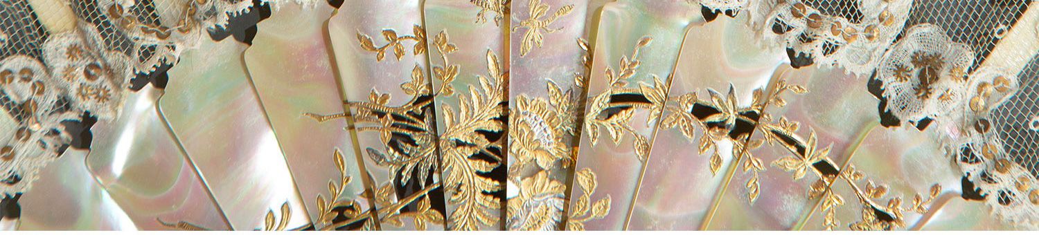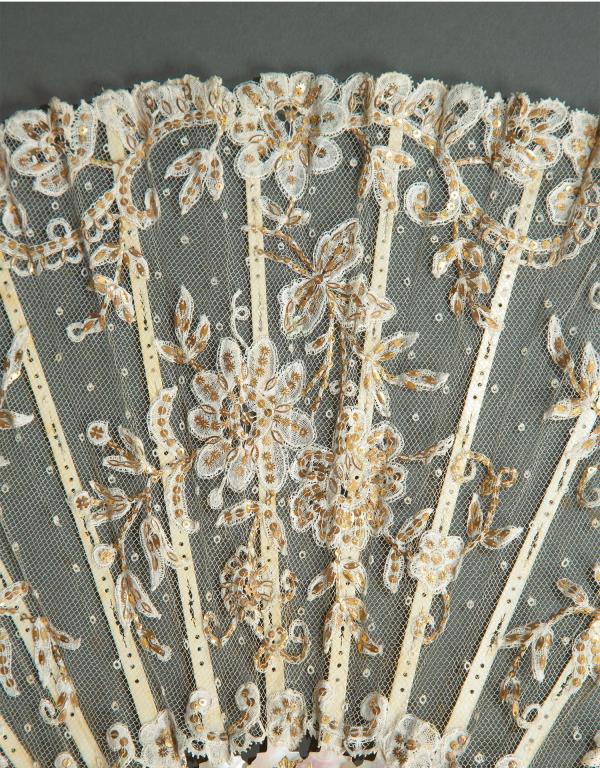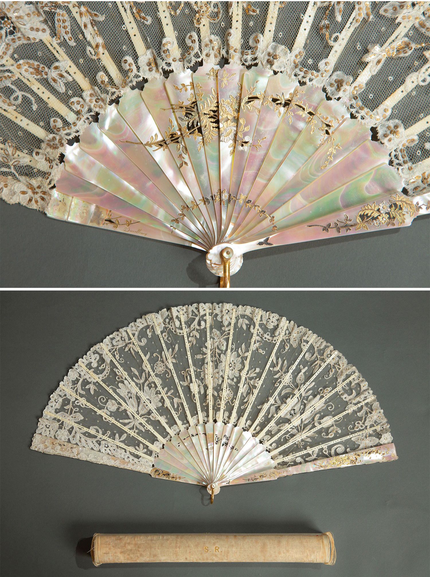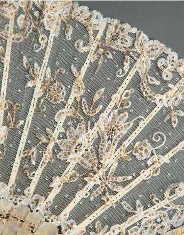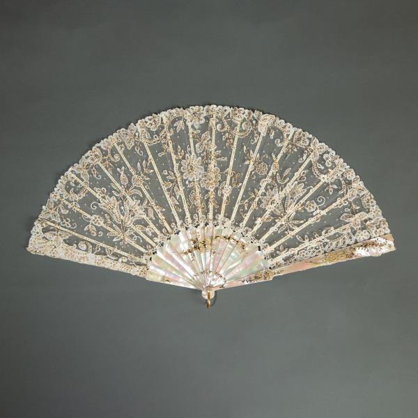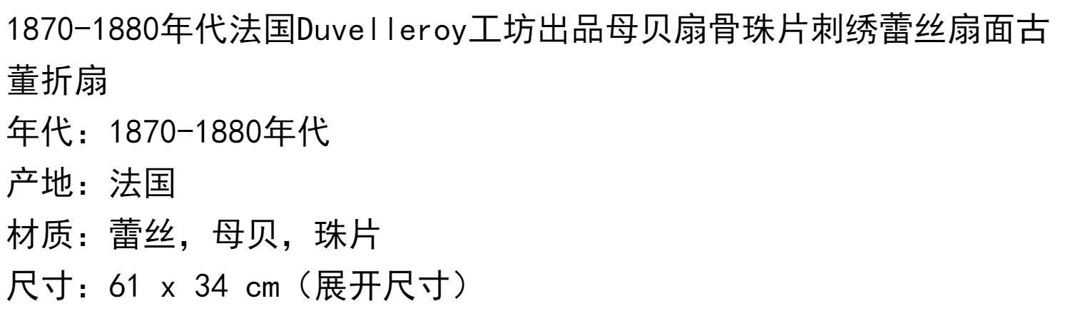 独角鹿西洋古董法国Duvelleroy工坊母贝扇骨珠片刺绣蕾丝扇面折扇