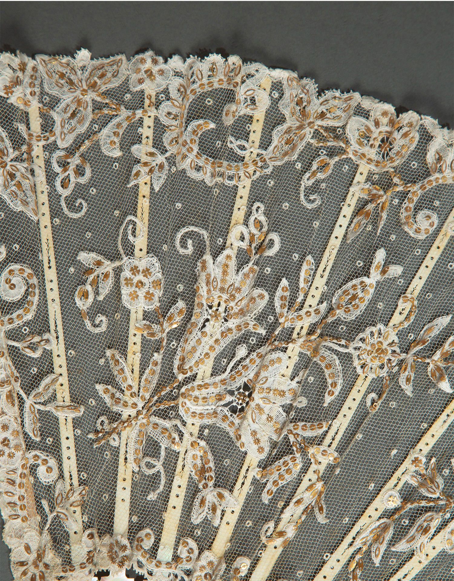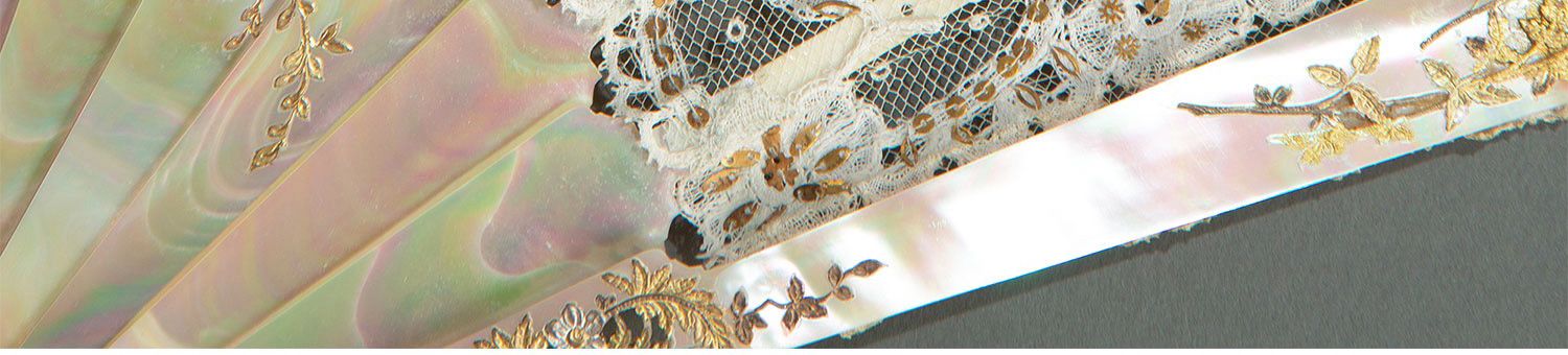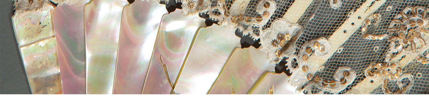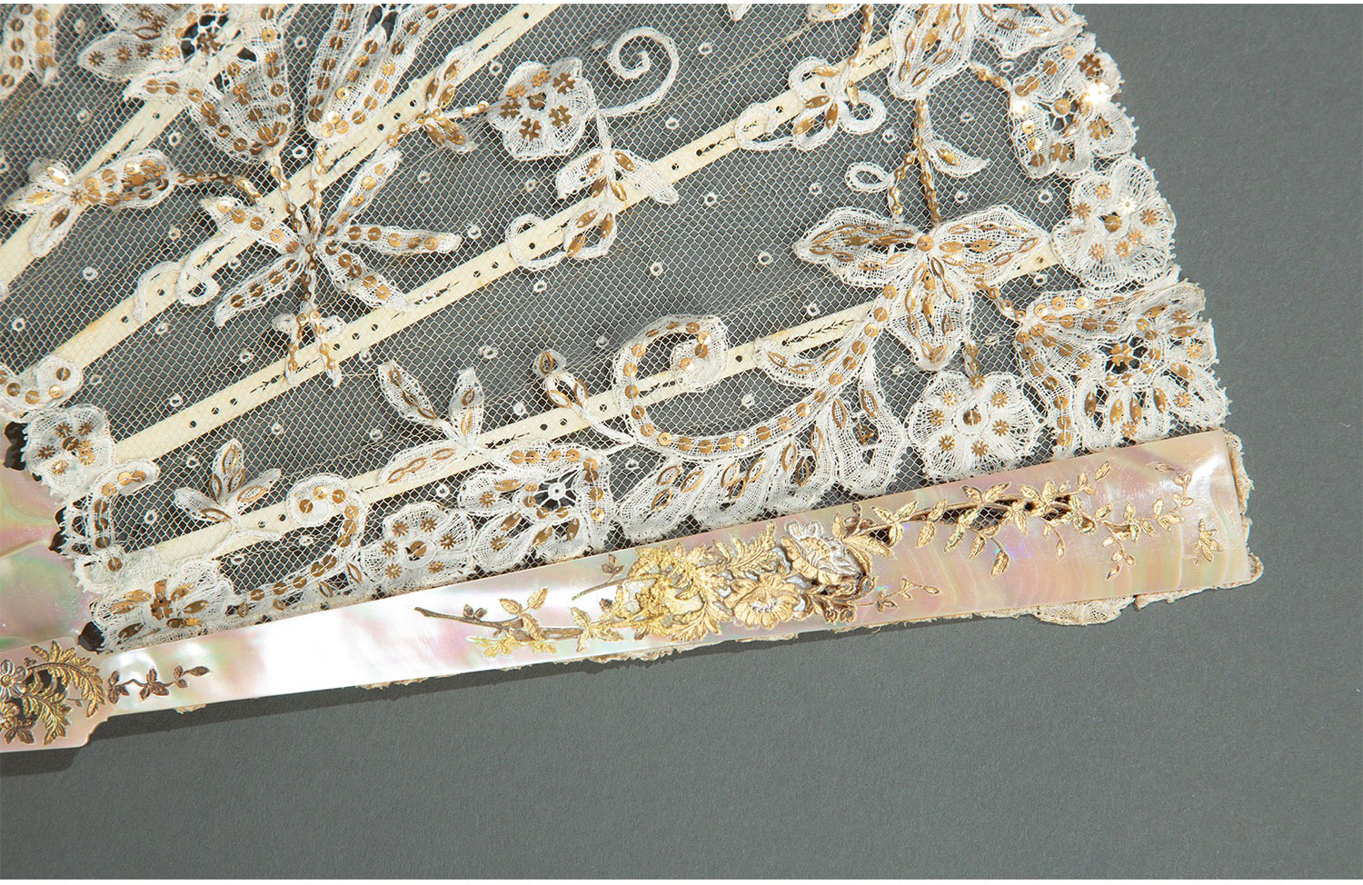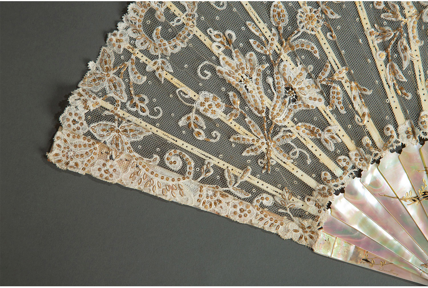 独角鹿西洋古董法国Duvelleroy工坊母贝扇骨珠片刺绣蕾丝扇面折扇