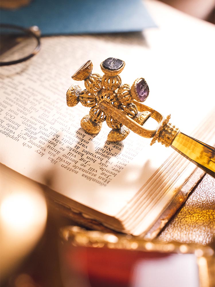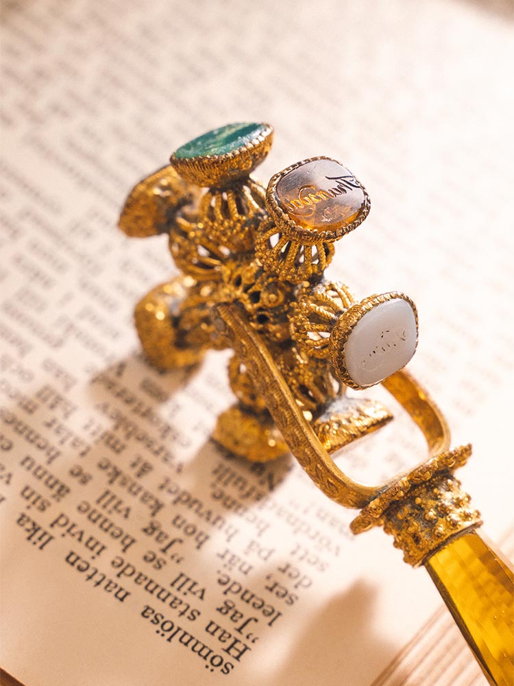 19世纪法国出品烟晶手柄装饰铜鎏金精雕镶嵌星期主题七色硬石转轮式火漆印章