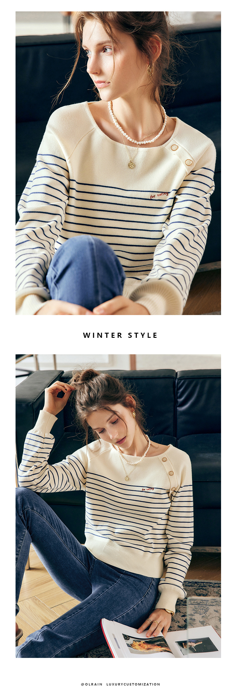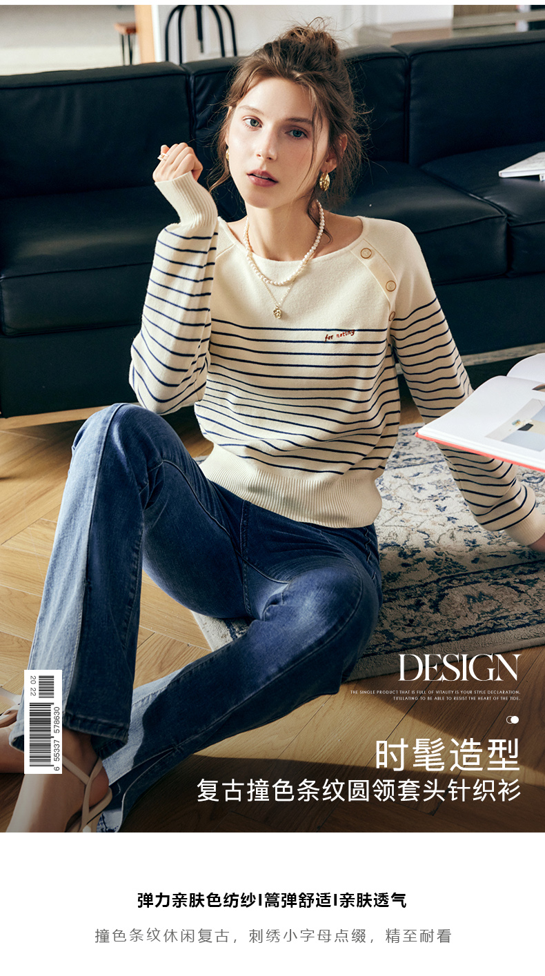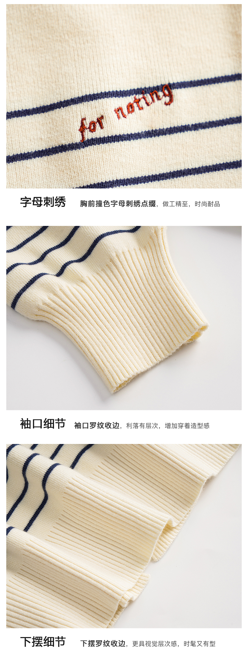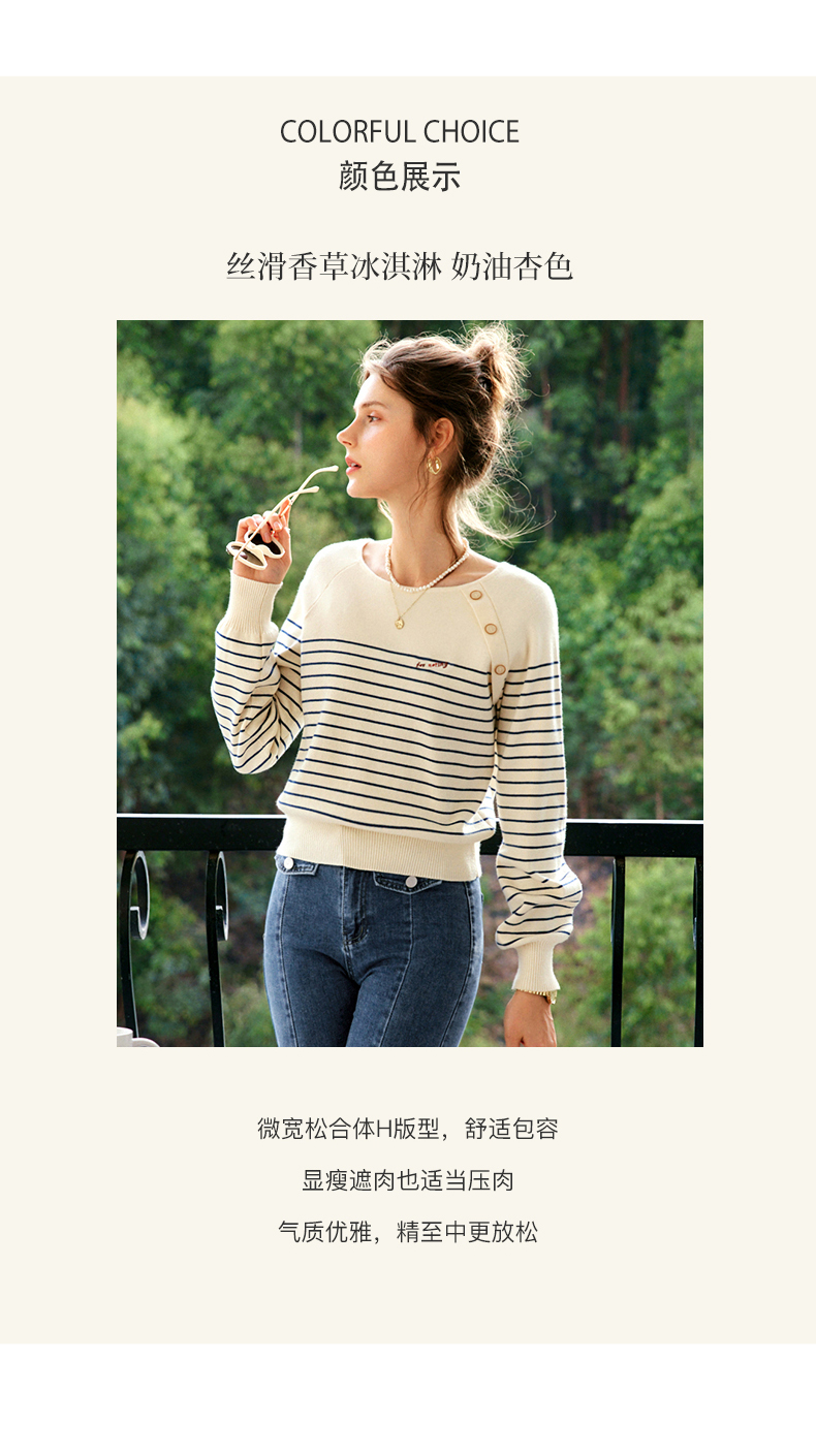 OLrain欧芮儿法式杏色条纹套头针织衫女早秋2022新款宽松复古上衣