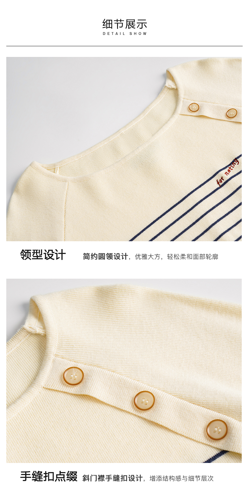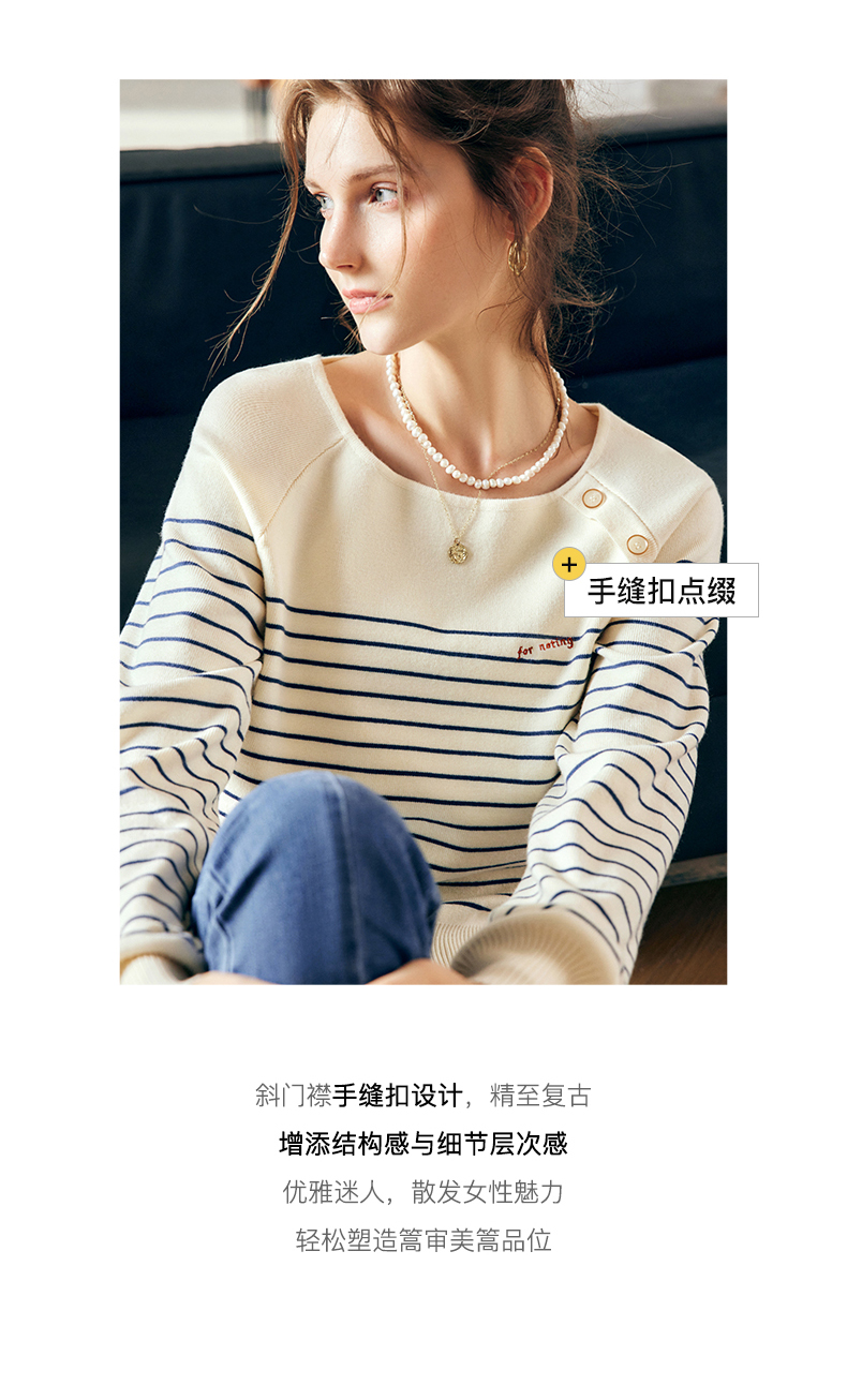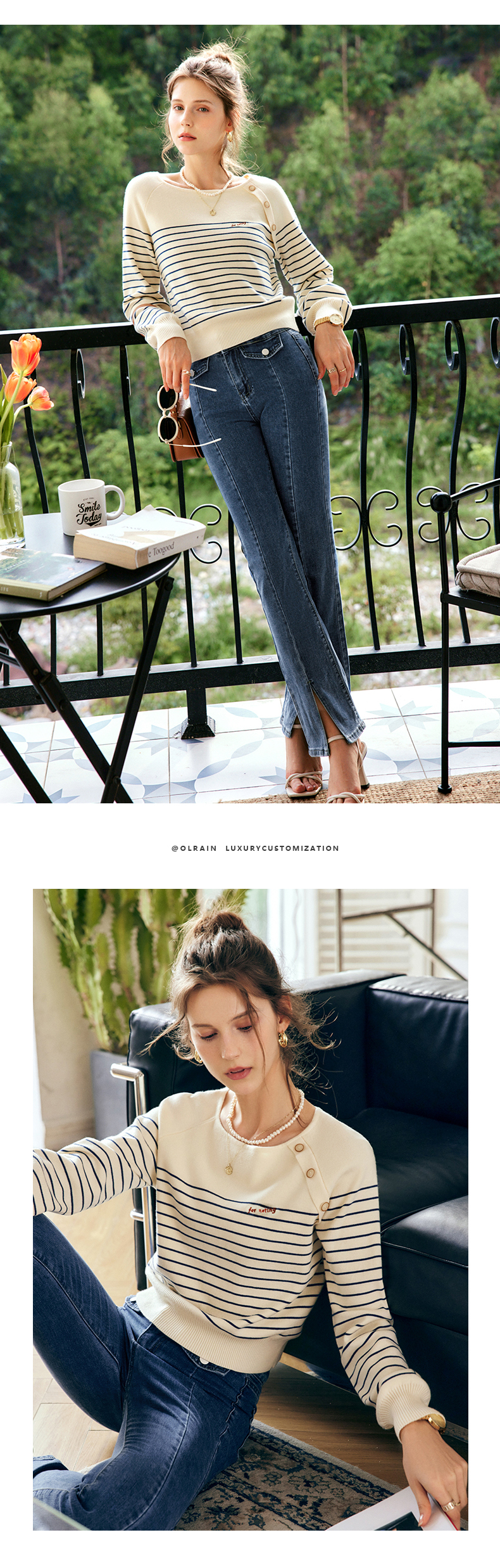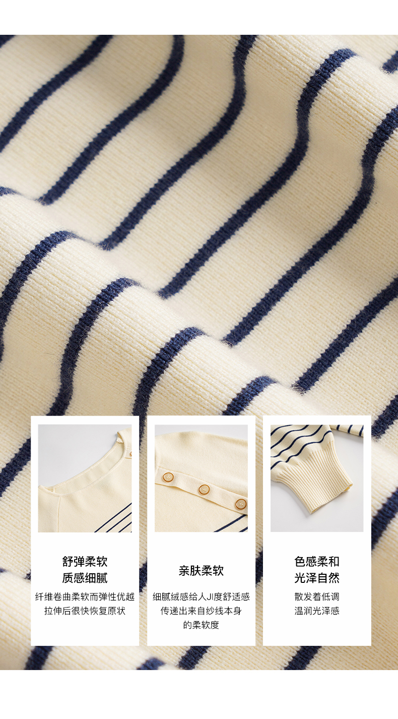 OLrain欧芮儿法式杏色条纹套头针织衫女早秋2022新款宽松复古上衣