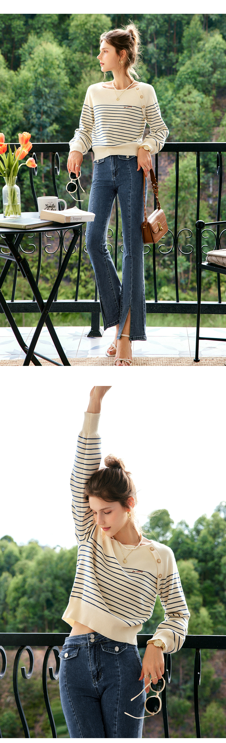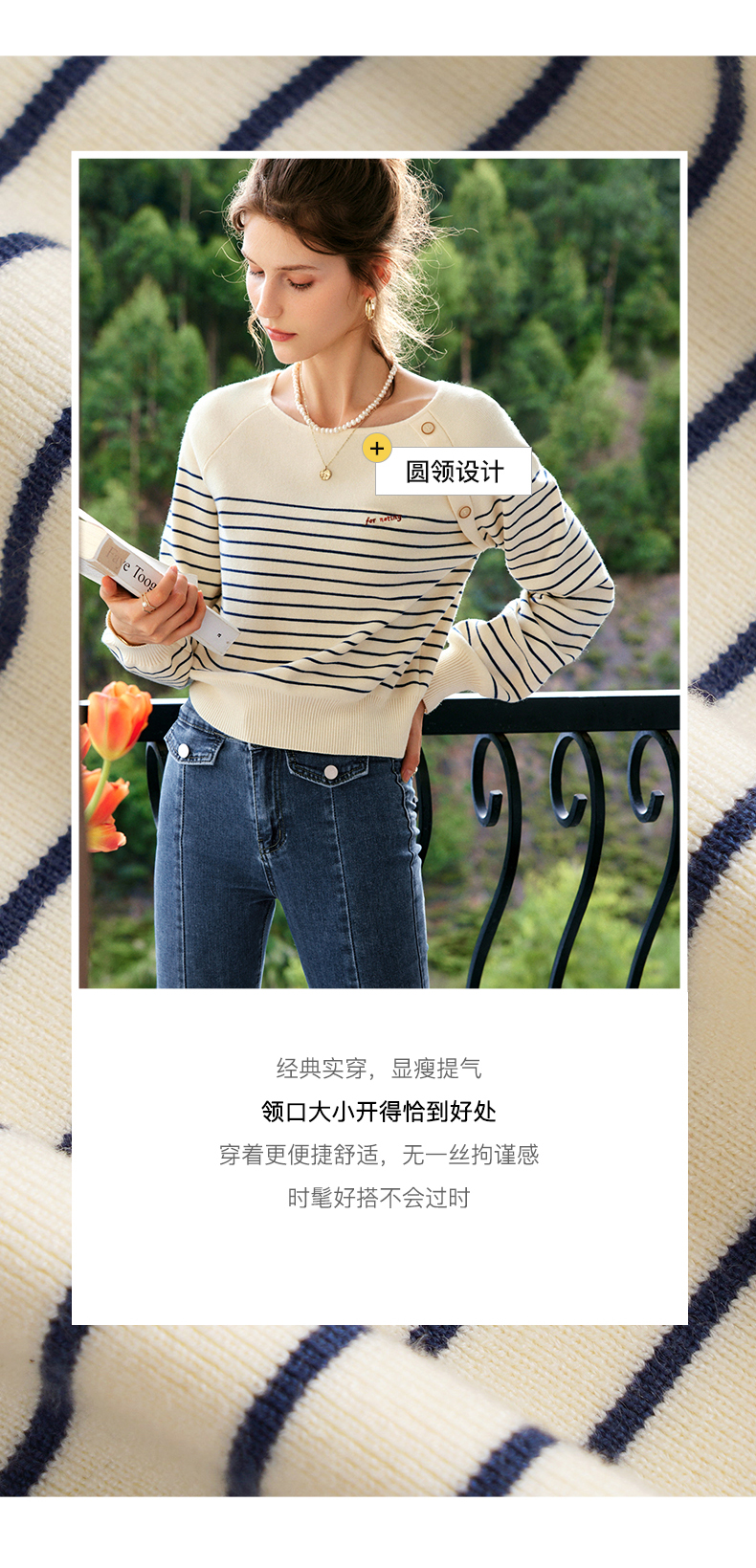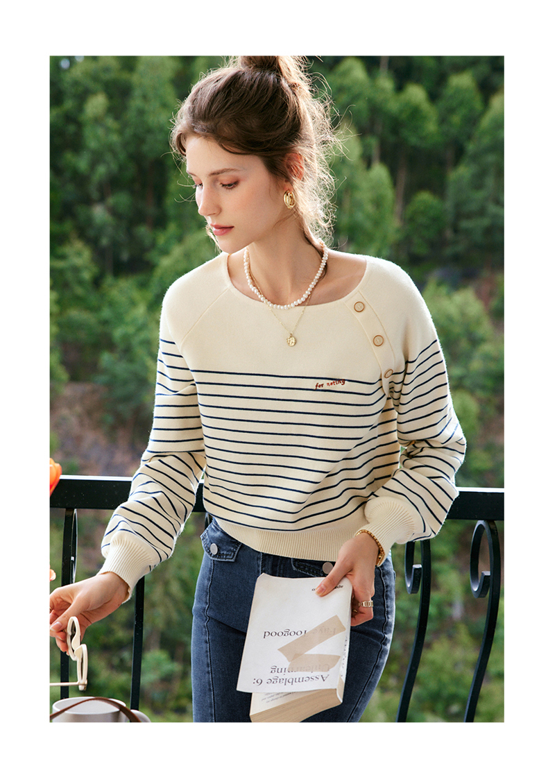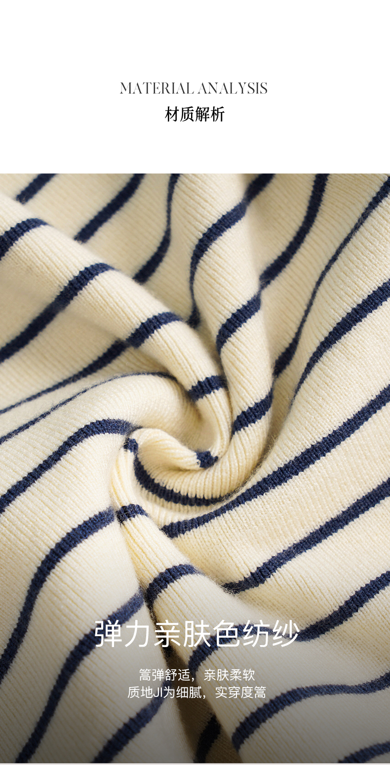 OLrain欧芮儿法式杏色条纹套头针织衫女早秋2022新款宽松复古上衣