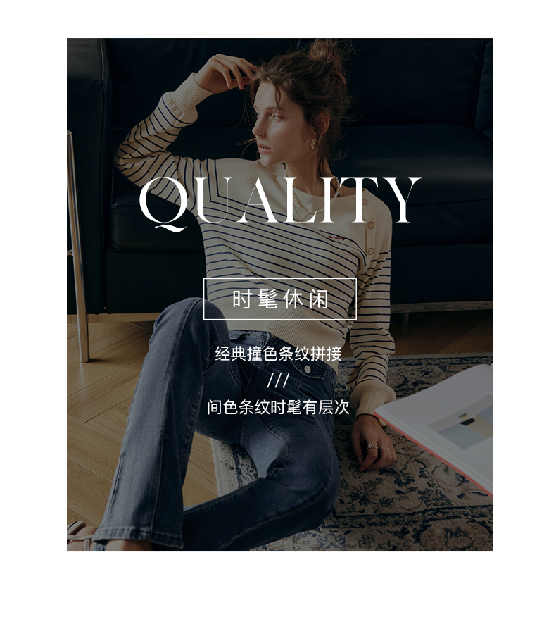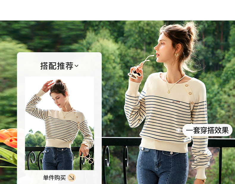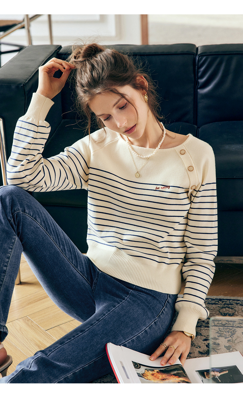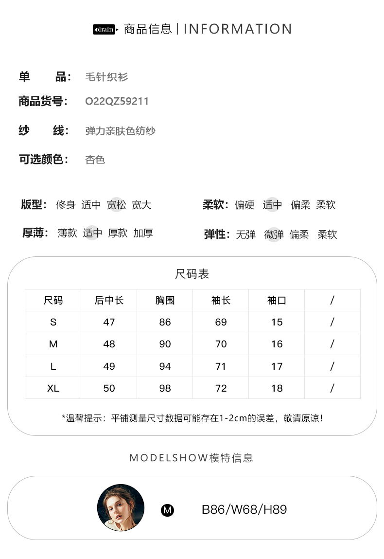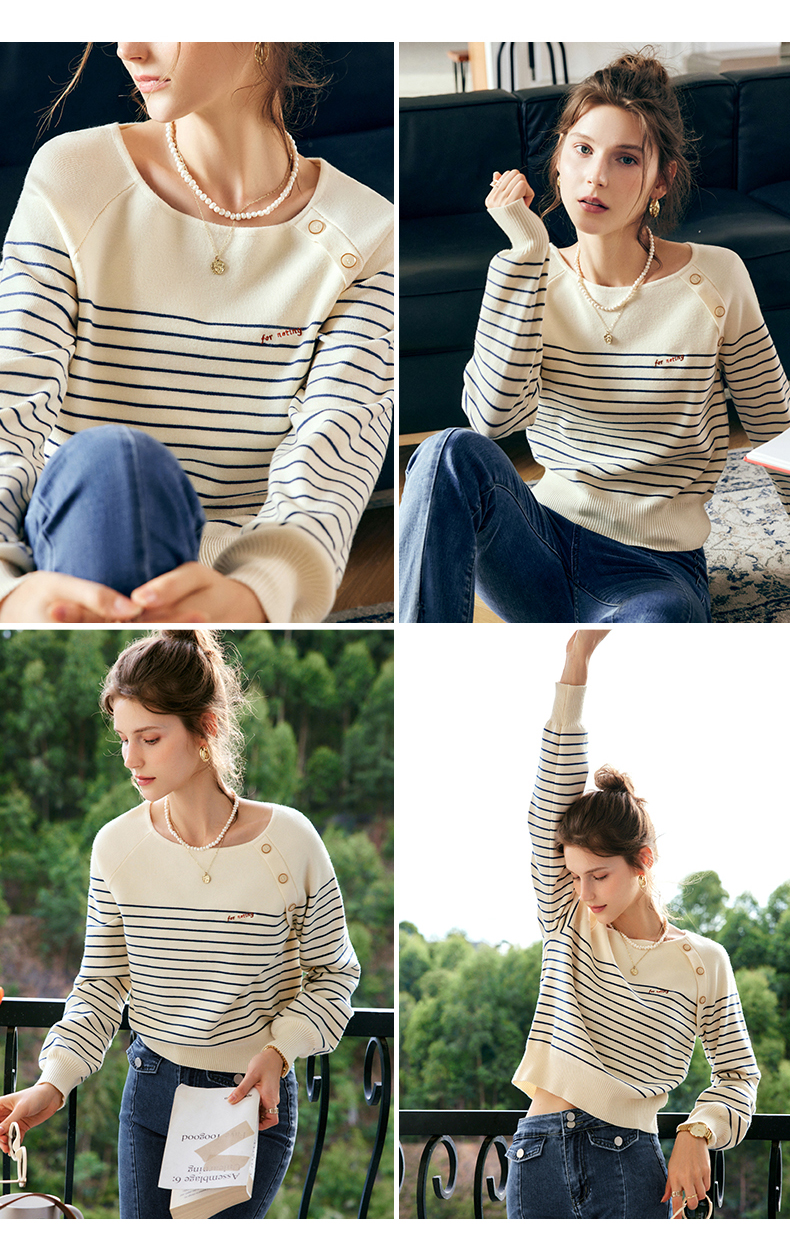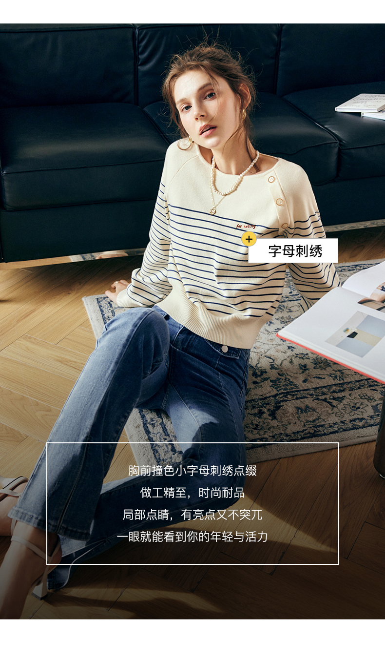 OLrain欧芮儿法式杏色条纹套头针织衫女早秋2022新款宽松复古上衣