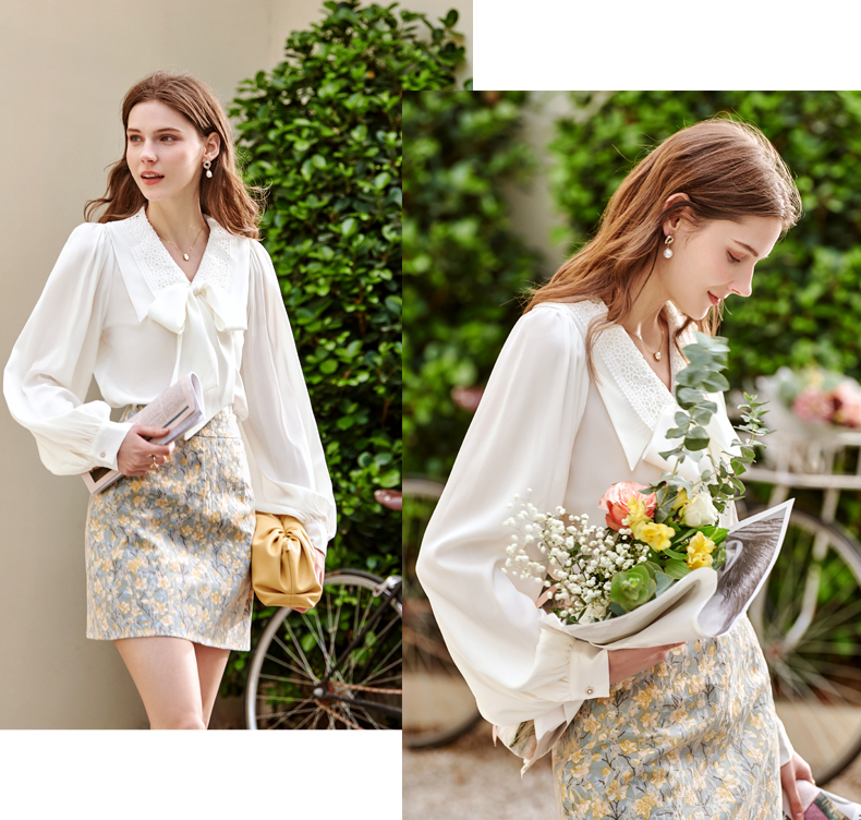 欧芮儿OLrain法式V领衬衫女夏季2022年新款宽松泡泡袖薄款衬衣