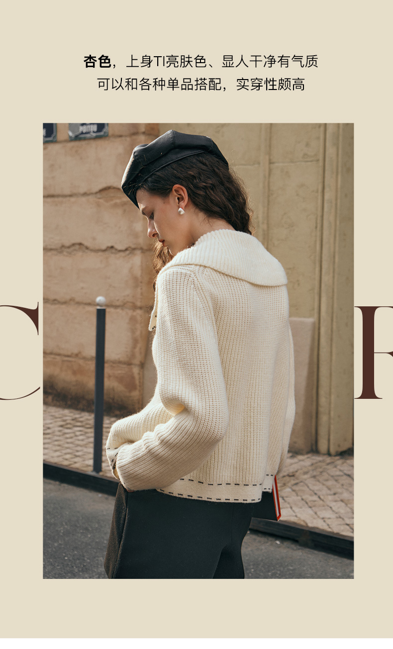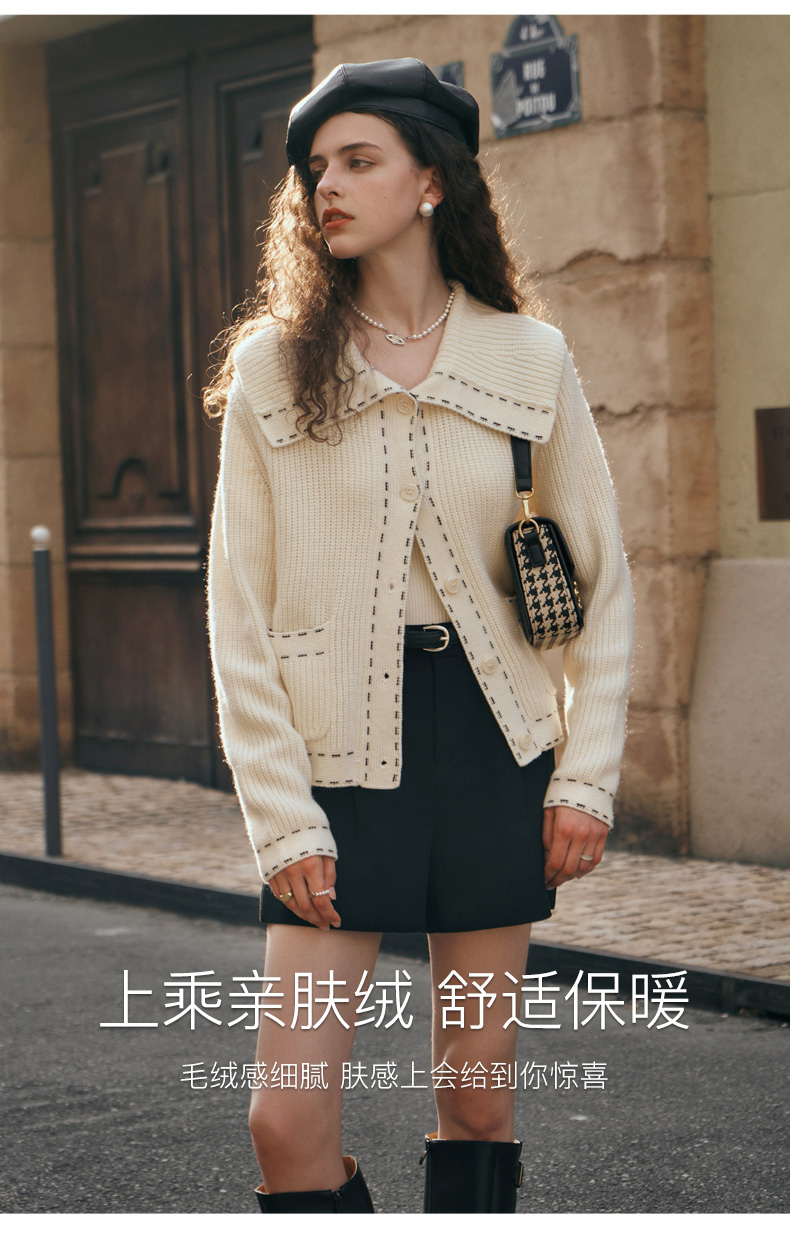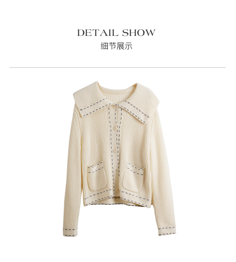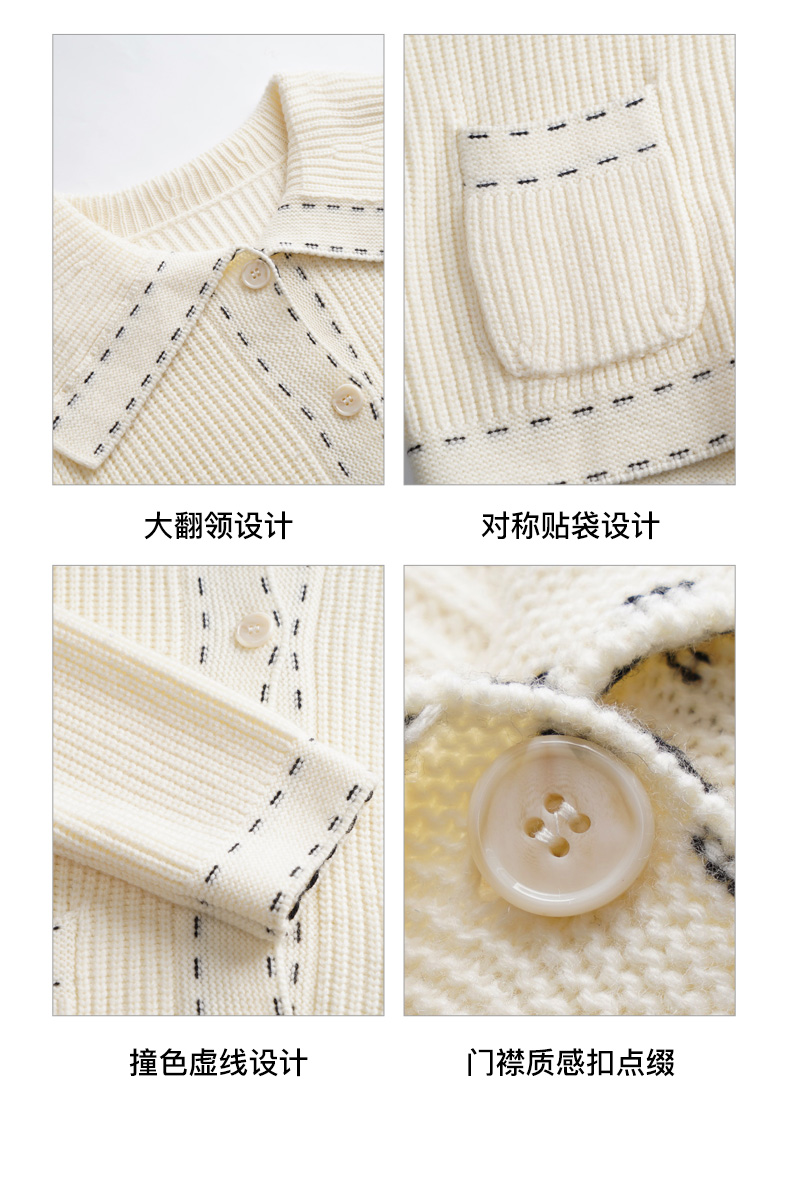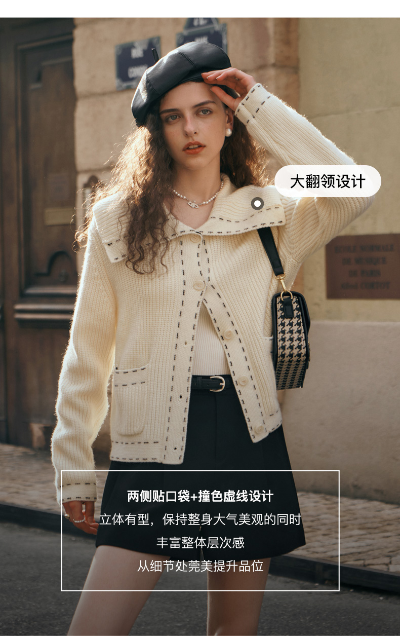 OLrain欧芮儿大翻领针织开衫女初秋2023新款宽松气质撞色毛衣外套