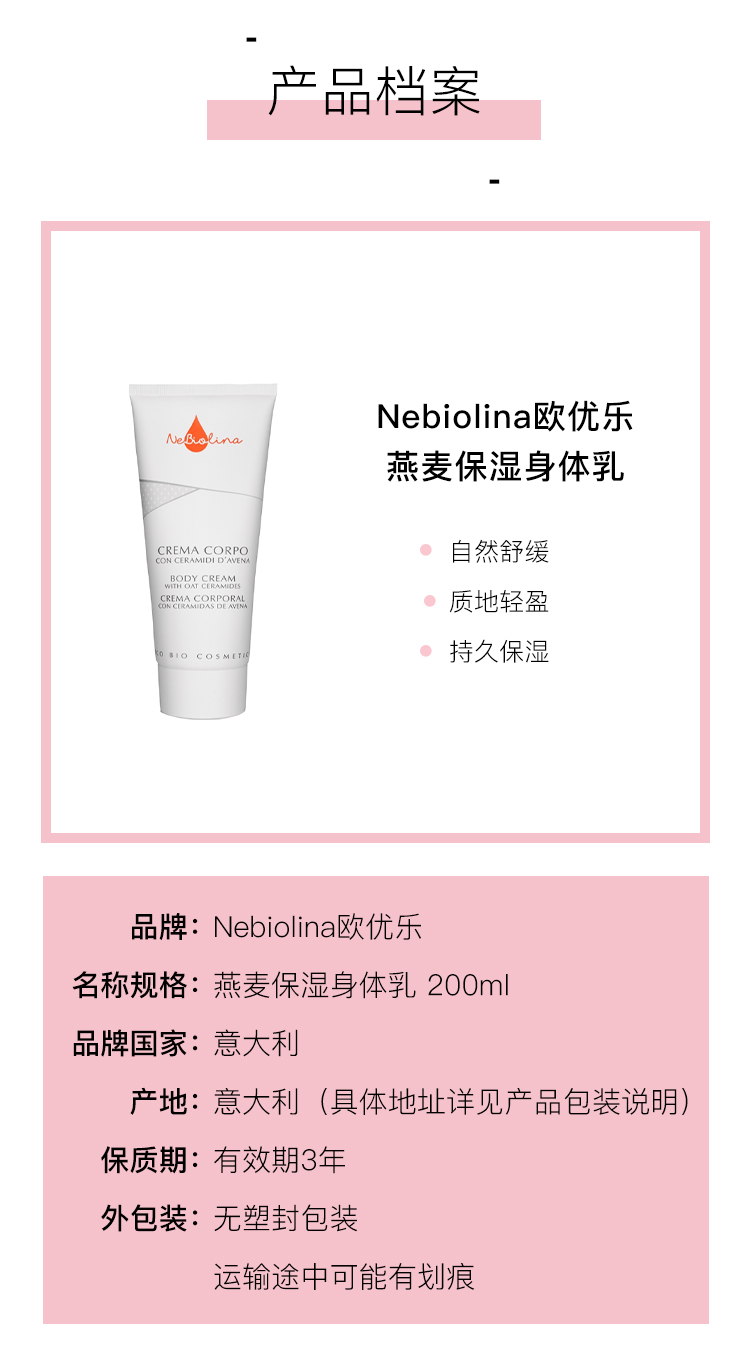 Nebiolina欧优乐 燕麦保湿身体乳 自然舒缓 质地轻盈 持久保湿 200ml