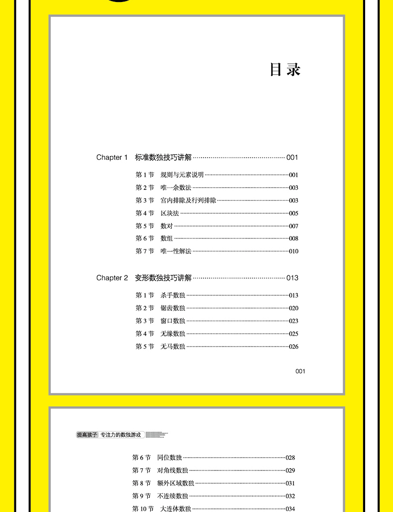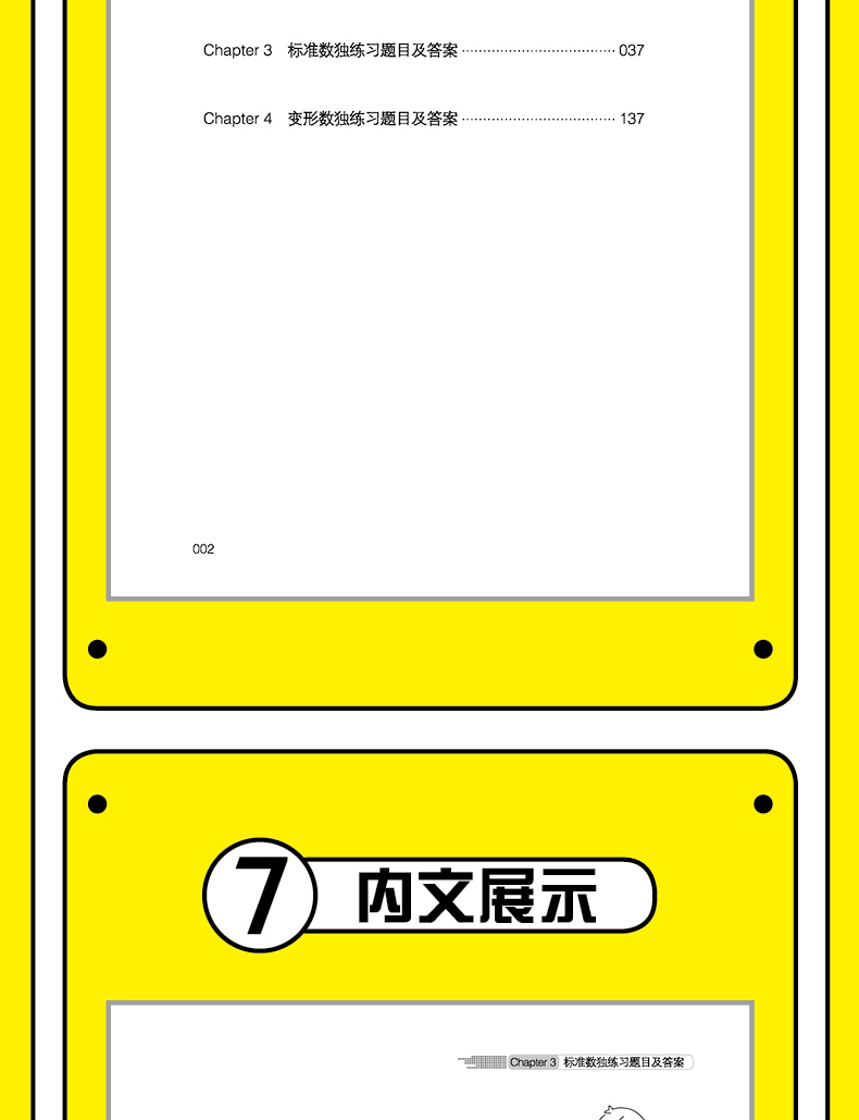 Chapter 1 标准数独技巧讲解第1 节 规则与元素说明//001第2 节 余数法//003第3 节 宫内排除及行列排除//003第4 节 区块法//005第5 节 数对//007第6 节 数组//008第7 节 性解法//010Chapter 2 变形数独技巧讲解第1 节 杀手数独//013第2 节 锯齿数独//020第3 节 窗口数独//023第4 节 无缘数独//025第5 节 无马数独//026第6 节 同位数独//028第7 节 对角线数独//029第8 节 额外区域数独//031第9 节 不连续数独//032第10 节 大连体数独//034Chapter 3 标准数独练习题目及答案//037Chapter 4 变形数独练习题目及答案// 137