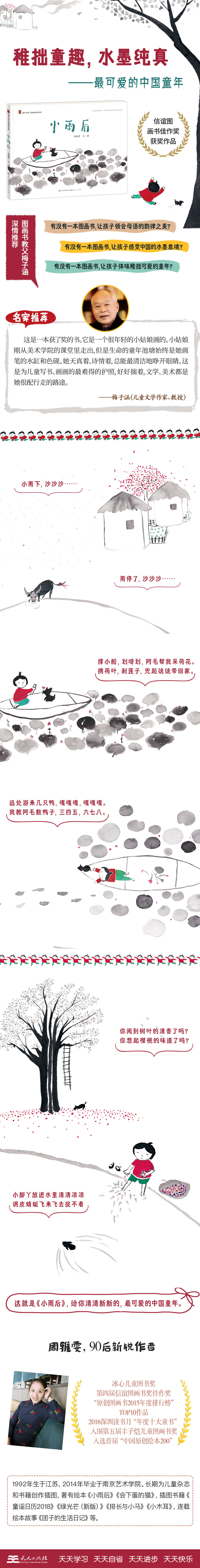 《小雨后》是新锐绘本作家周雅雯的处女作,曾获得2013年信谊图画书佳作奖。这部作品以童谣的形式配以稚拙的水墨画面,充满童真童趣,表现出中国特有的故事和艺术意境。画面中大量留白的运用增加了雨后天空的纯净,稚拙的笔触把乡村生活的童真童趣描绘得令人向往。★第五届丰子恺儿童图画书奖入围★2013年信谊图画书佳作奖★“原创图画书2015年度排行榜”TOP10★2016深圳读书月“年度十大童书”★2016年冰心儿童图书奖★“魔法童书会-妈妈眼中的2016中国原创好童书”