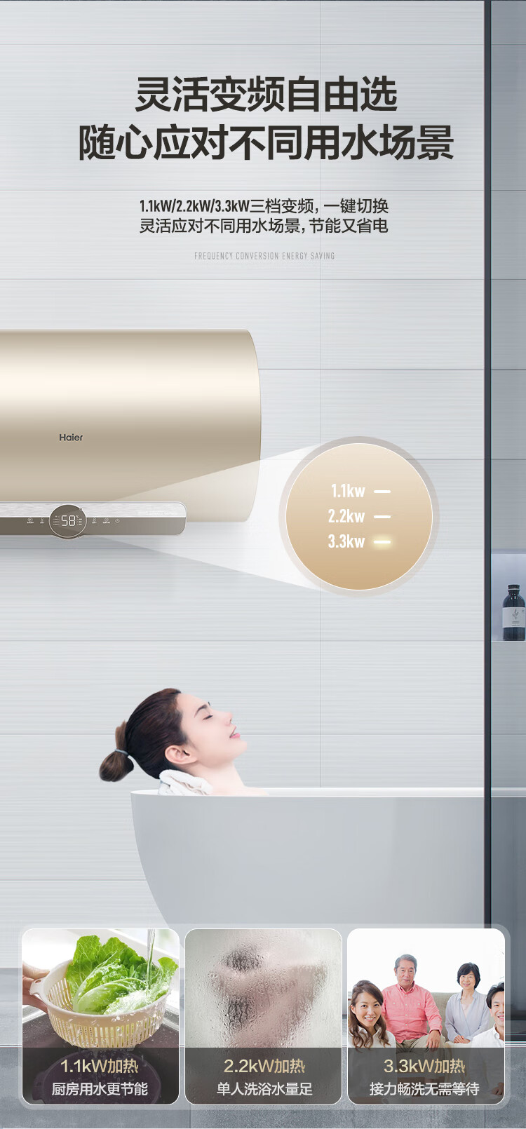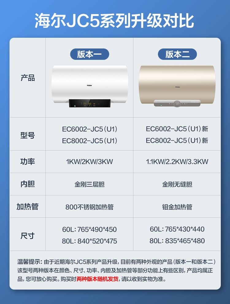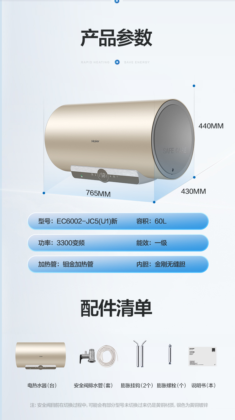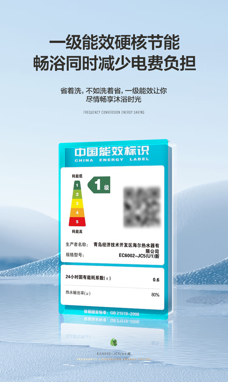 【海尔EC6002-JC5(U1)】海尔(Haier)60升电热水器 变频速热6倍增容80度高温健康沐浴智能远程操控EC6002-JC5(U1)新