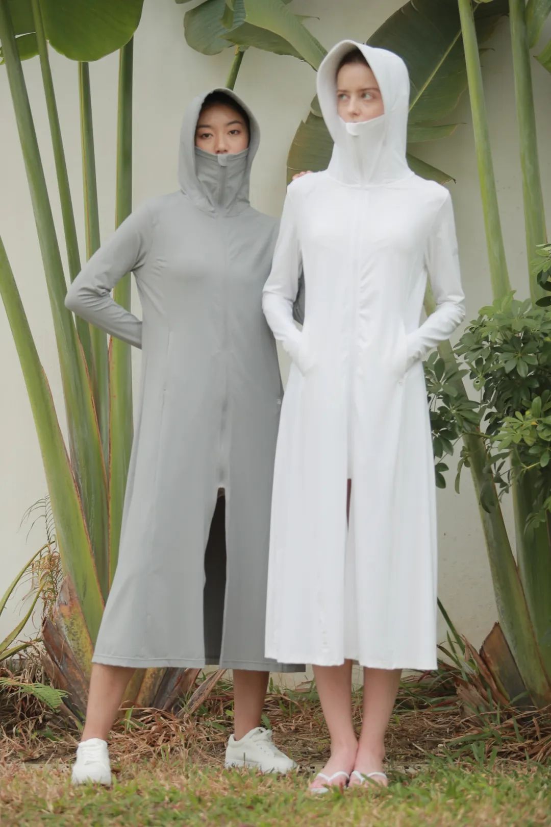 穿上这件防晒服,从头到上身包裹的严严实实的。