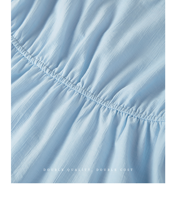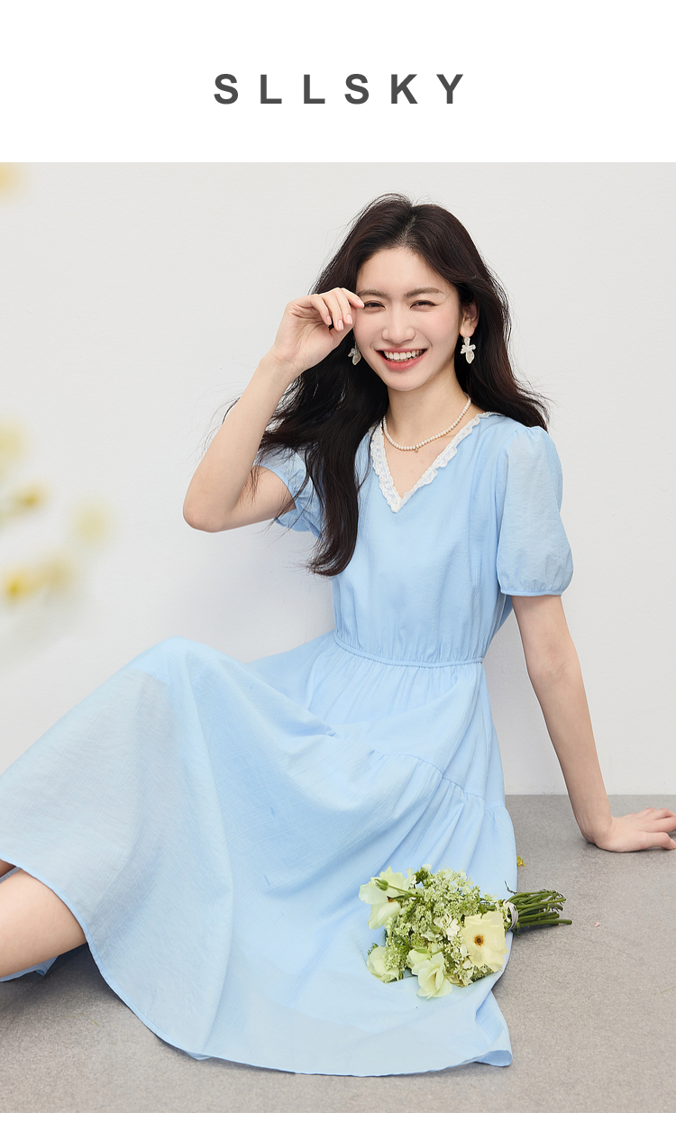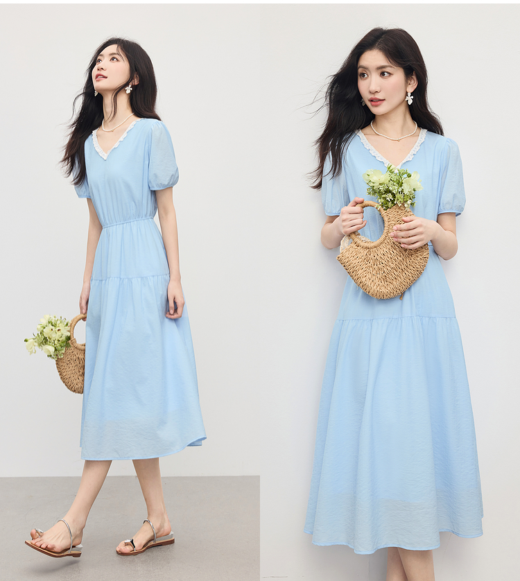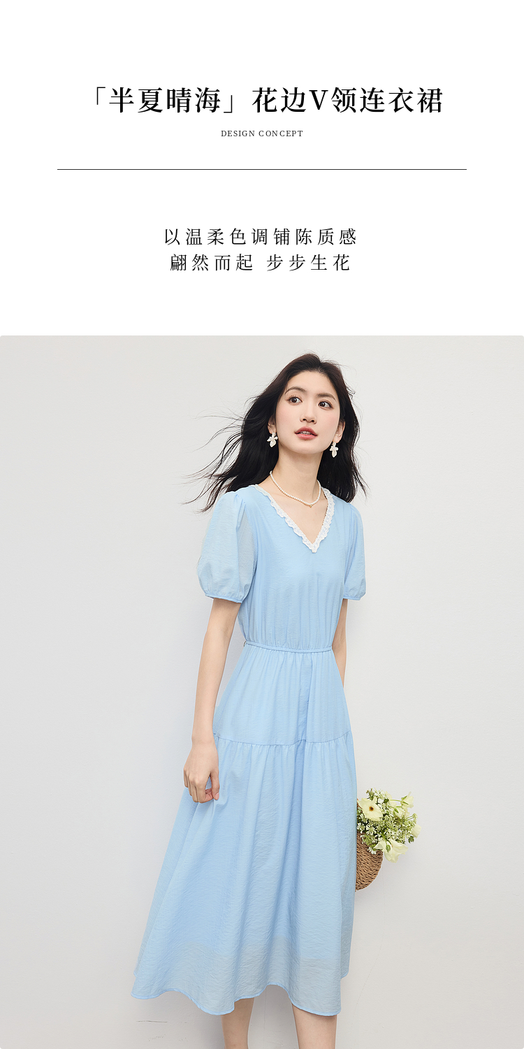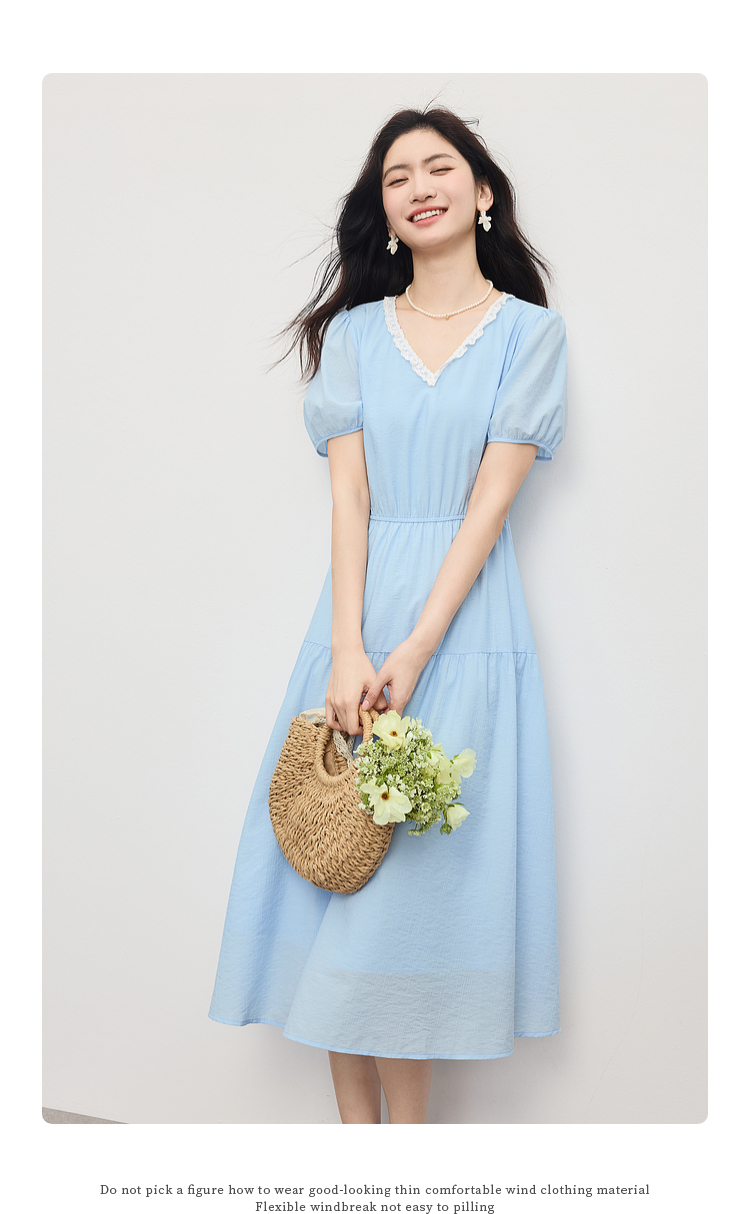 【专属特价】熙世界法式蕾丝花边V领连衣裙女2025夏季新款泡泡袖收腰蓝色裙子