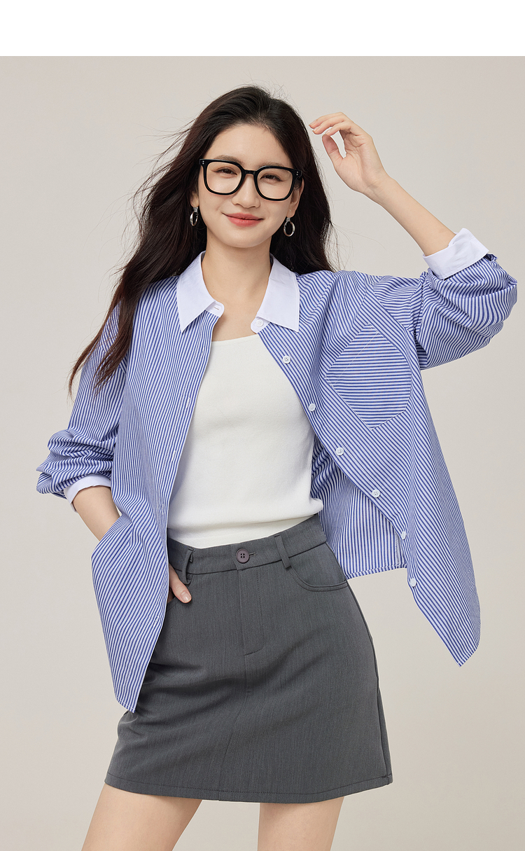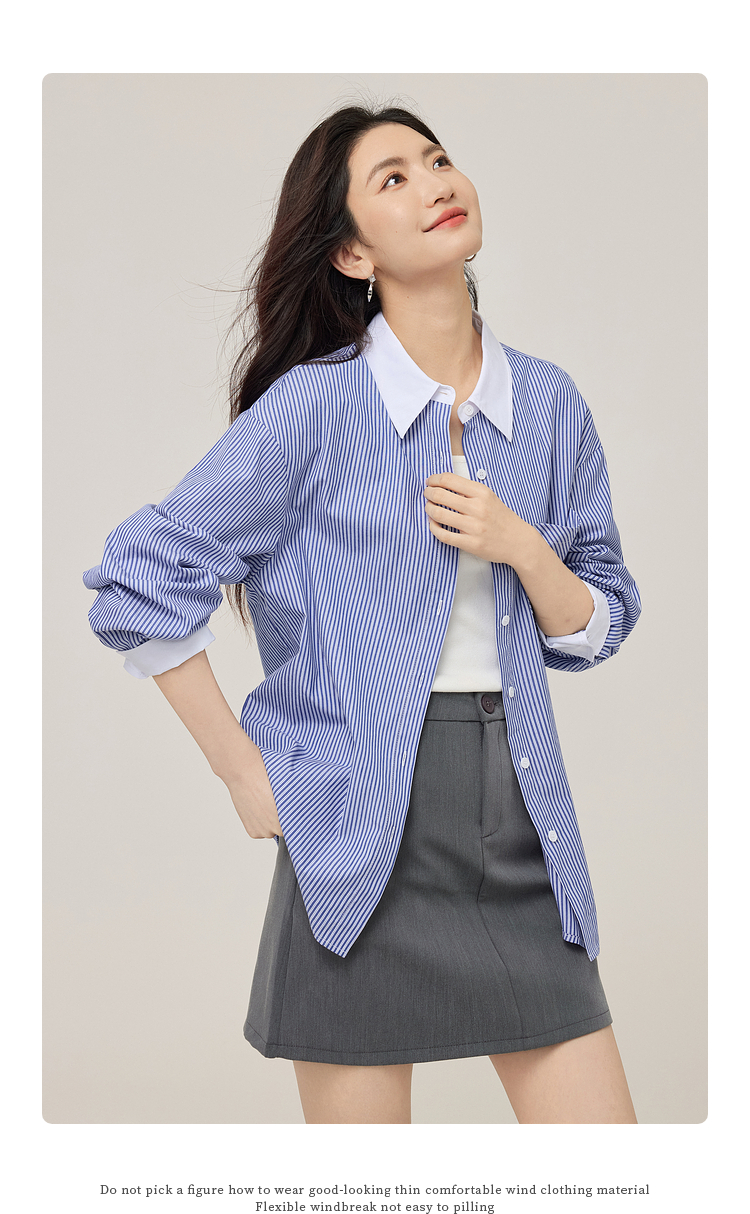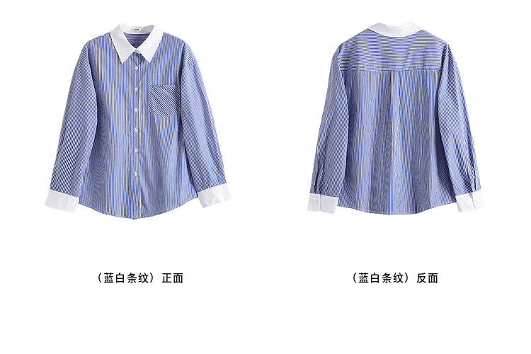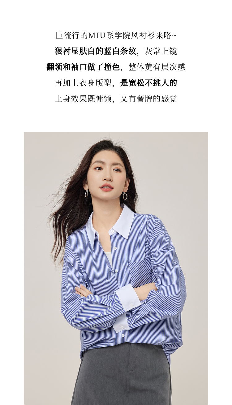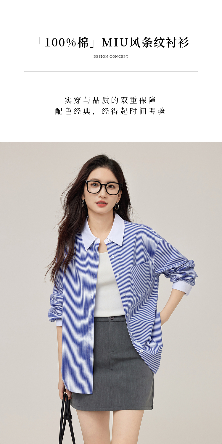 【周末秒杀】熙世界100%棉miu风条纹衬衫女2025春秋新款气质撞色翻领休闲上衣