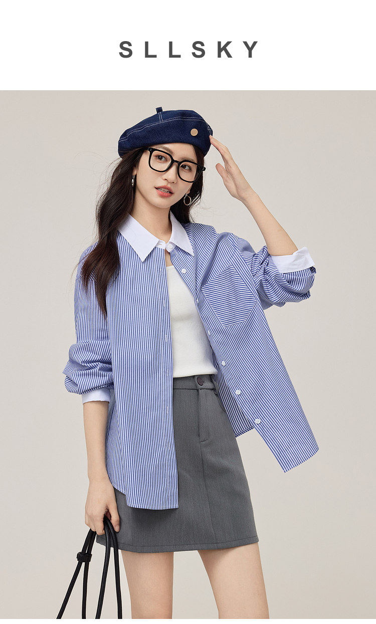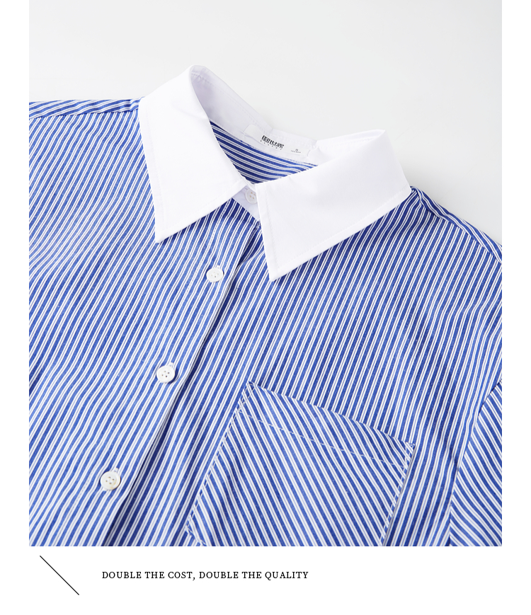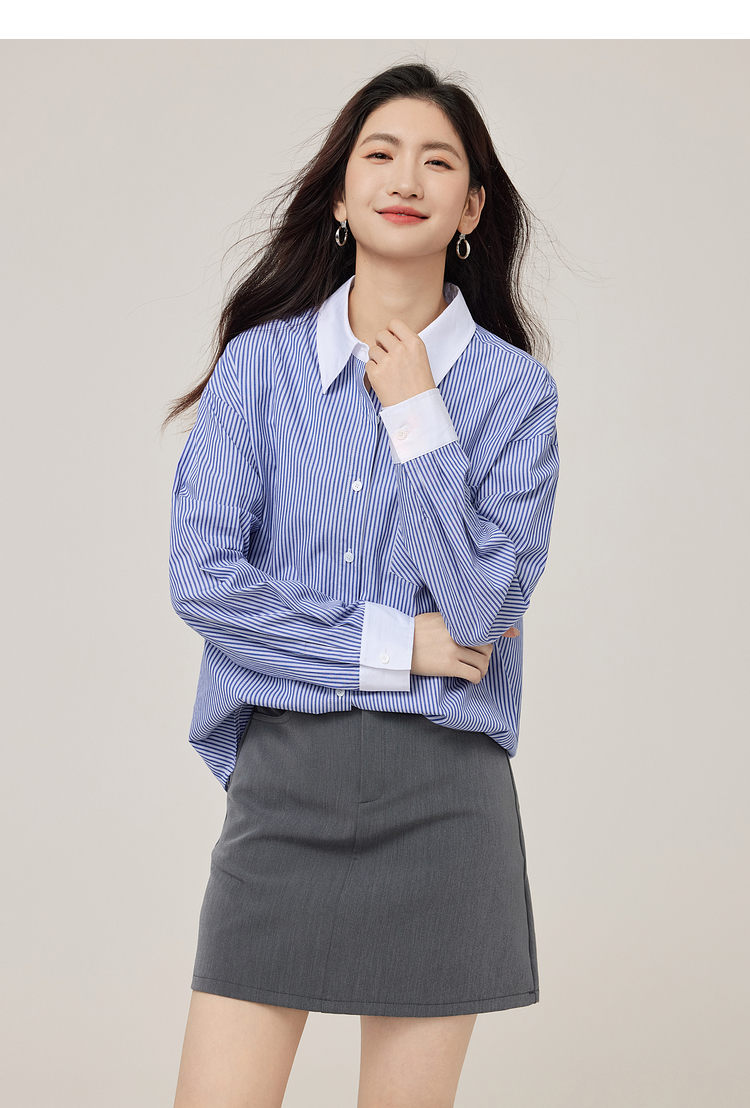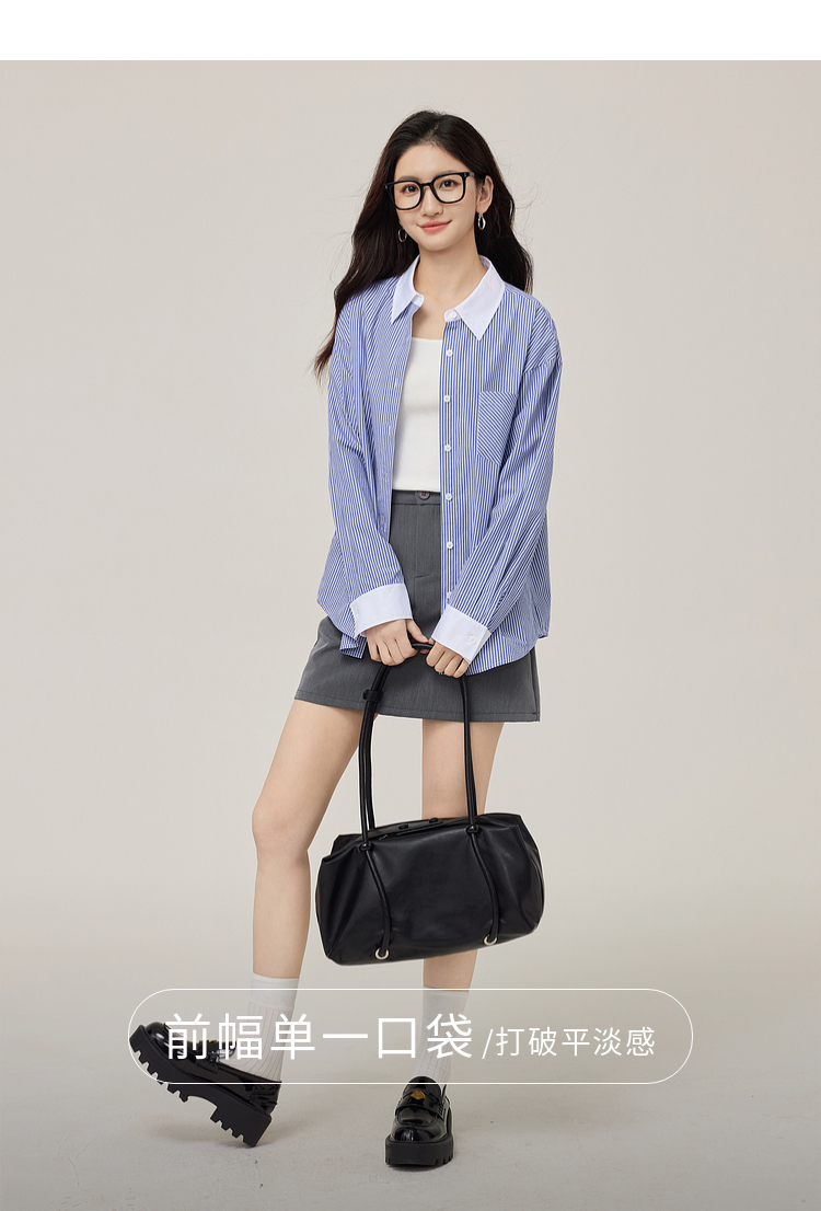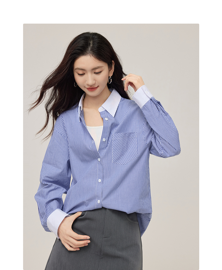 【周末秒杀】熙世界100%棉miu风条纹衬衫女2025春秋新款气质撞色翻领休闲上衣