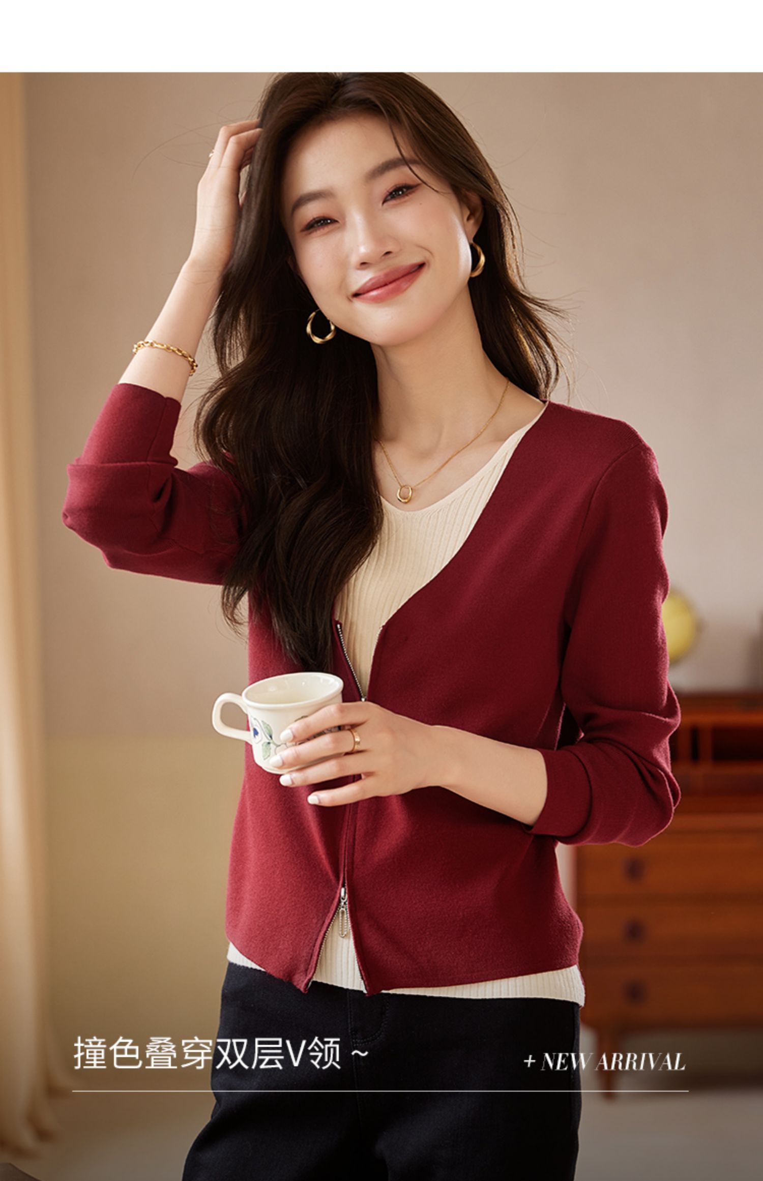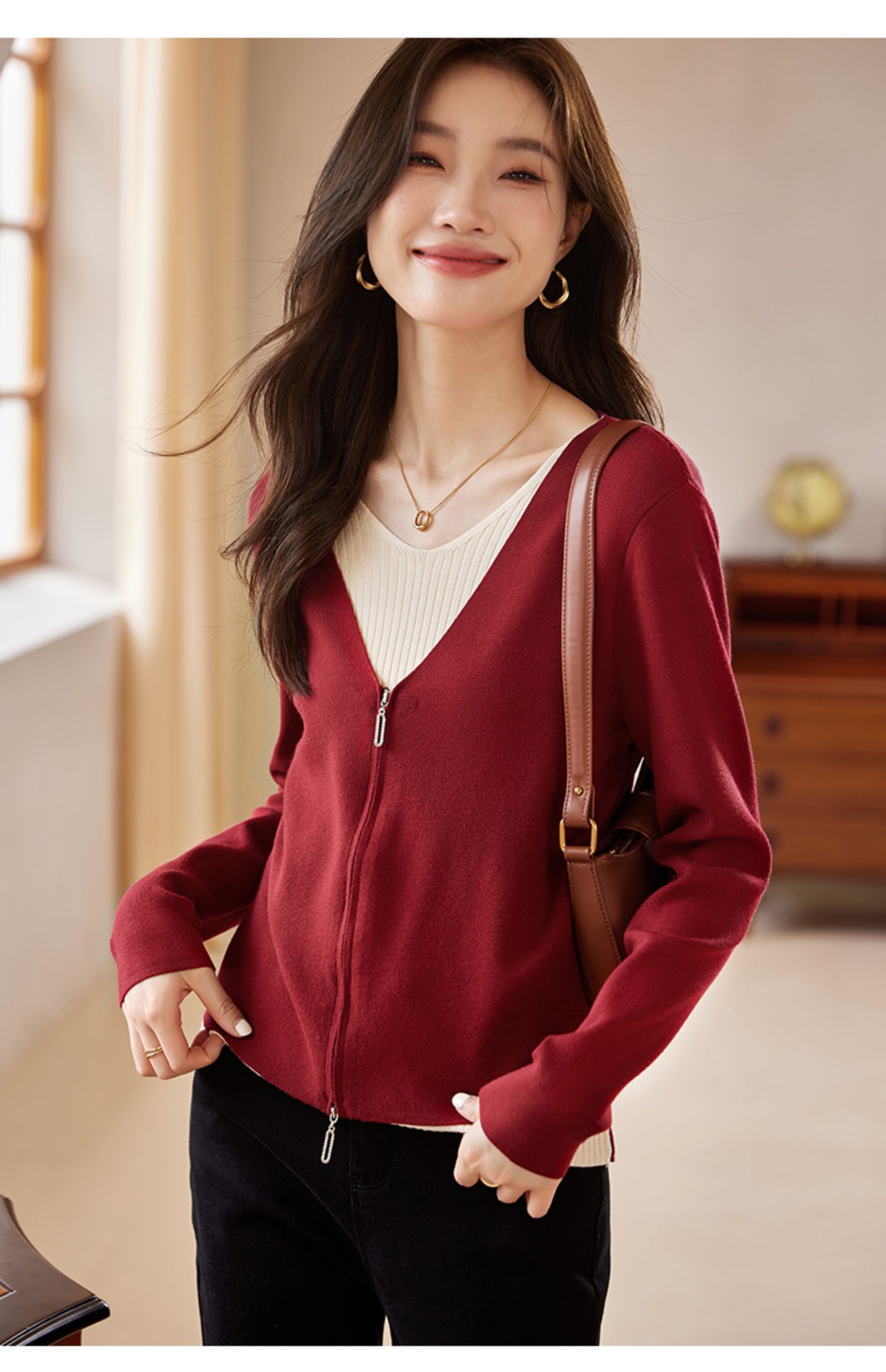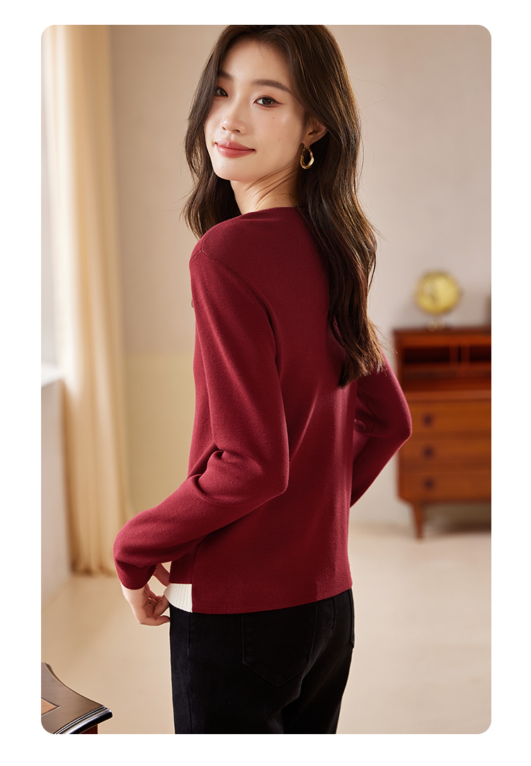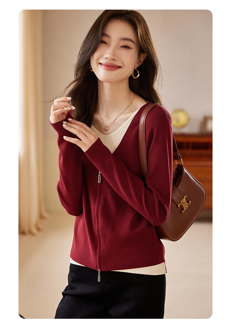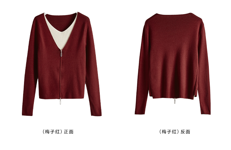 【年终特卖】熙世界设计感撞色叠穿V领假两件复古红针织衫上衣女秋
