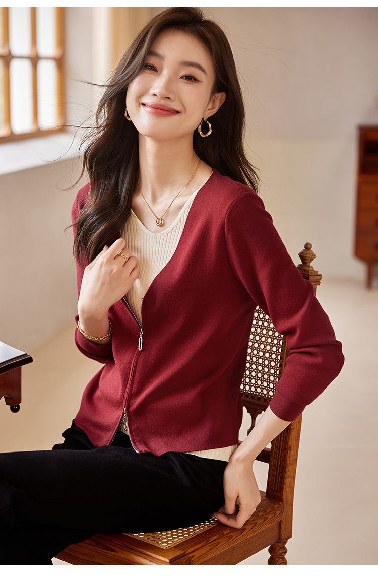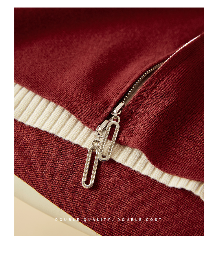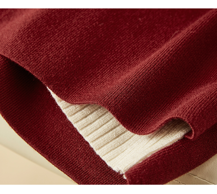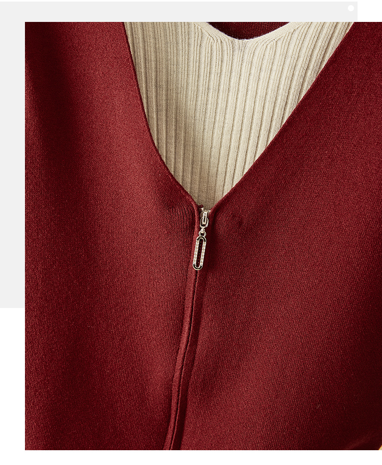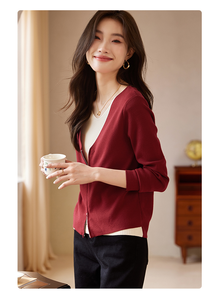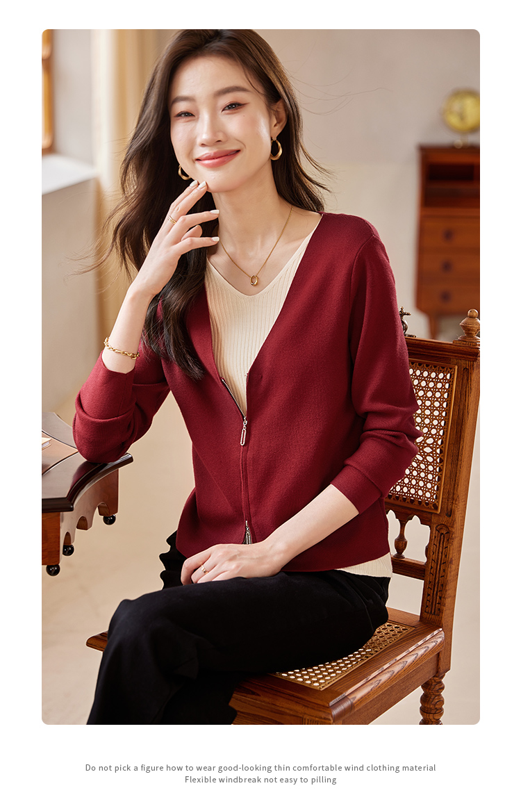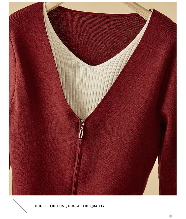 【年终特卖】熙世界设计感撞色叠穿V领假两件复古红针织衫上衣女秋