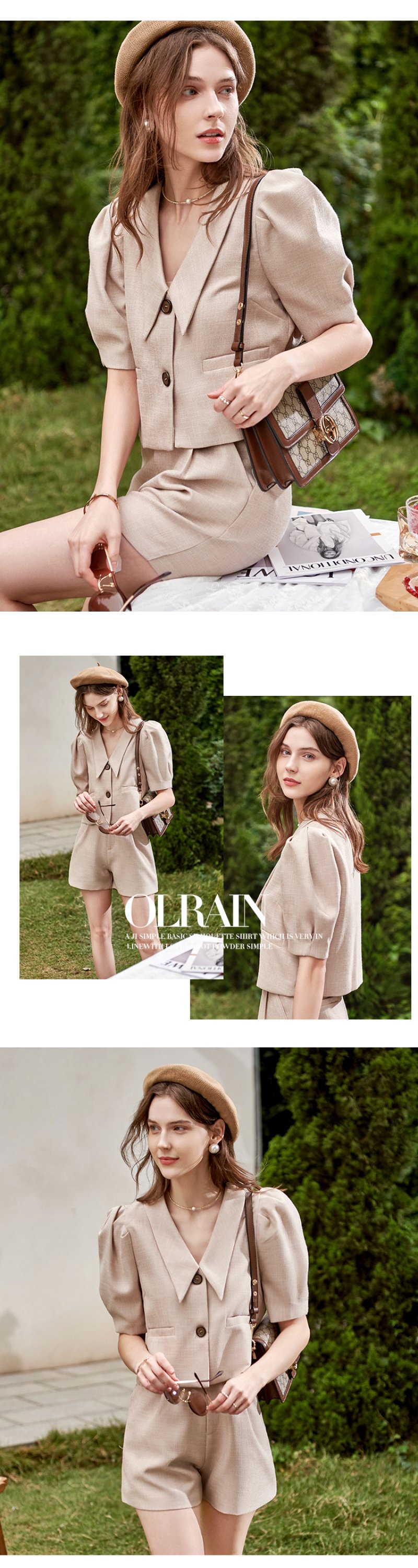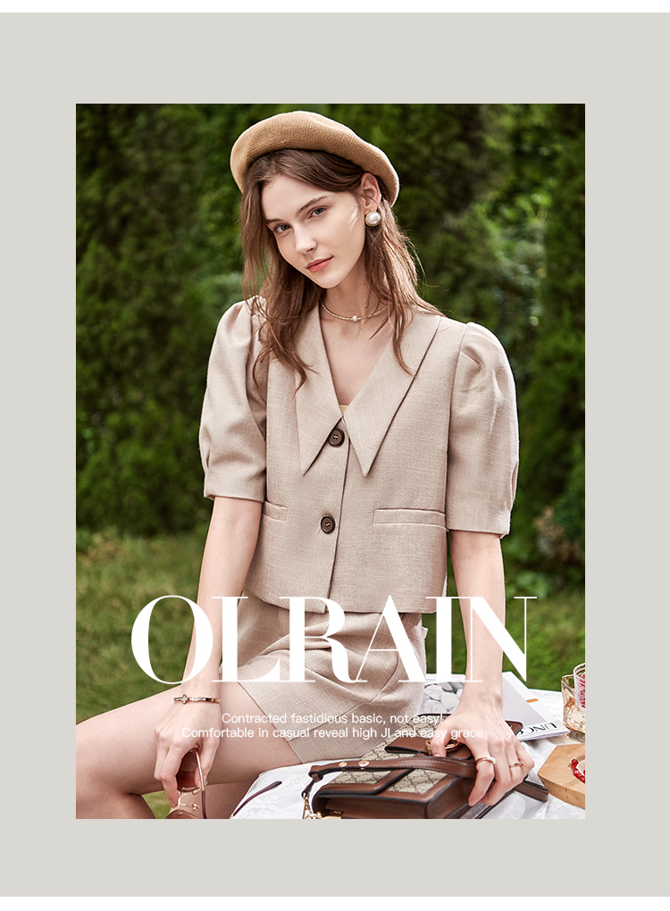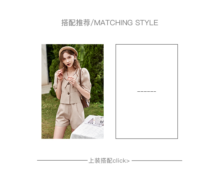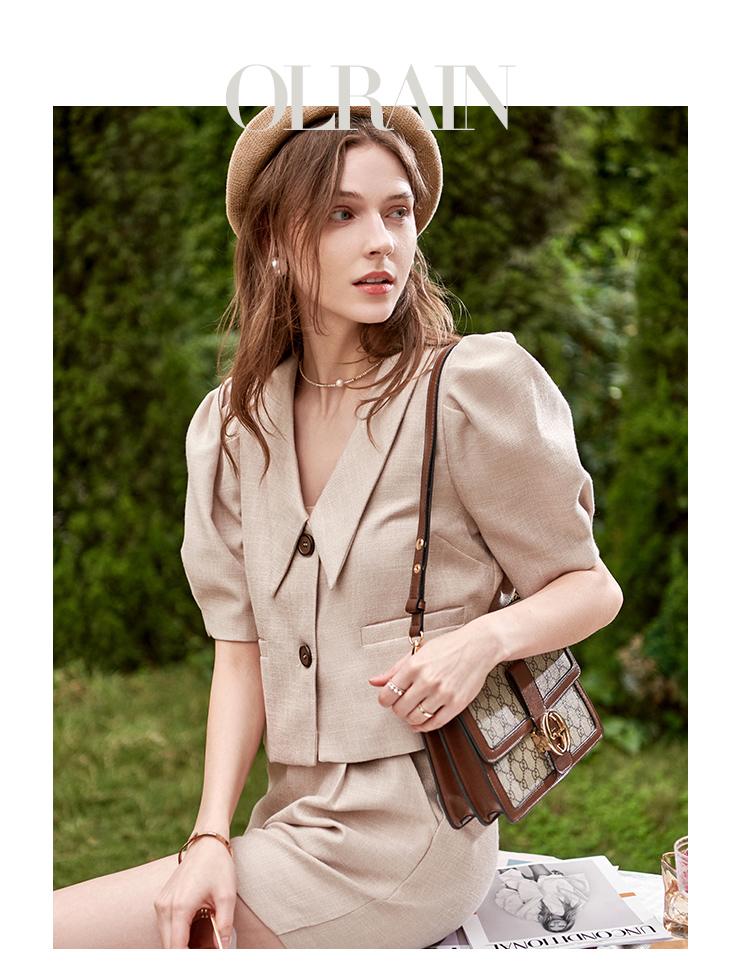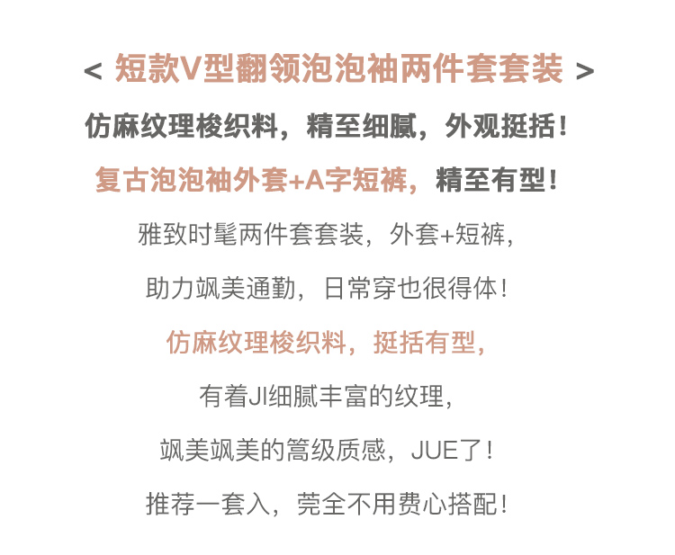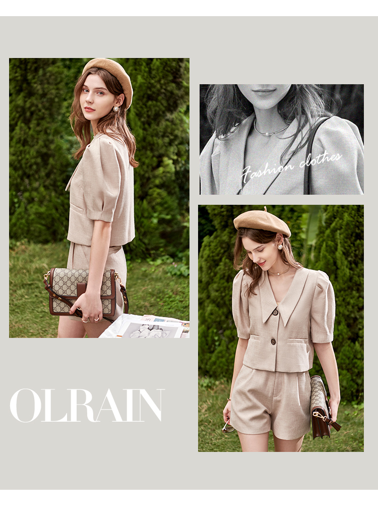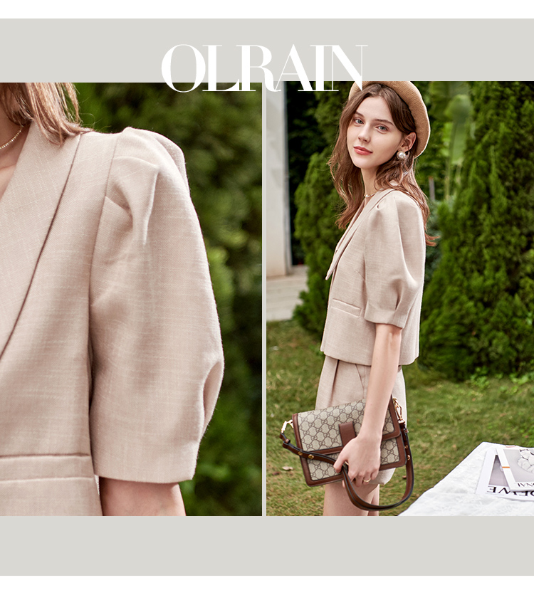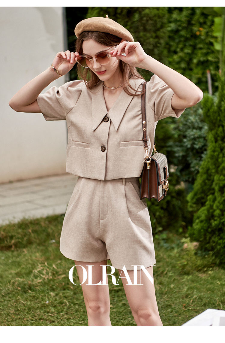 欧芮儿时尚套装春2021年新款女复古泡泡袖外套+A字时髦短裤两件套