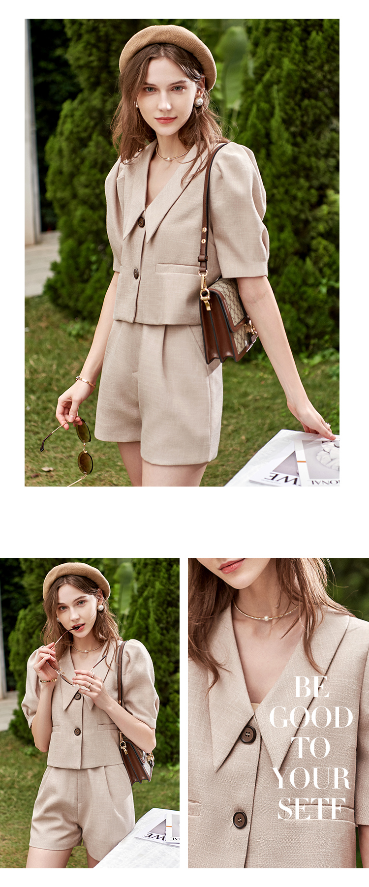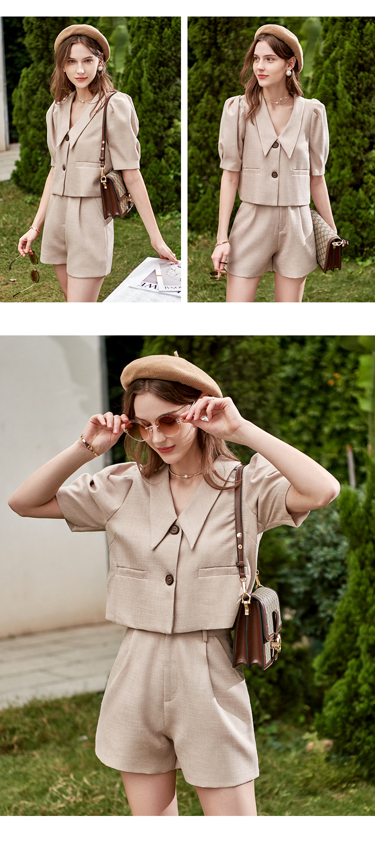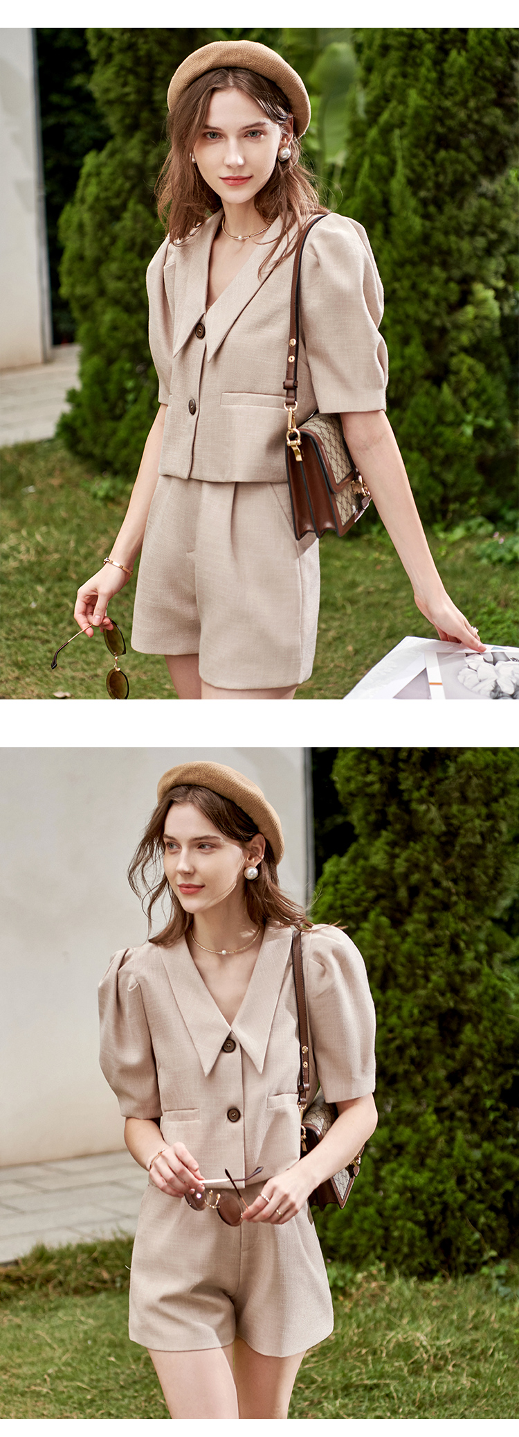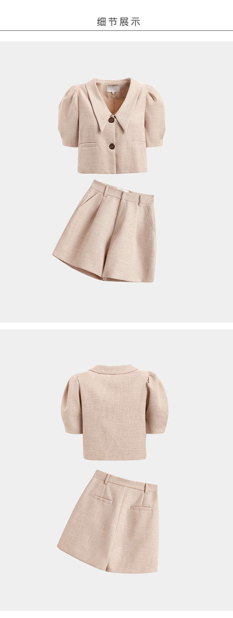 欧芮儿时尚套装春2021年新款女复古泡泡袖外套+A字时髦短裤两件套