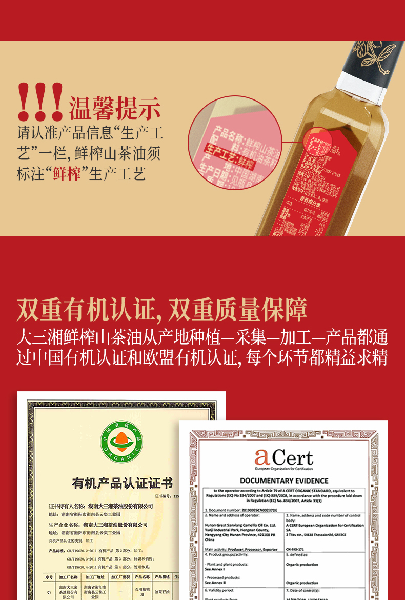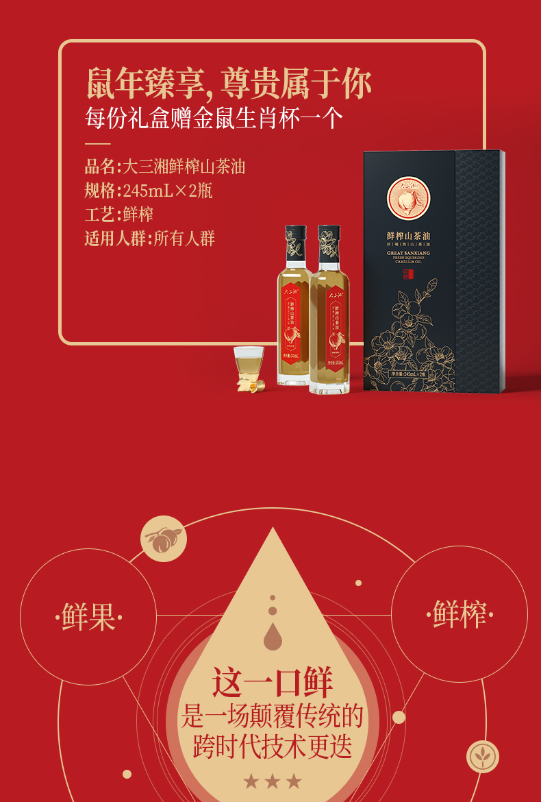 大三湘山茶油特级鲜榨有机茶油商务礼盒装 245ml*2