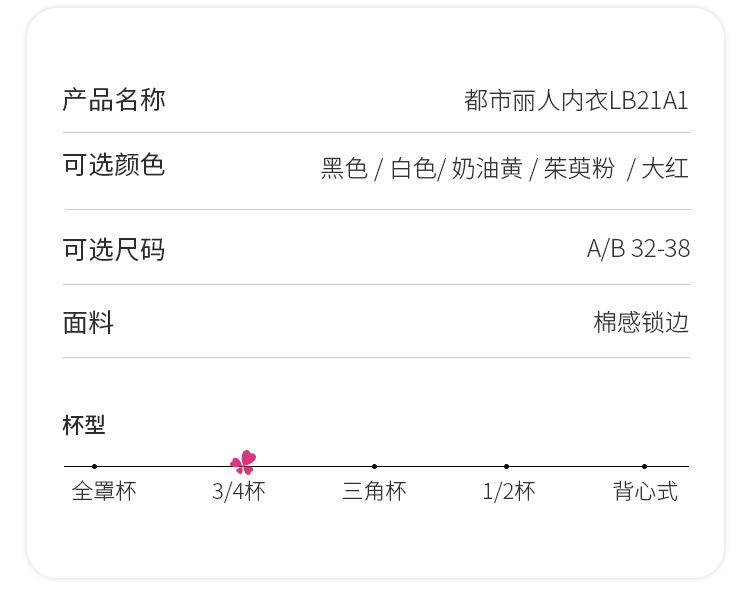 都市丽人AB杯内衣棉感锁边A:中厚B:薄3/4杯文胸三排扣树脂胶圈LB21A1