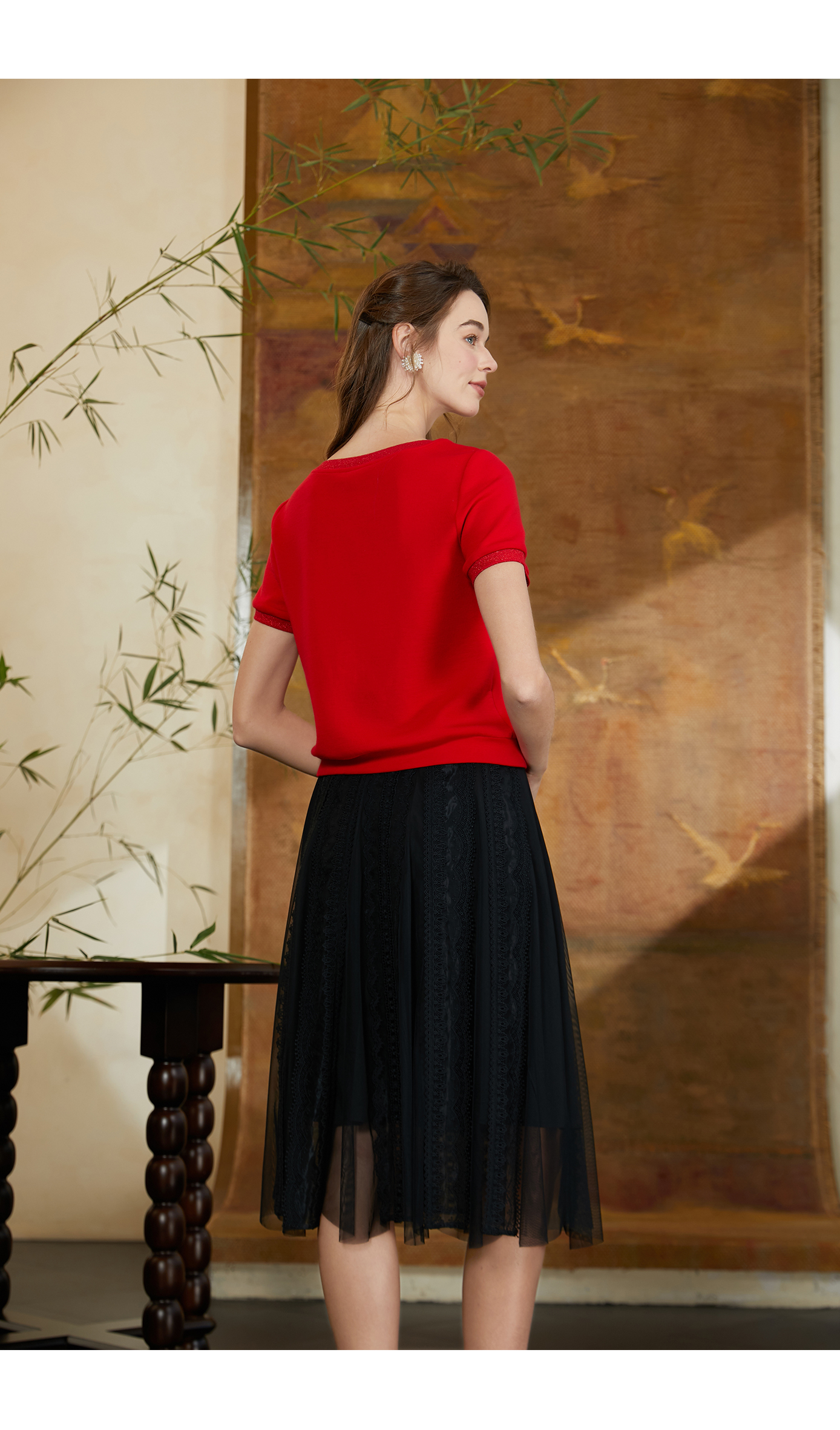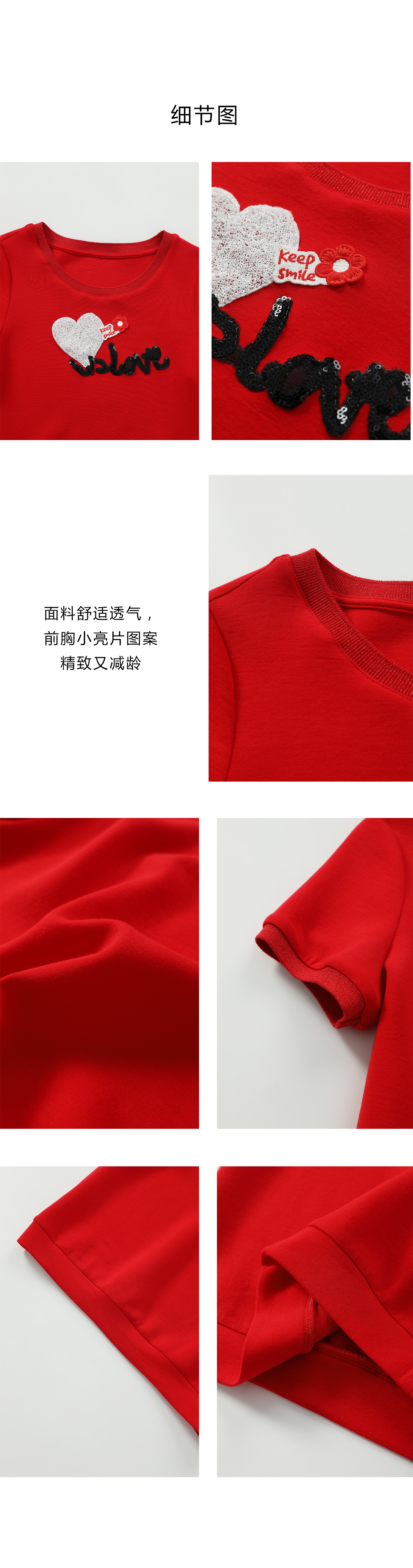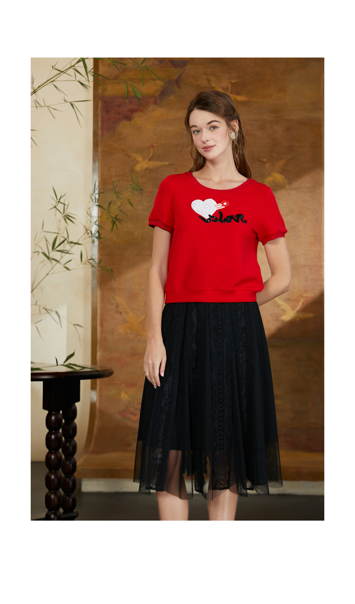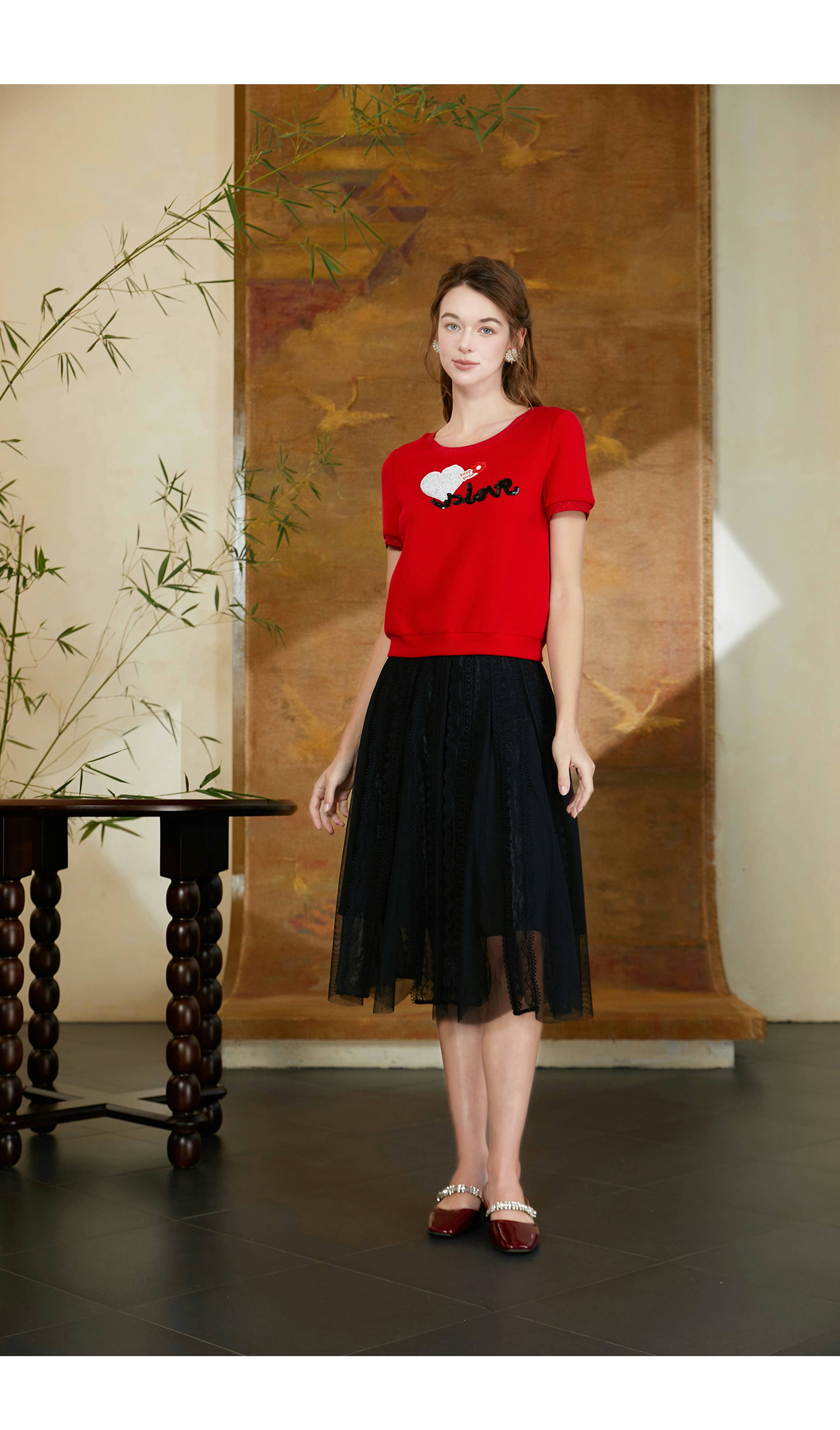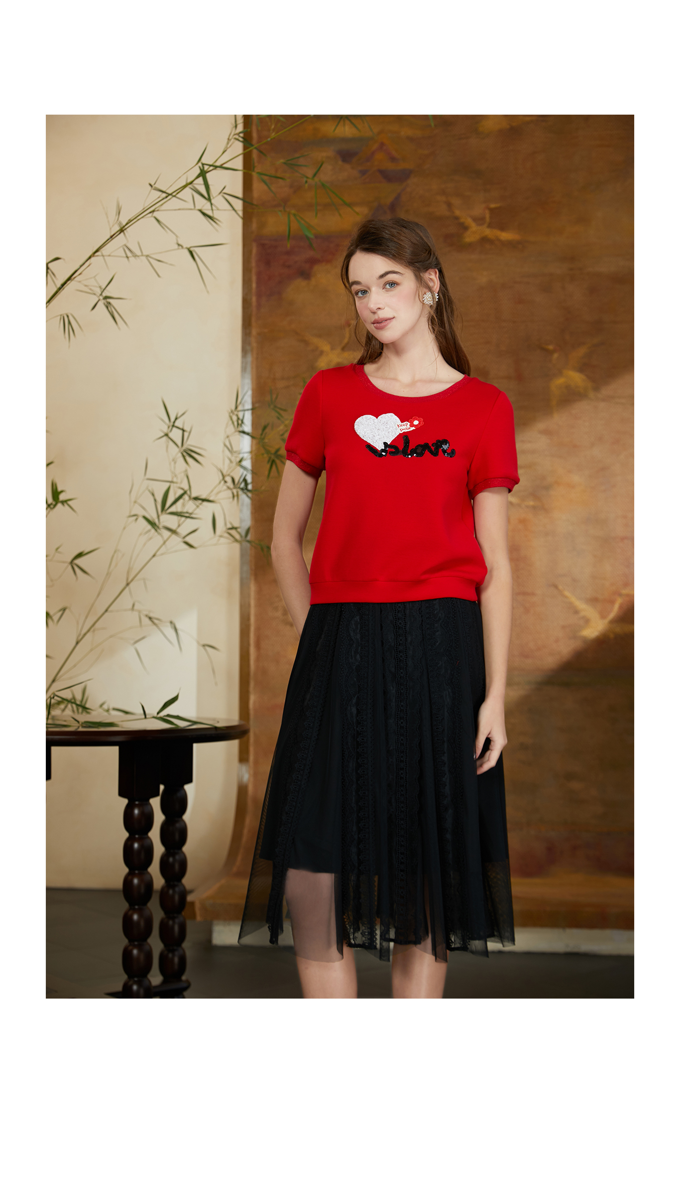 司歌针织弹力绣花圆领T恤短袖女宽松F911058Y