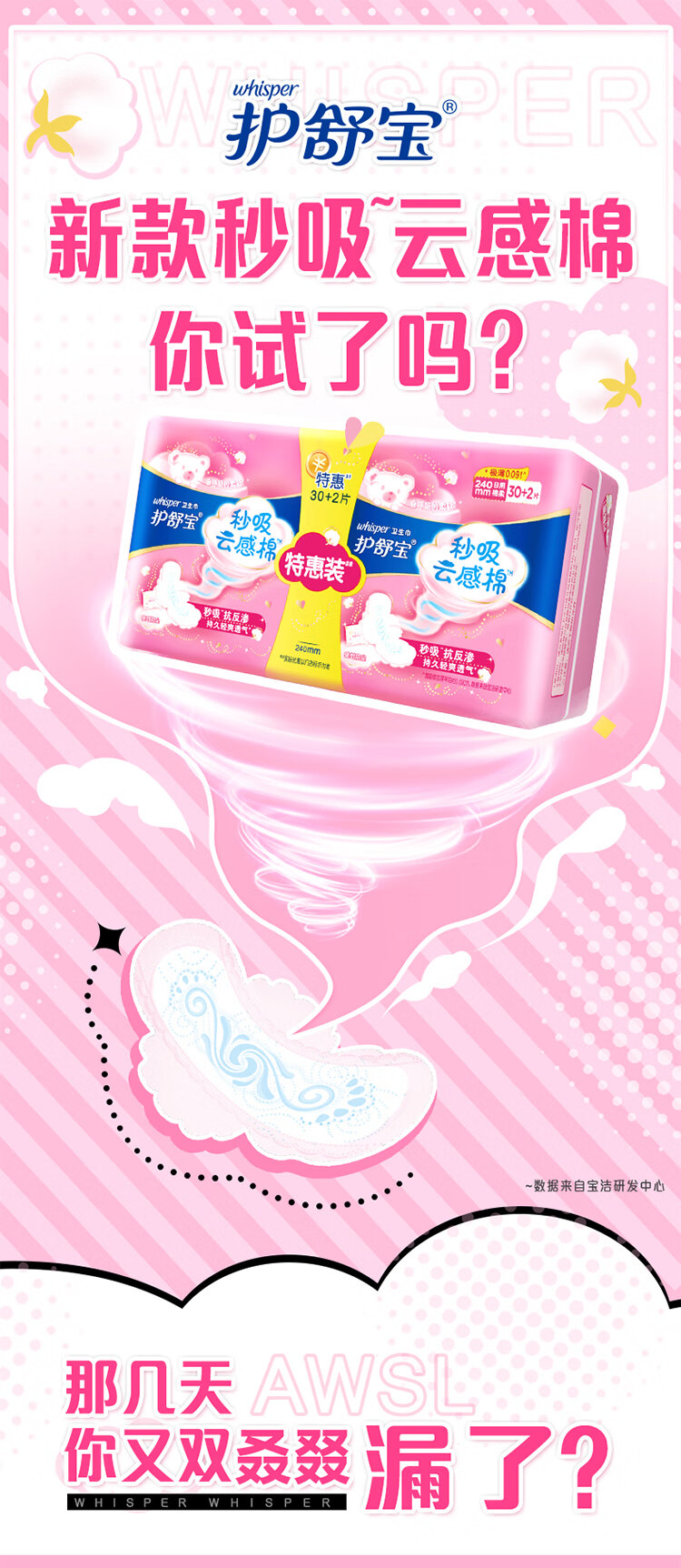 护舒宝瞬洁云感棉极薄日用卫生巾240mm 30+2片/包