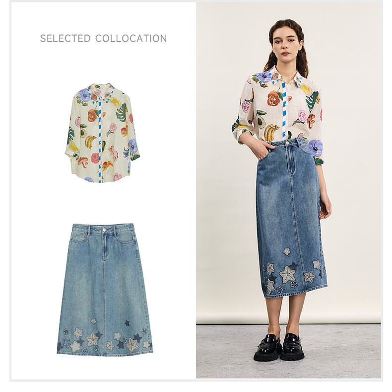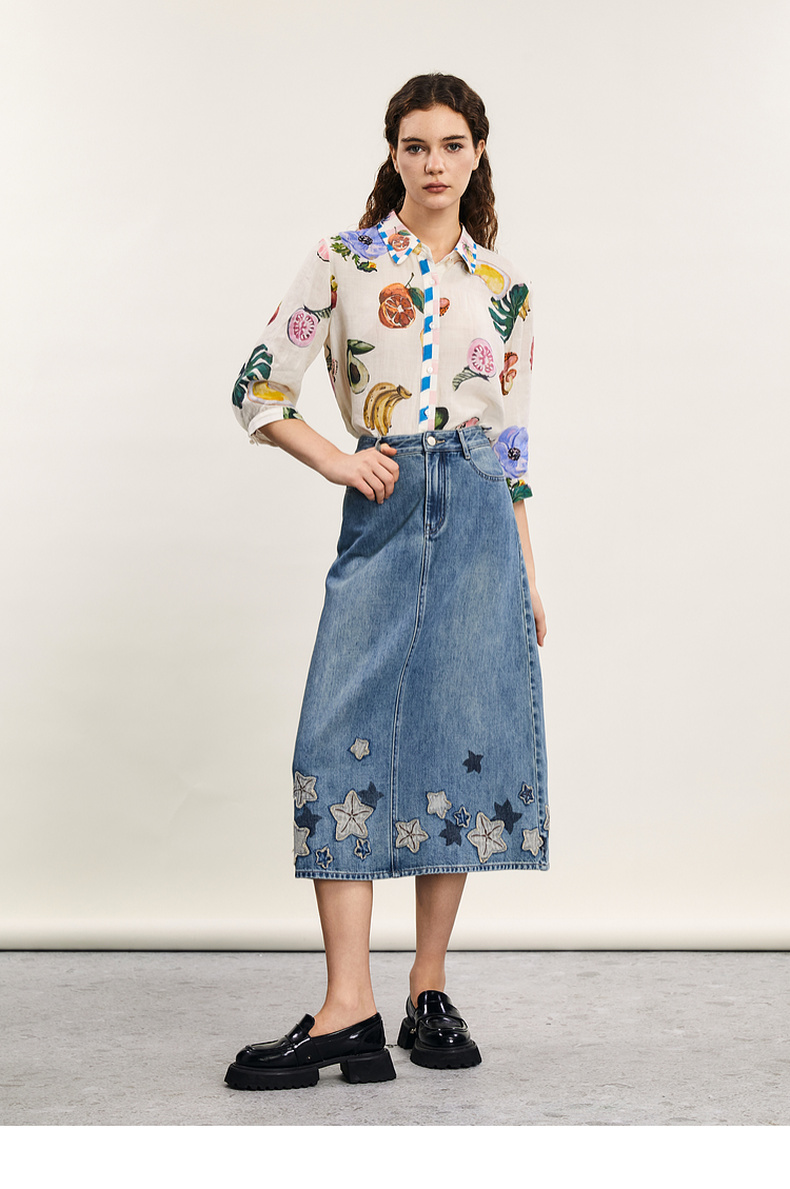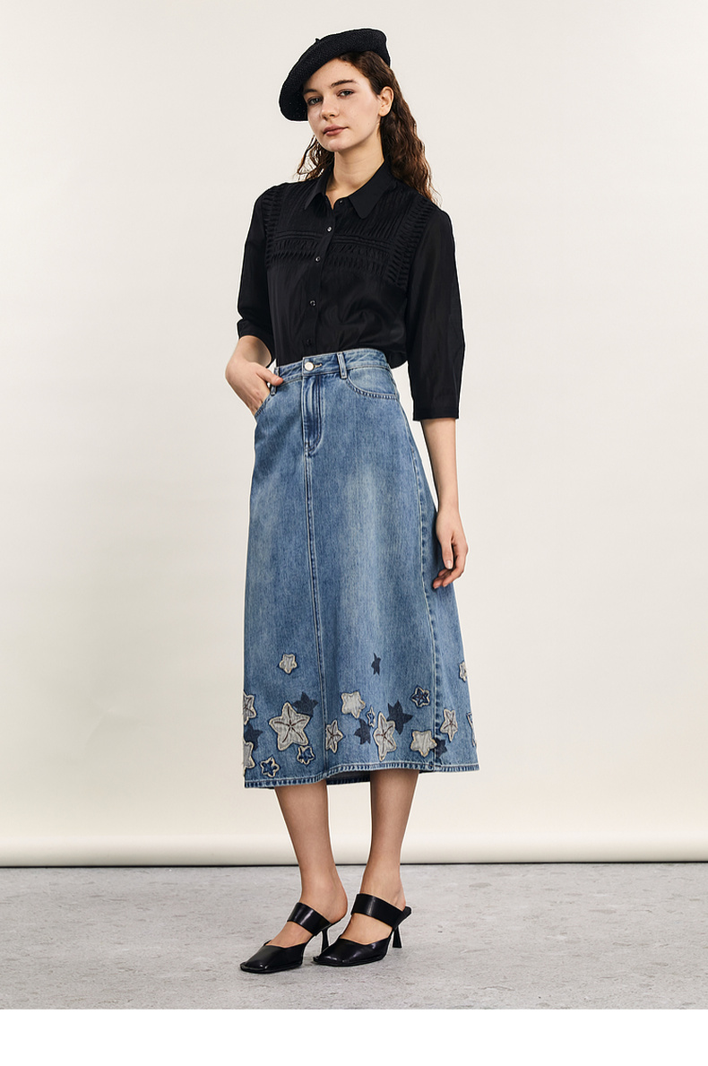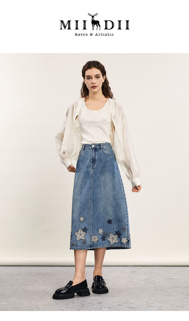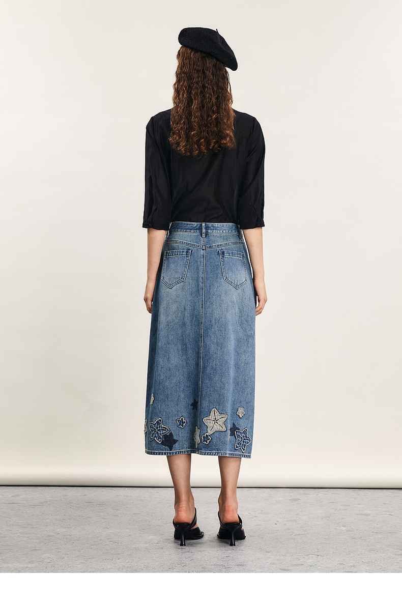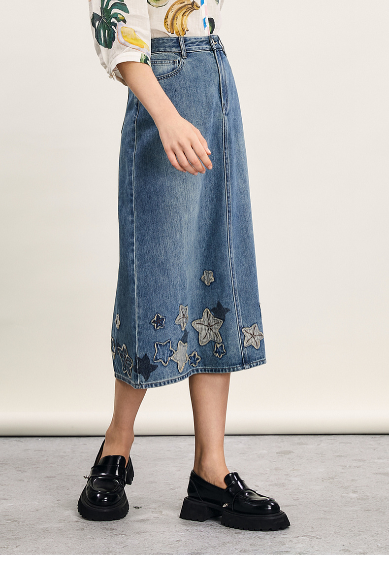 谜底牛仔半身裙2024年夏季新品复古绣花百搭高腰中长裙242MB0546