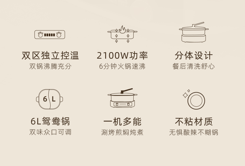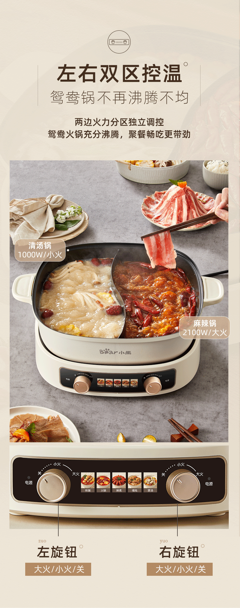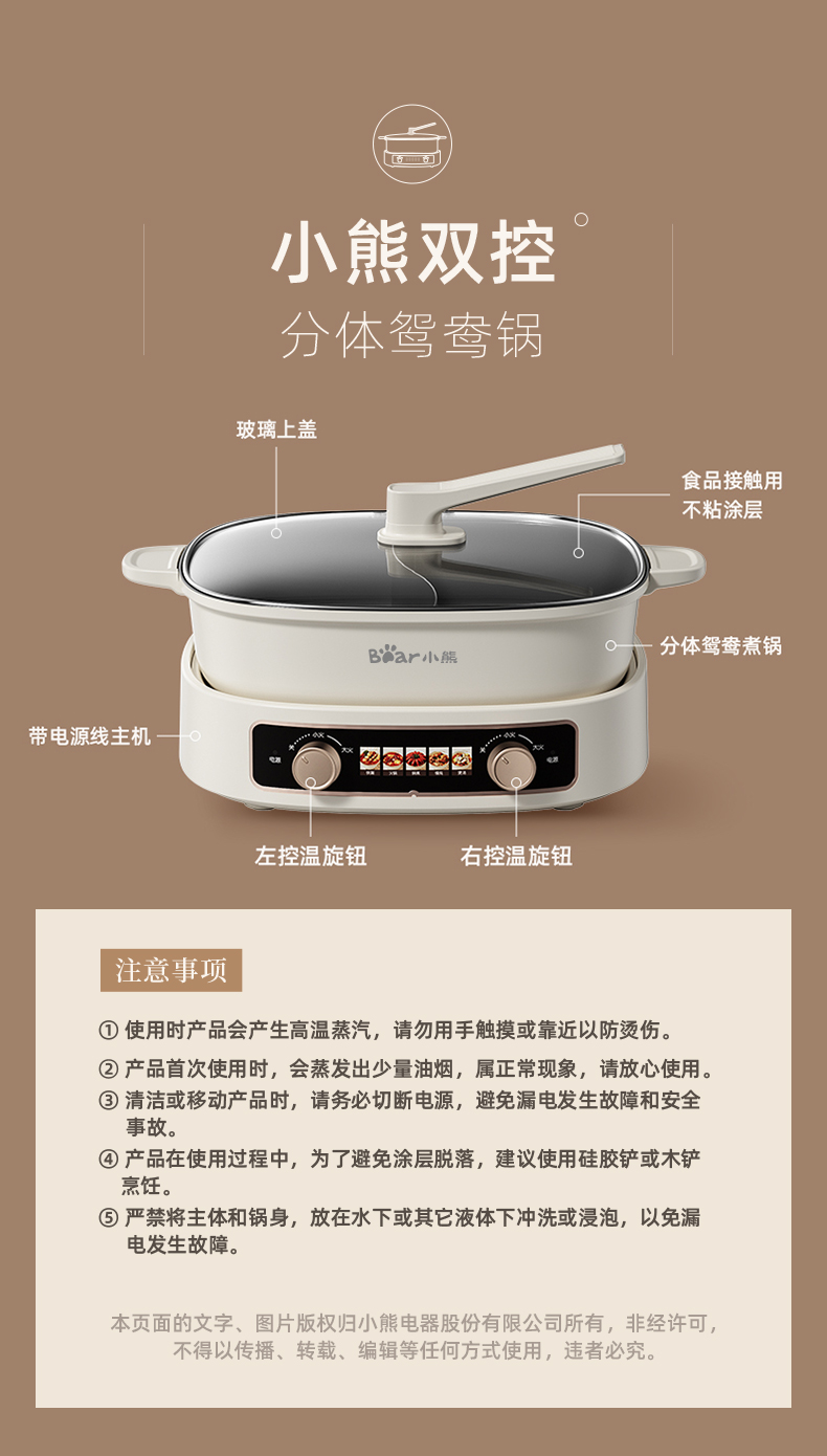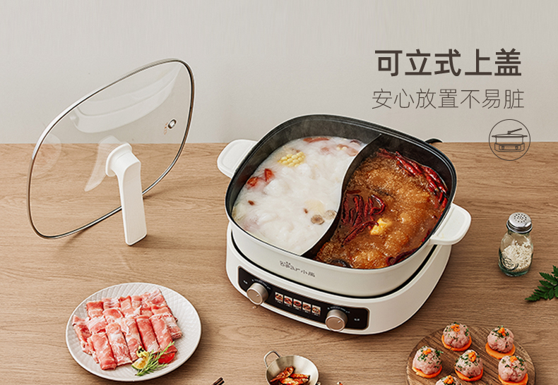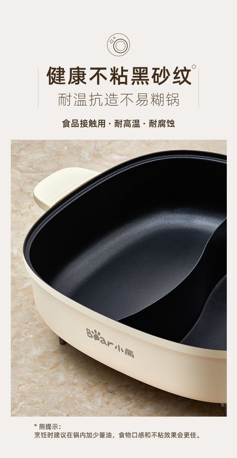 小熊鸳鸯电火锅家用多功能电炒菜锅电热煮锅2100W米白色6L