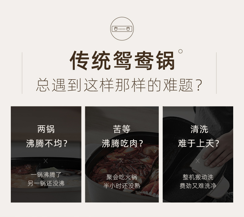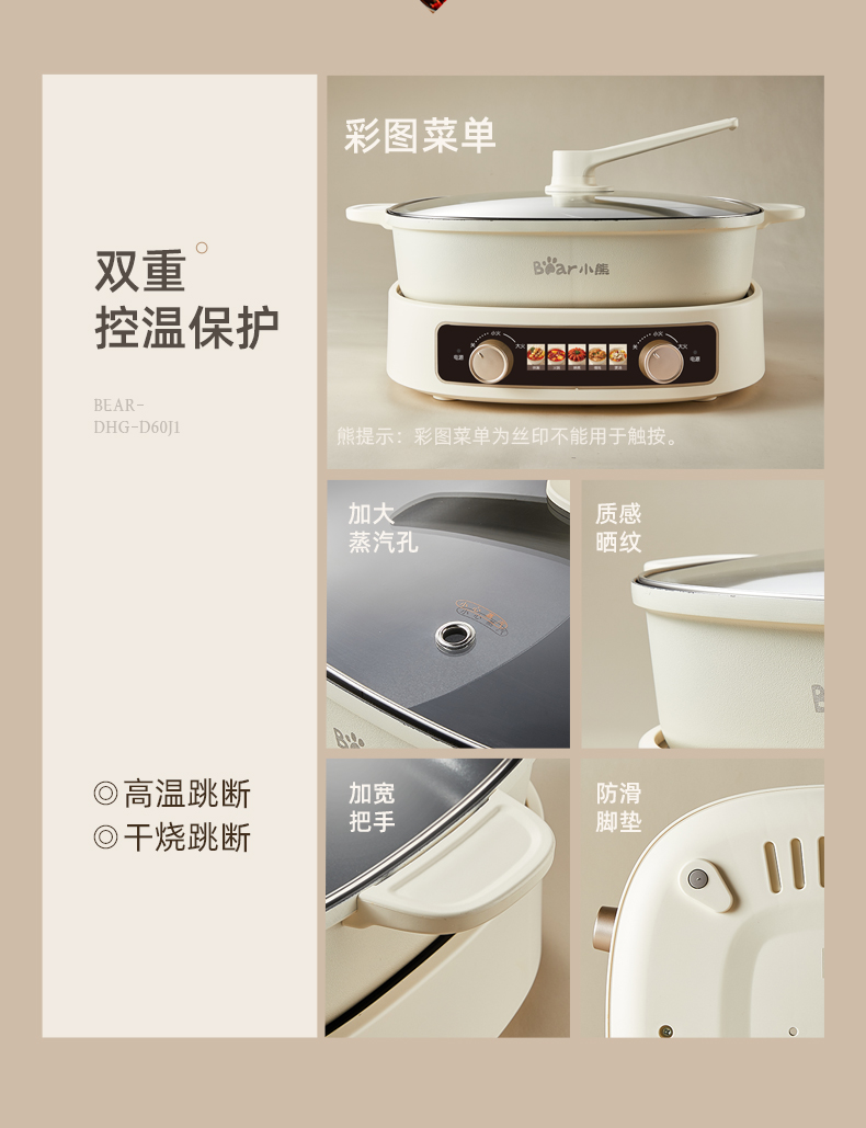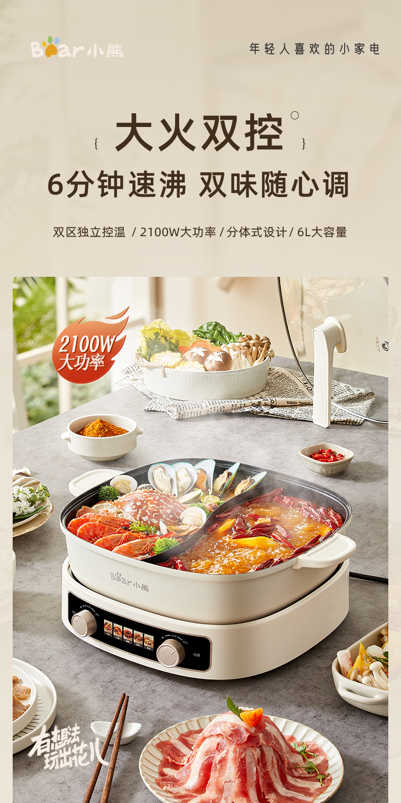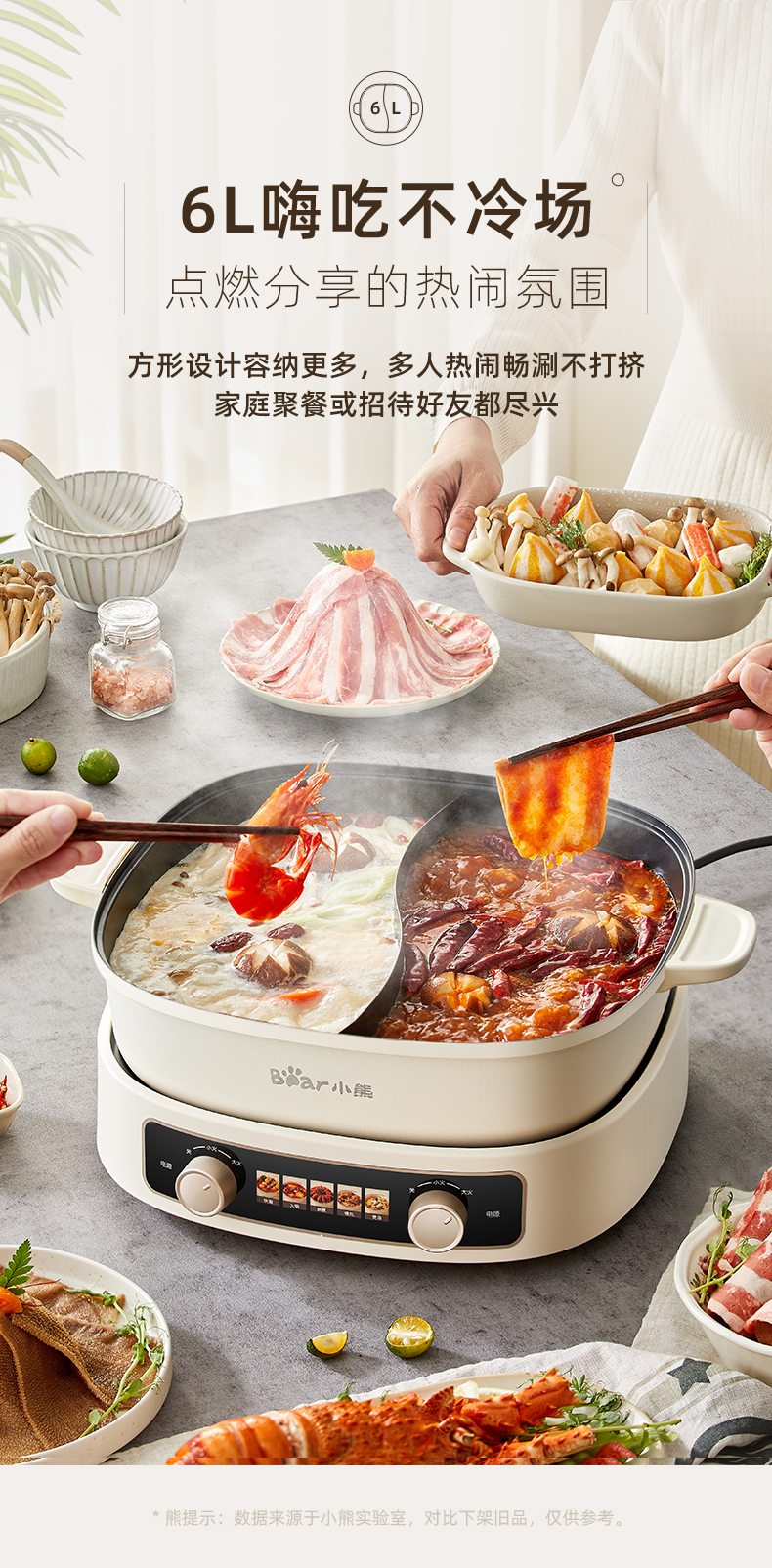 小熊鸳鸯电火锅家用多功能电炒菜锅电热煮锅2100W米白色6L