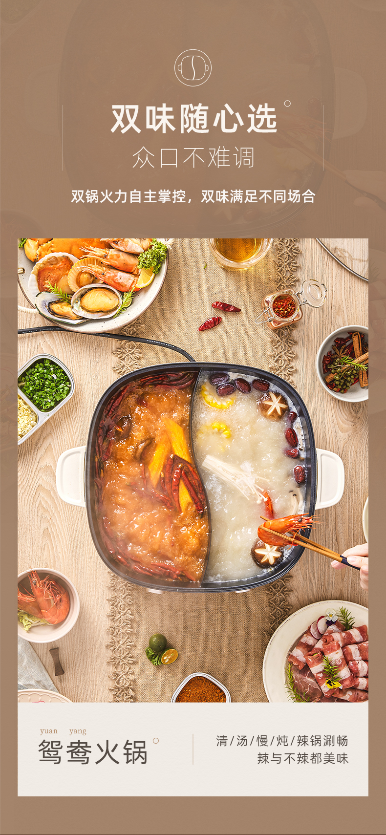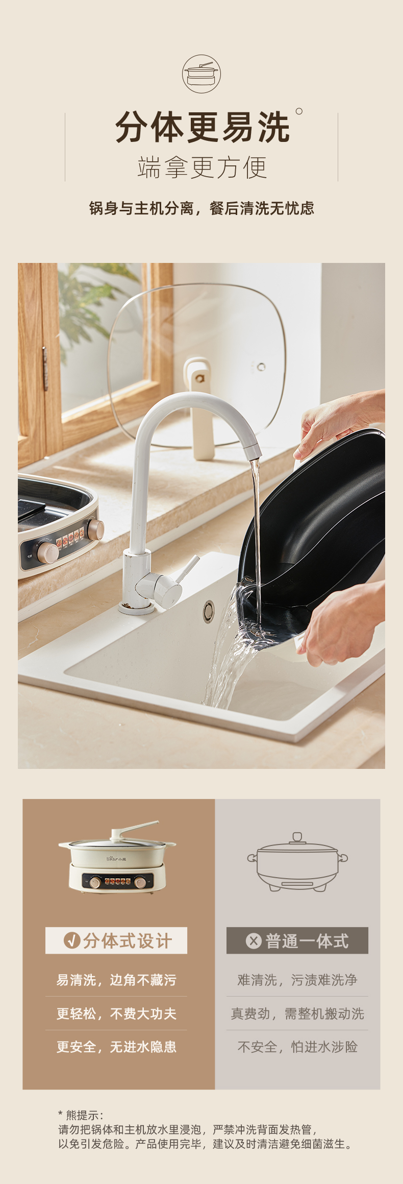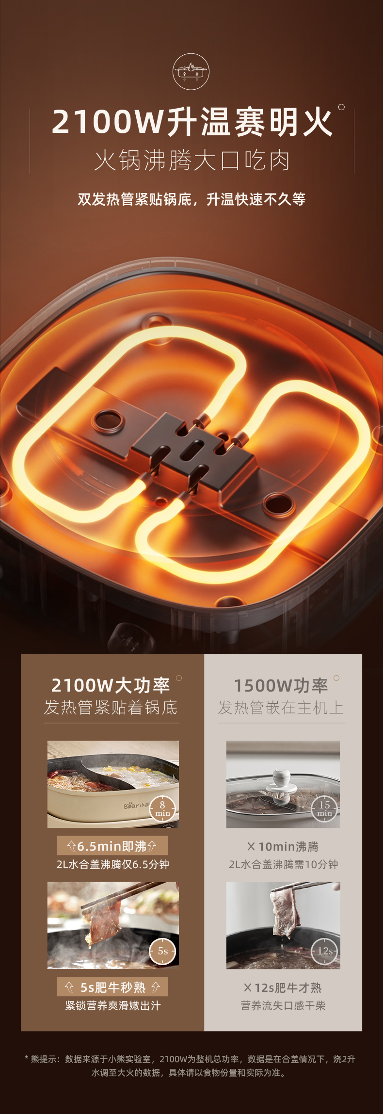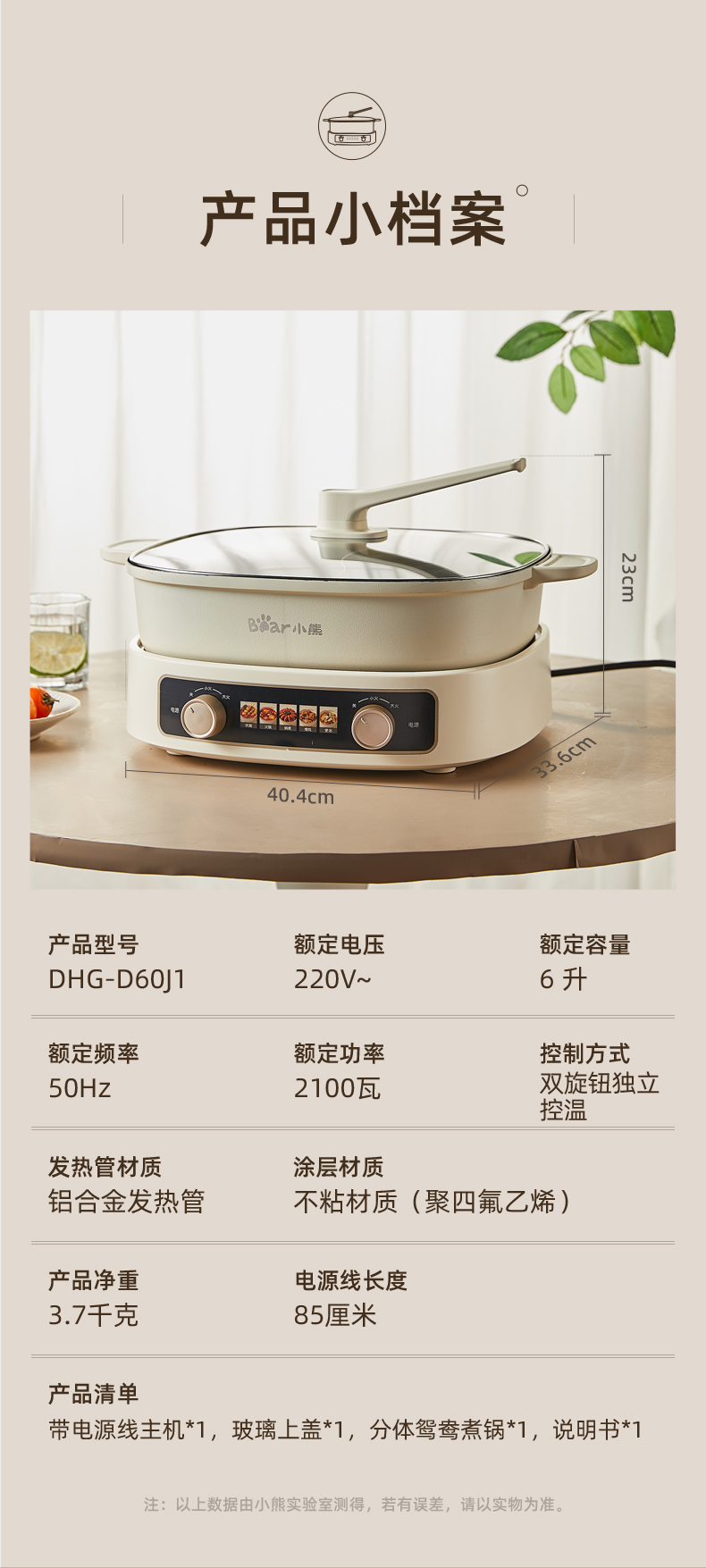 小熊鸳鸯电火锅家用多功能电炒菜锅电热煮锅2100W米白色6L