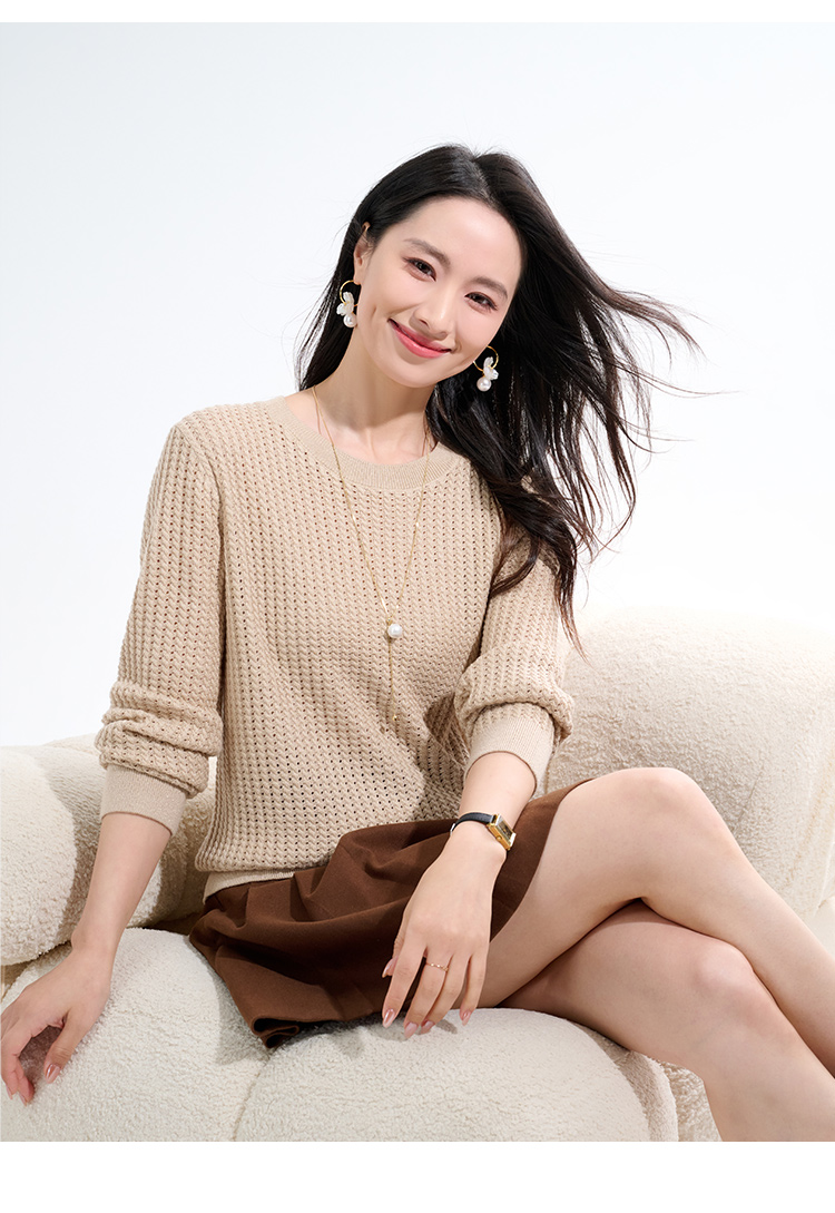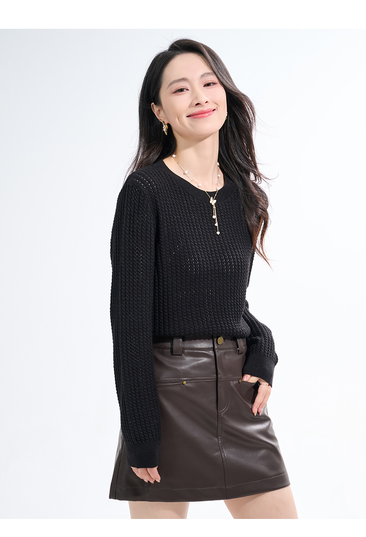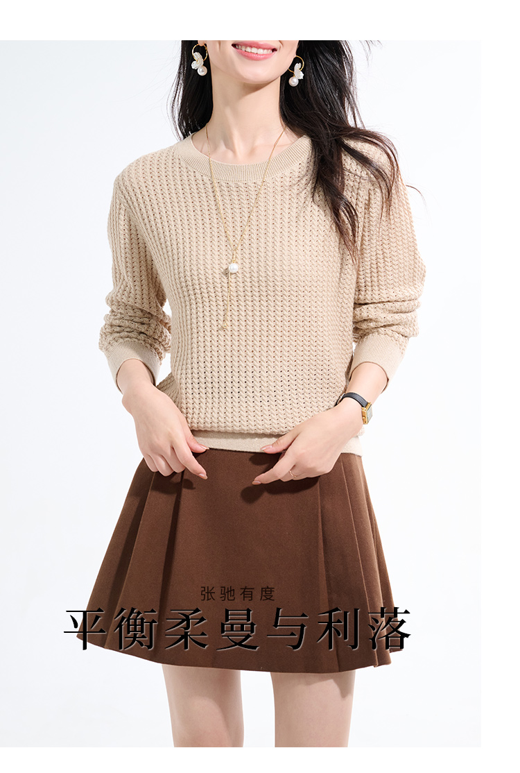 罗蒙秋冬针织衫女士优雅舒适绞花镂空设计圆领长袖保暖配裙子打底上衣女