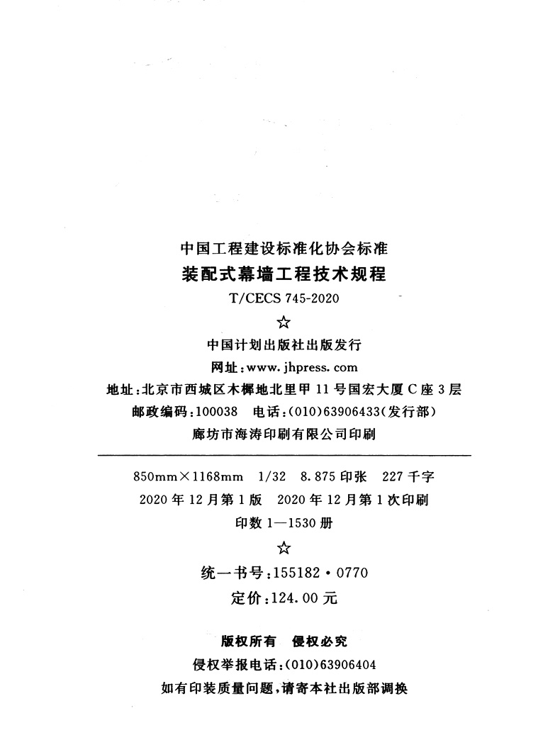 书名:T/CECS 745-2020 装配式幕墙工程技术规程