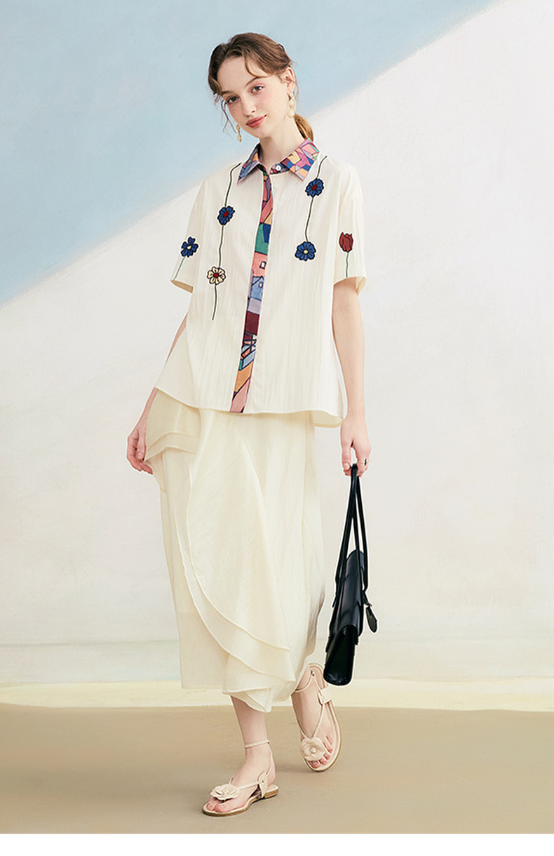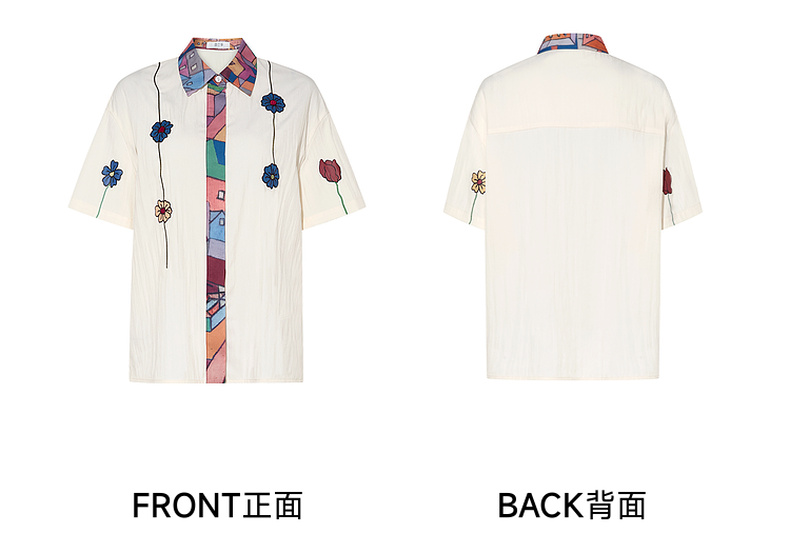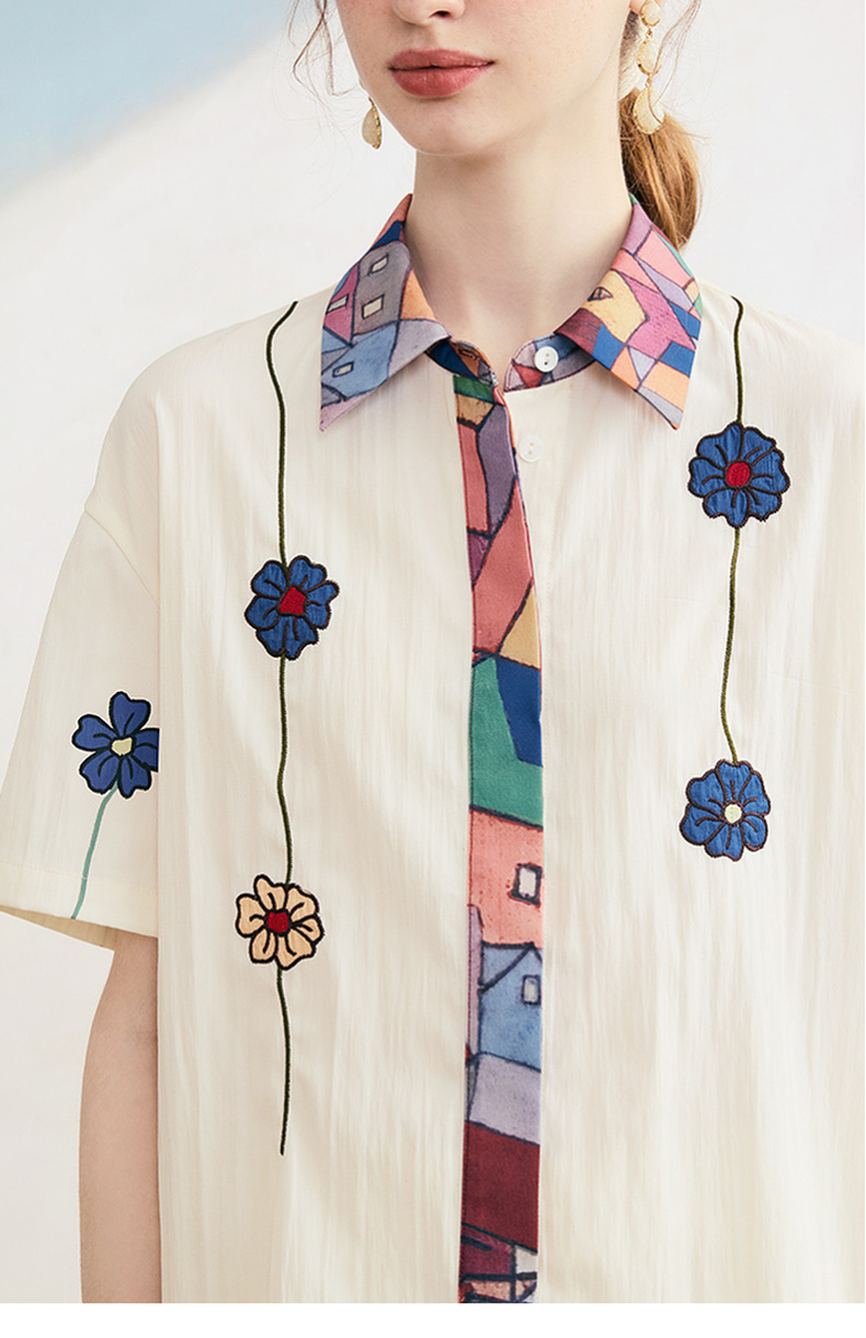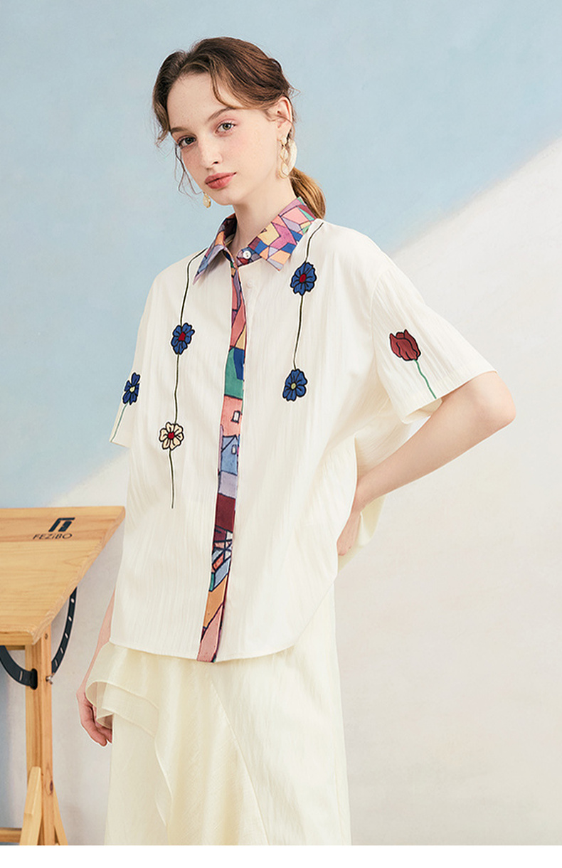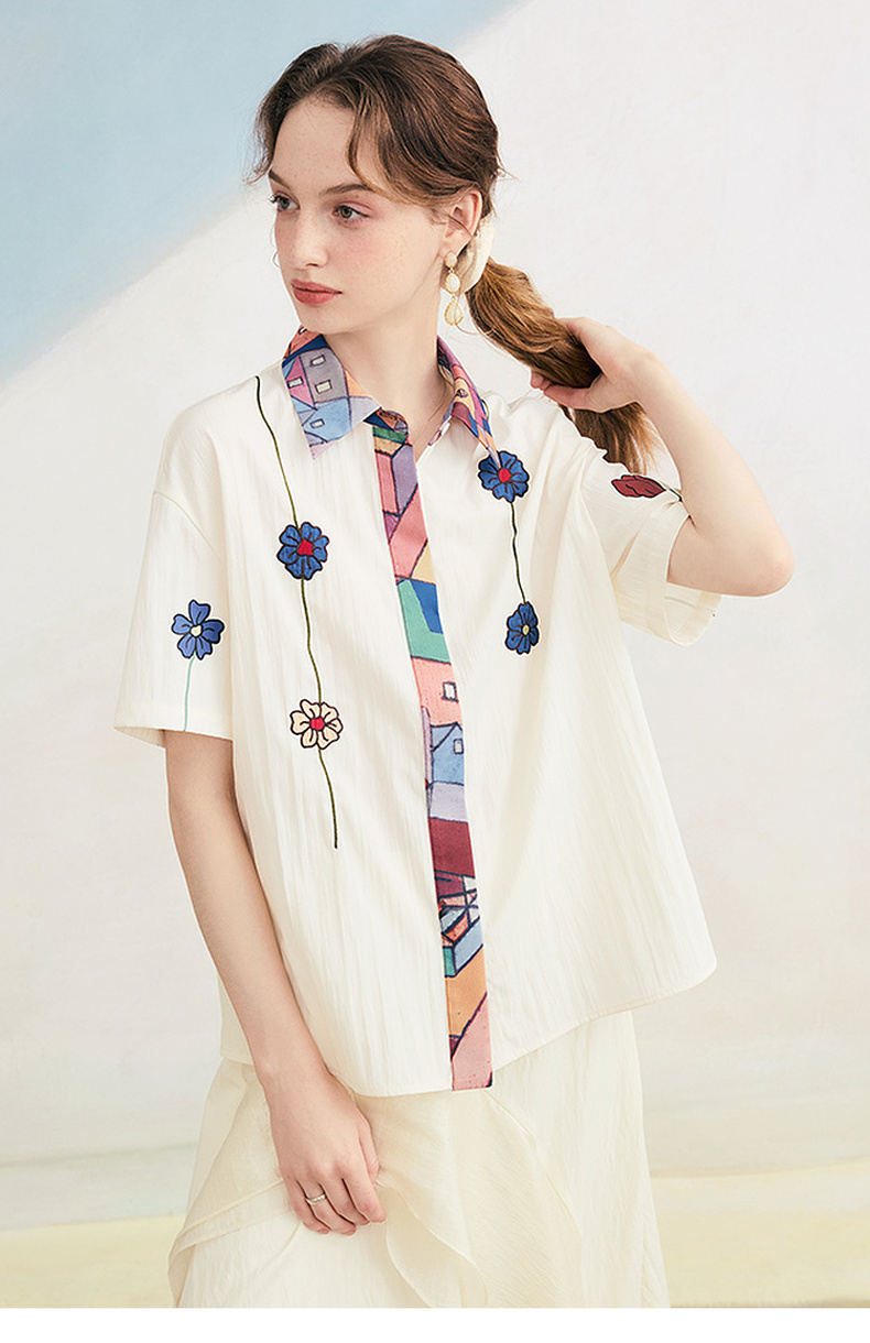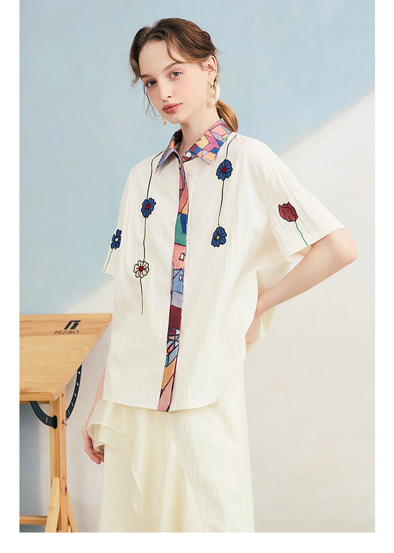 两三事 花枝蔓延 2025夏季新款文艺风印花布拼接绣花短袖衬衫女