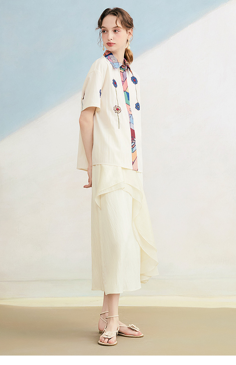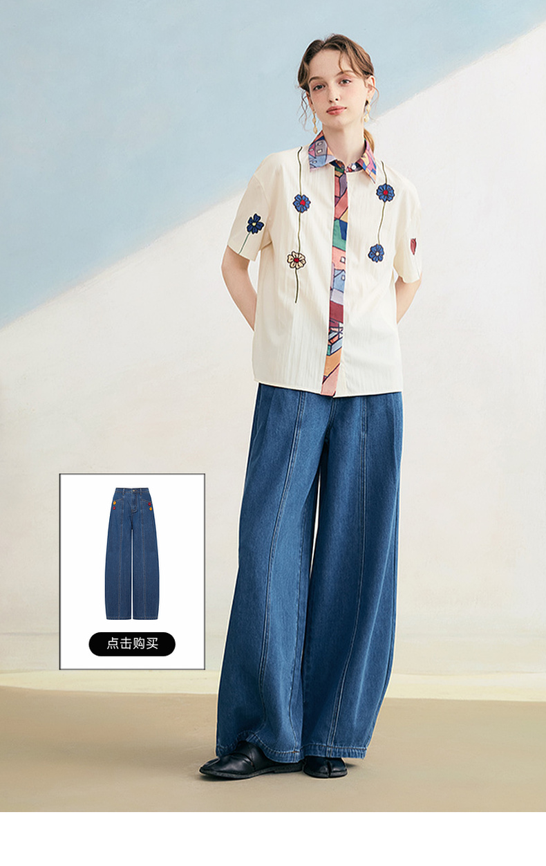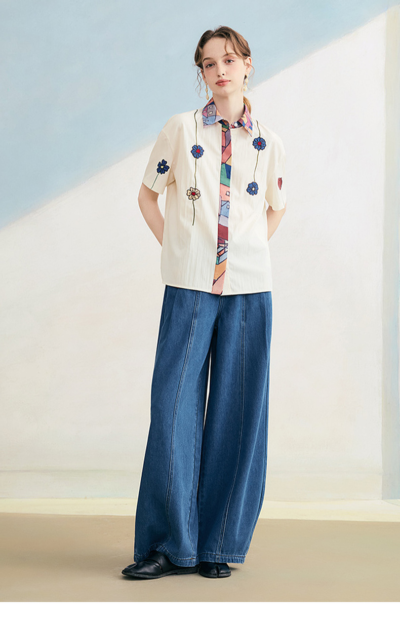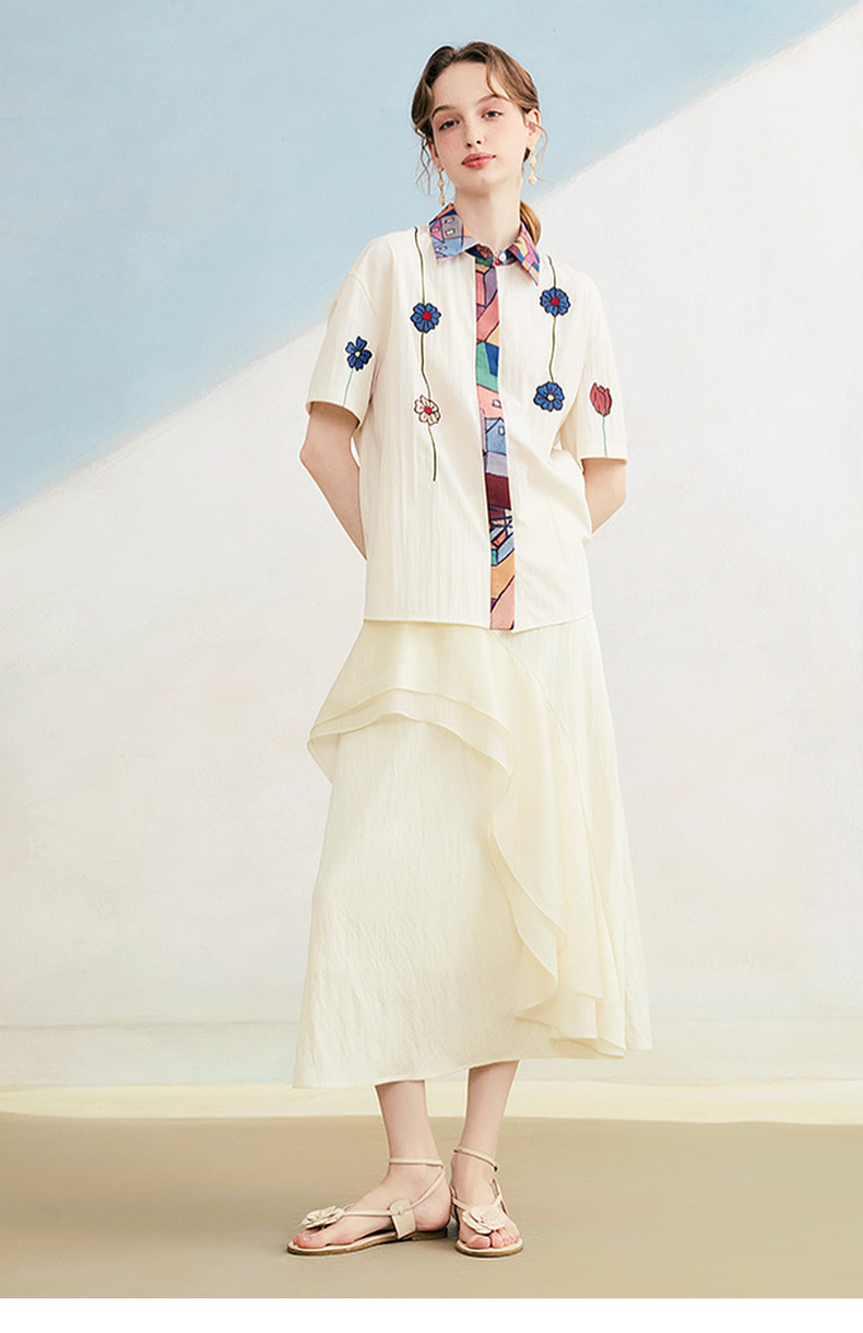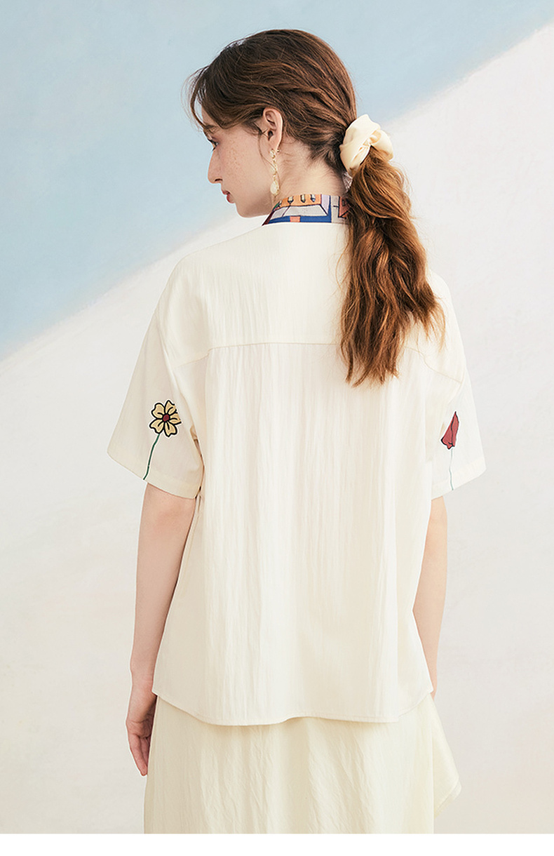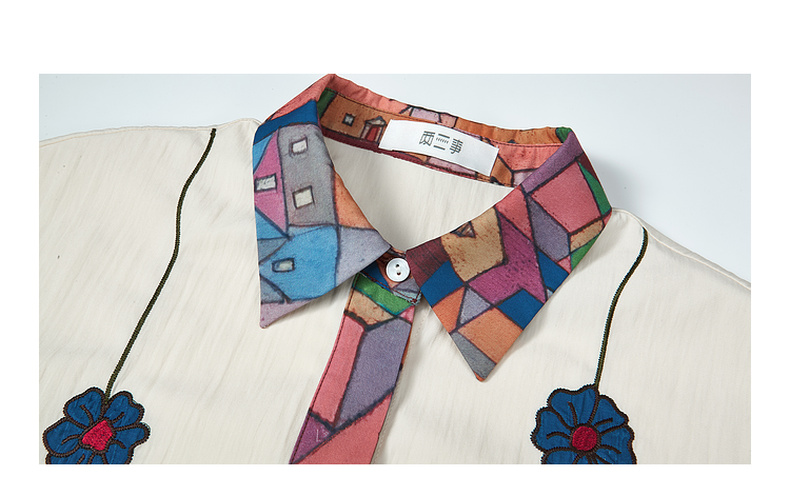 两三事 花枝蔓延 2025夏季新款文艺风印花布拼接绣花短袖衬衫女