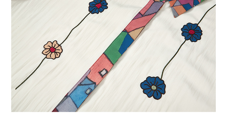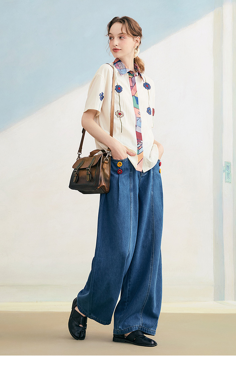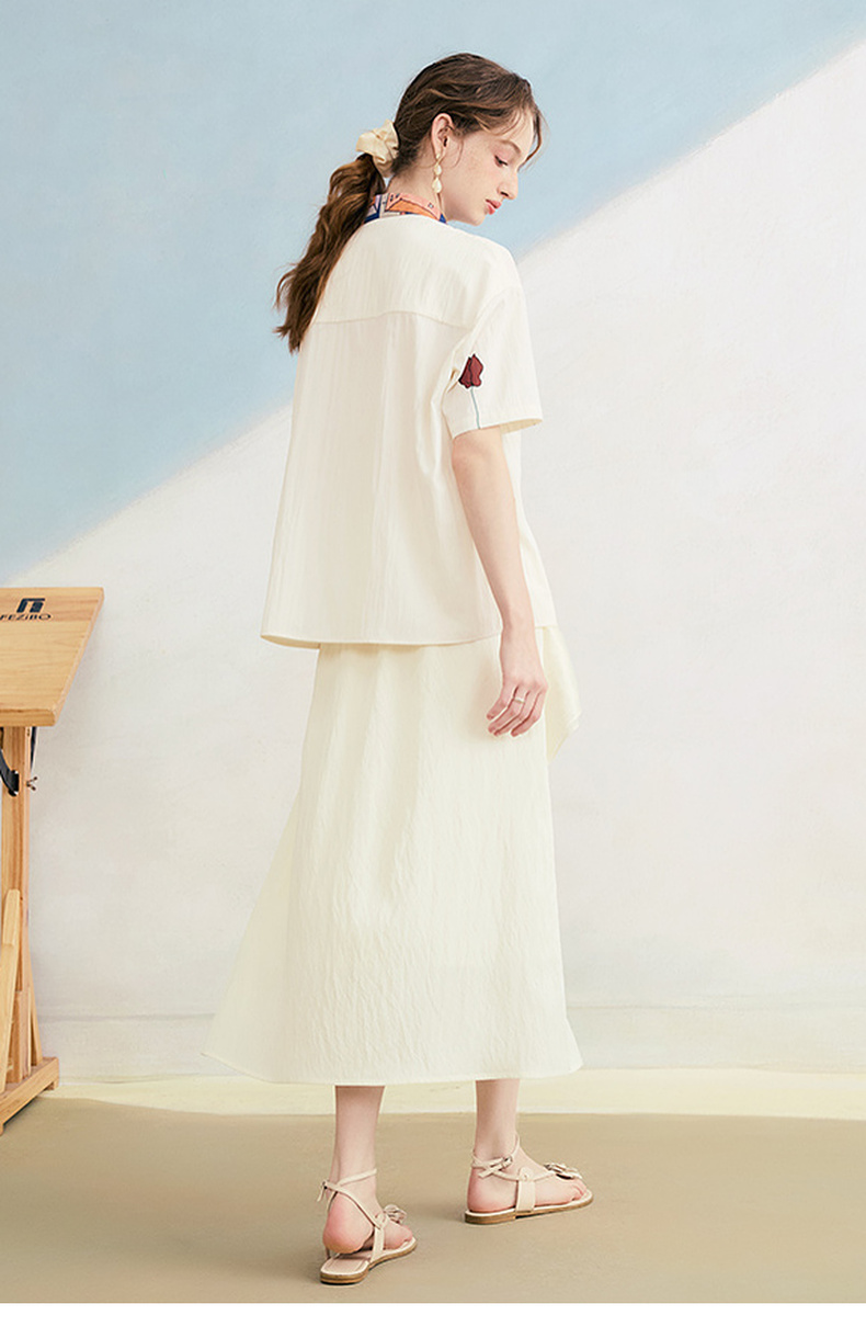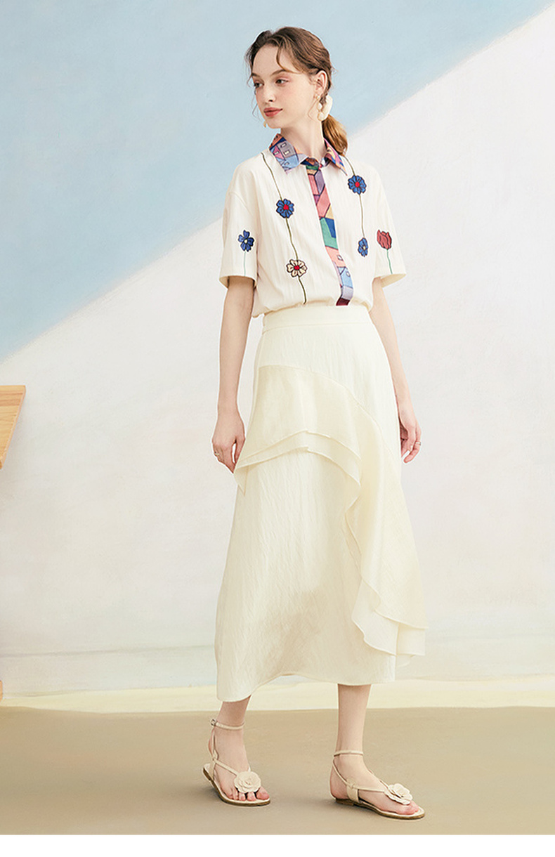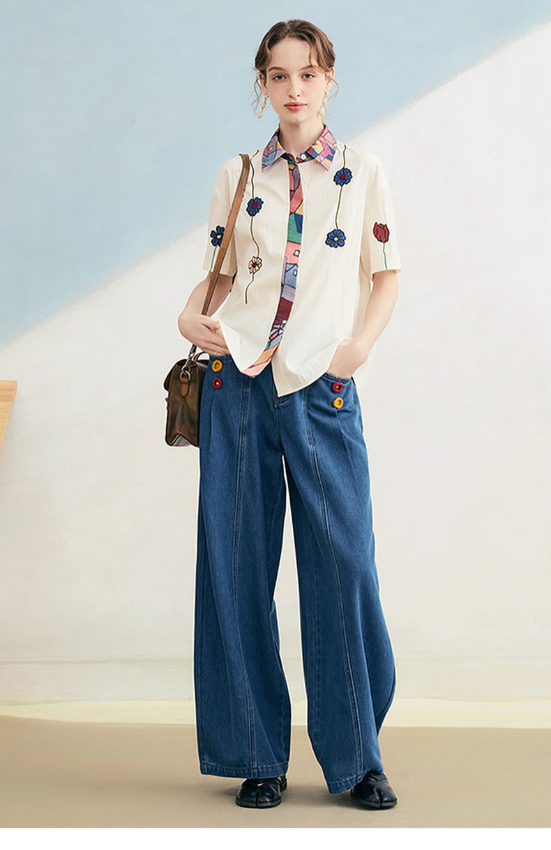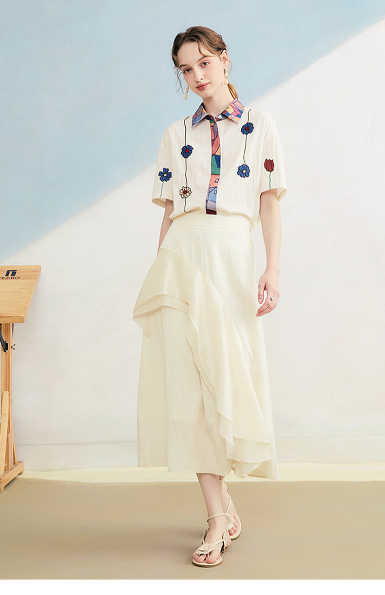 两三事 花枝蔓延 2025夏季新款文艺风印花布拼接绣花短袖衬衫女